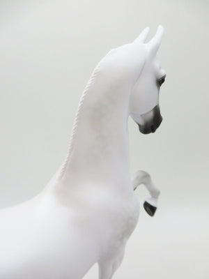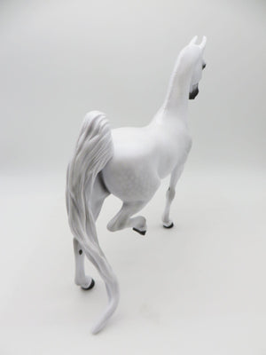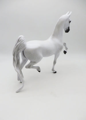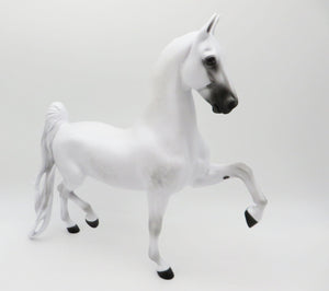 Odette, with her ethereal smooth gait strolls the Stone Factory knowing that only true love can break the spell that turns her to a swan. She is the very essence of grace, beauty and love in a gorgeous dapple grey with face shading that gives a subtle hint to her swan daytime shift on the Saddlebred mold.