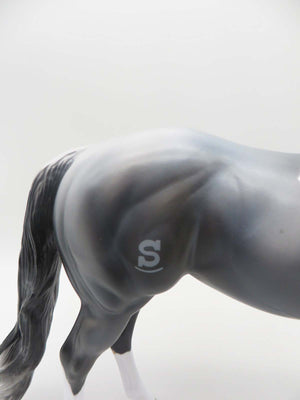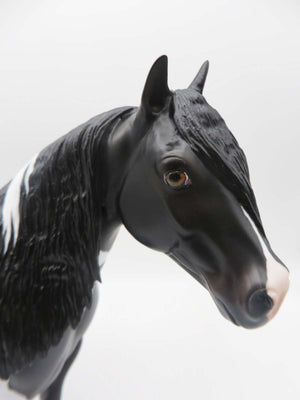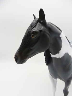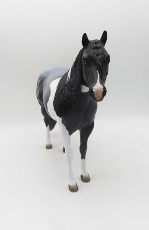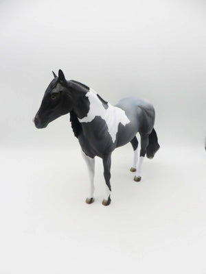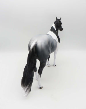 This limited-edition collectible model horse from Jess Hamill is sure to please. Crafted with meticulous attention to detail, it's gorgeous roan tobiano coloring and stunning features are sure to become the pride of any collector's display. Enjoy the classic style and expert craftsmanship of the Sidewinder Blue Roan Tobiano Custom Ideal Stock Horse.