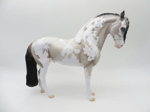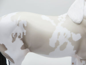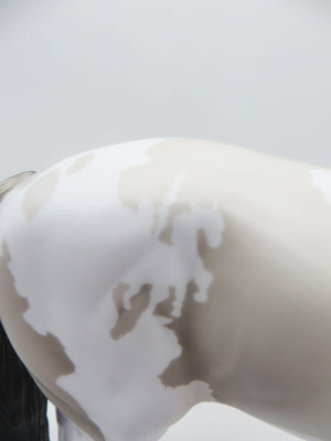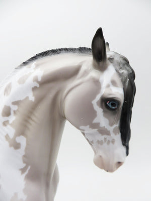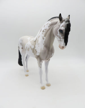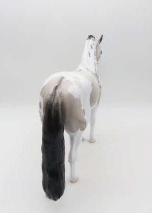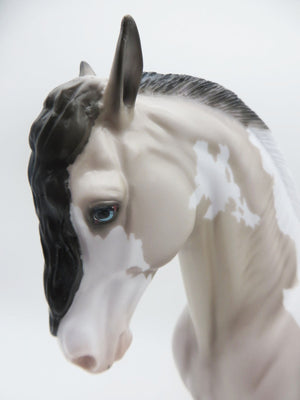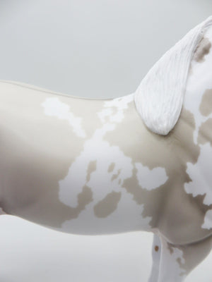 We may have just a tad of the insanity that plagued Alonso Quijano, in Miguel de Cervantes's novel Don Quixote, as we created this outrageously fun pinto-patterned Andalusian which on one side has its own gallant knight on an old nag of a steed tilting at a windmill. We fully embrace creativity and impose our reality into this Classic Lit series piece celebrating the fun, passion, and commitment to seeking adventure and dreaming the impossible dream. This gorgeous Andalusian is ready to pursue his goal, “to fight with his last ounce of courage to reach the unreachable star,” Is his unreachable star landing on your shelf?