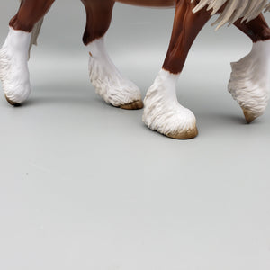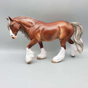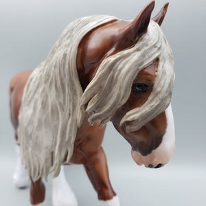 Introducing the Davey Flaxen Chestnut Irish Cob by Angela Marleau. This gorgeous model horse collectible is finely crafted to provide true-to-life details. Featuring a beautiful and realistic mane and tail, it's the perfect addition to any collection. Add this stunning piece to your shelves today!
