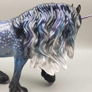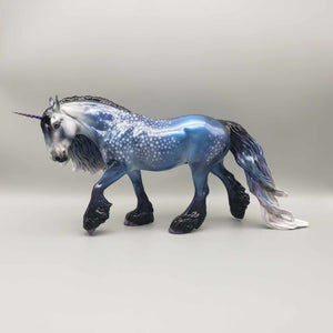 Experience the whimsical charm of the Grayson OOAK Custom Dappled Blue Purple Deco Unicorn Irish Cob By Jess Hamill. This one-of-a-kind unicorn features a playful and vibrant color scheme, adding a touch of magic to your collection. The deep, rich coloring only enhances its unique design, making it a must-have for any unicorn lover.