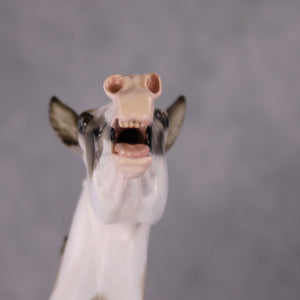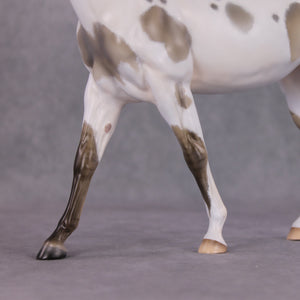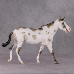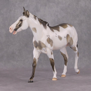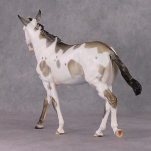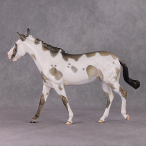 Tiffany took our large mule and went wild, creating this braying mule with her whole head re-done for accuracy. She has an individually carved teeth and tongue, and void in her mouth to really add to the realism. She is painted to a gorgeous grulla pinto with primitive markings peeking through her spots. Just a gorgeous piece!