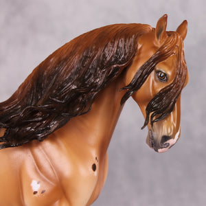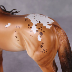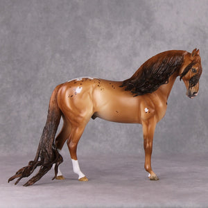 This spicy gentleman was first customized by Mona to add a tucked and turned head, and Fabio levels of volume and detail in his mane, tail, and split forelock. Ashley then finished him in the most gorgeous dappled red dun appaloosa, with etching, dun factors, leg barring, and just incredible shading and detail through the whole piece. Stunning.