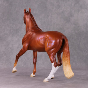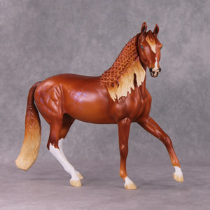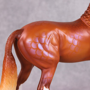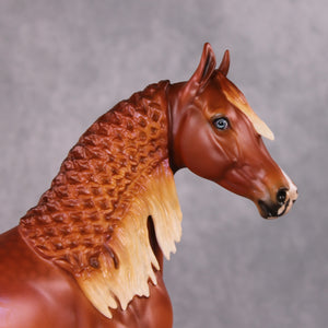 Meet Love Unspoken, the majestic Princess of The Little Mermaid! This dappled chestnut Arab mare, painted by the talented Ellen Robbins. Customized with the lattice braided mane and show tail she exudes beauty and grace. With optional scale details, she is sure to make a stunning addition to your collection.