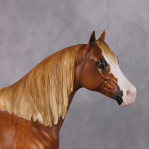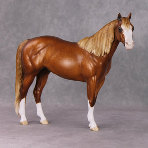 We googled "Prettiest Chestnut Quarter Horse There Ever Was", and Parson was the #1 result. You can see why - Mona gave him a classic long straight mane and tail, similar to the original ISH hair - but elevated and more detailed. Sheryl finished him in a stunning coppery dappled chestnut with a flaxen mane and tail and four white socks and a wide blaze, complete with the details she is known for!