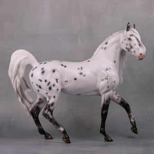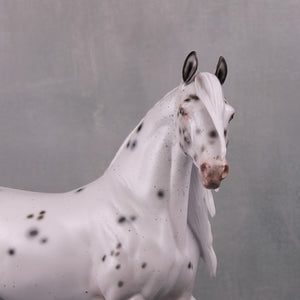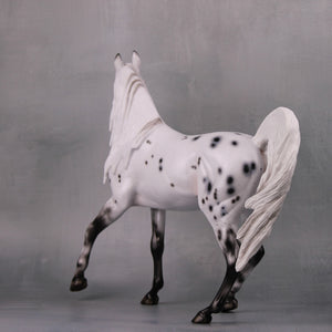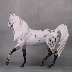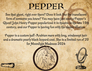 See that ghost, right over there? Does it look like the translucent form of someone you know? You may have just seen a Pepper’s Ghost! John Henry Pepper popularized it in theatre in the late 19th century, and our Pepper is having fun with the classic illusion. Pepper is a custom half-Arabian mare with long, windswept hair and a dramatic pearly black leopard coat. She is a limited run of 20 for Moonlight Madness 2024