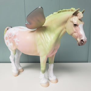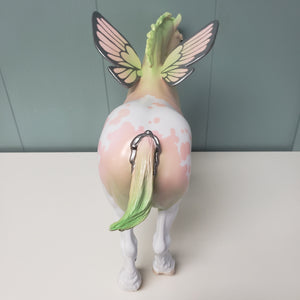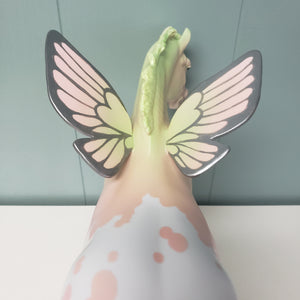 Sidhe - LE-25 A soft and sweet adorable fairy bunny! Soft Pastels with silver accents in the wings and her tail bow this sweet girl is all a flutter to call your shelves home! Painted by Jess Hamill
