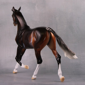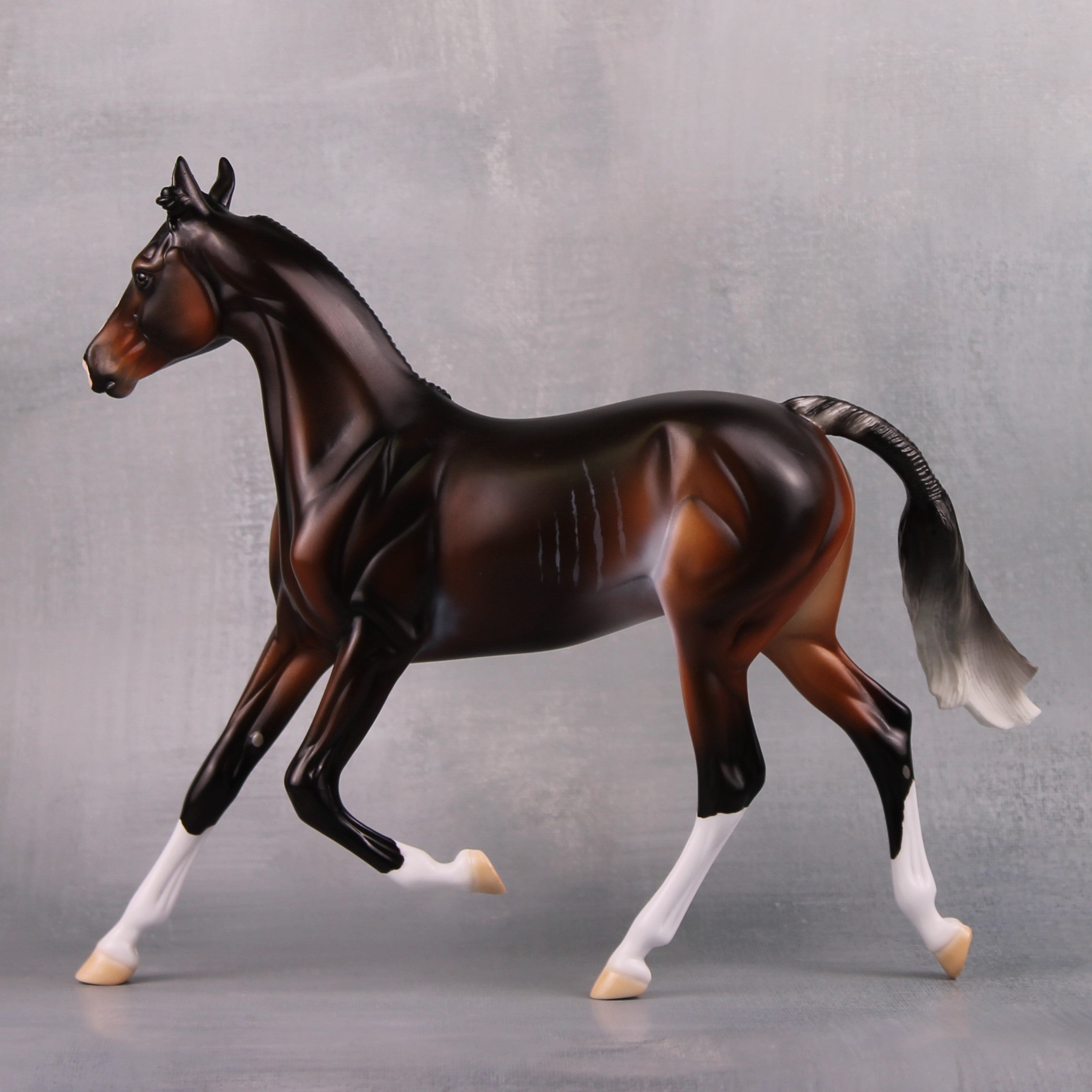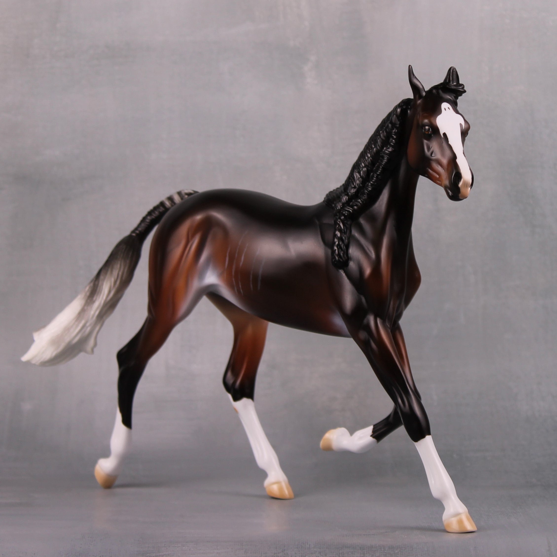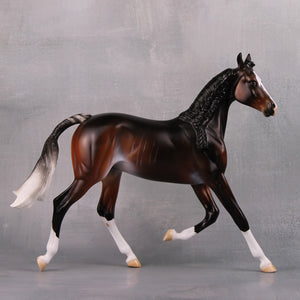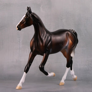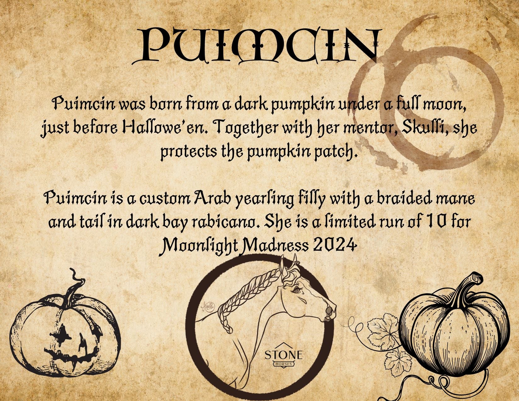 Puimcin was born from a dark pumpkin under a full moon, just before Hallowe’en. Together with her mentor, Skulli, she protects the pumpkin patch. Puimcin is a custom Arab yearling filly with a braided mane and tail in dark bay rabicano. She is a limited run of 10 for Moonlight Madness 2024
