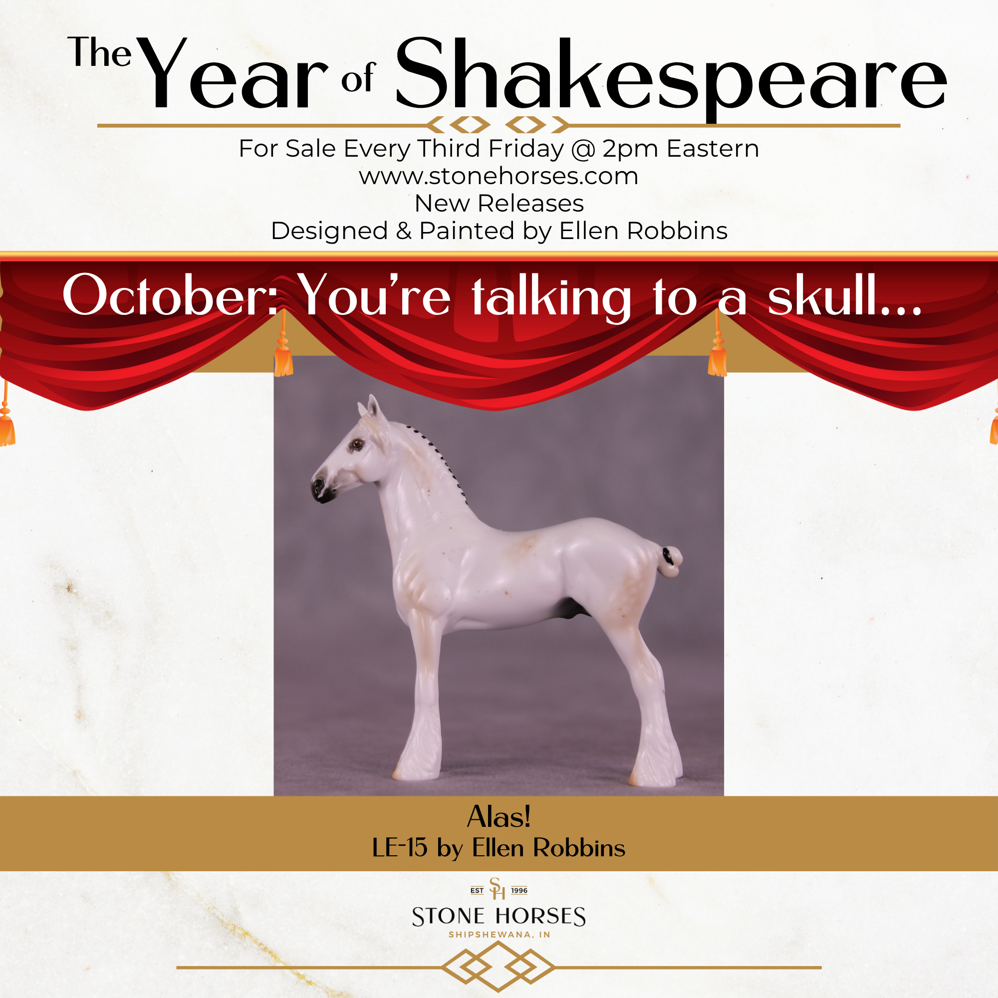 For October’s Classic Literature offering, we continue our Year of Shakespeare with the tale of Hamlet. Designed and painted by Ellen Robbins, she describes the ties to the story these models display much better than we can, and as always, we encourage you to read the materials in this listing images.