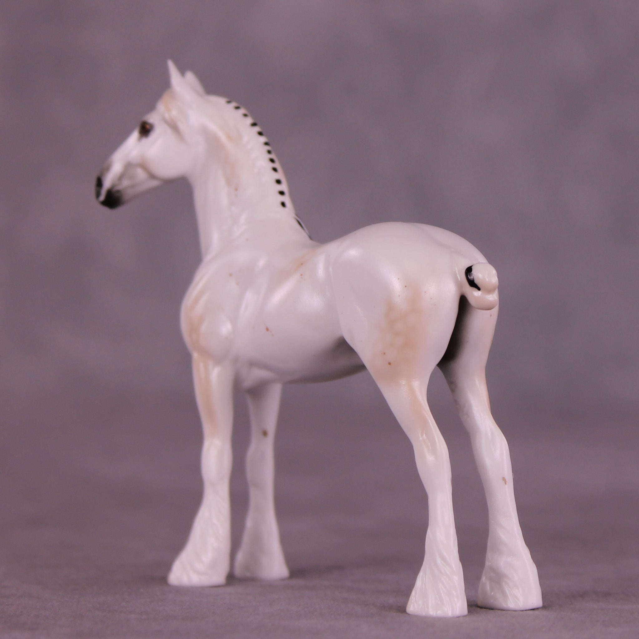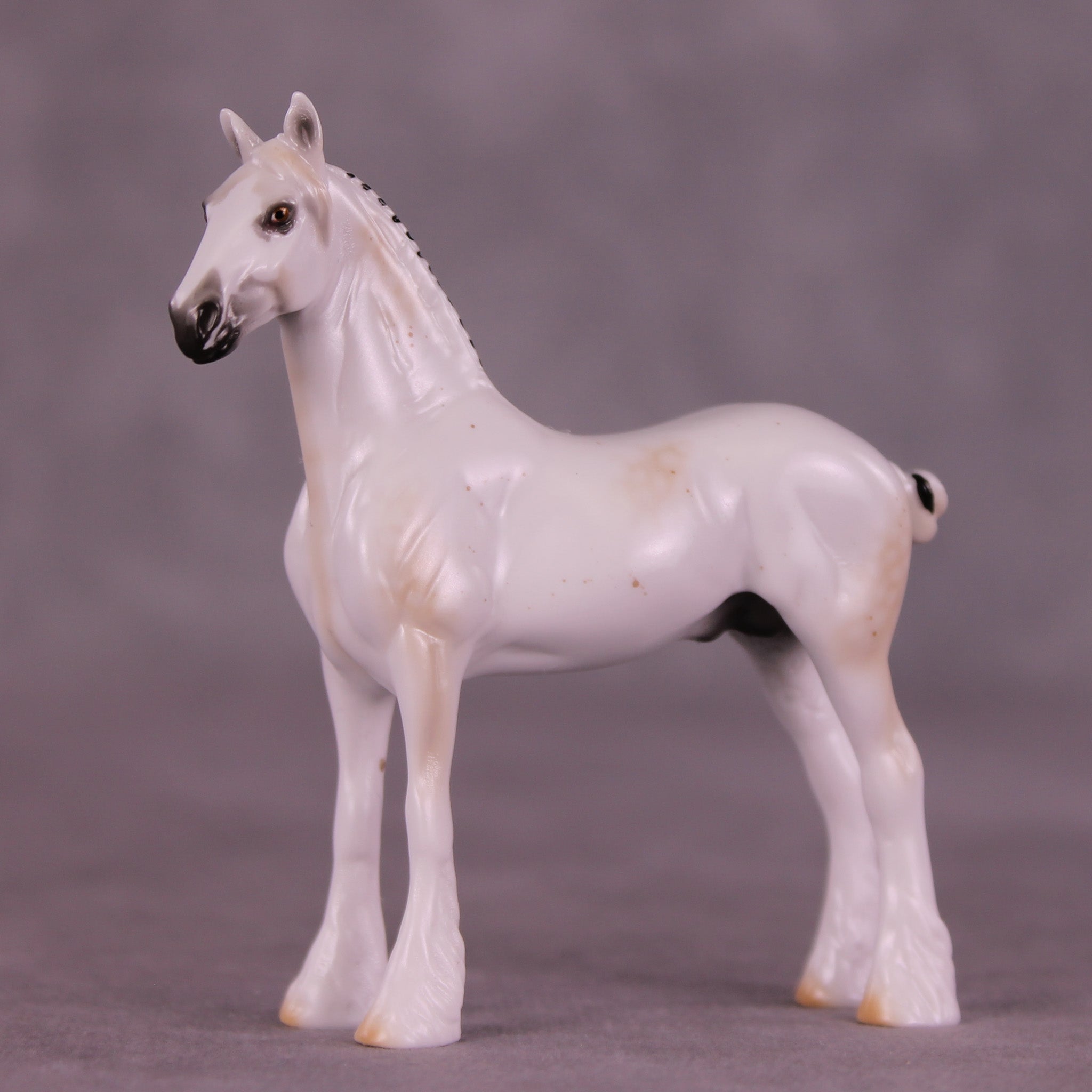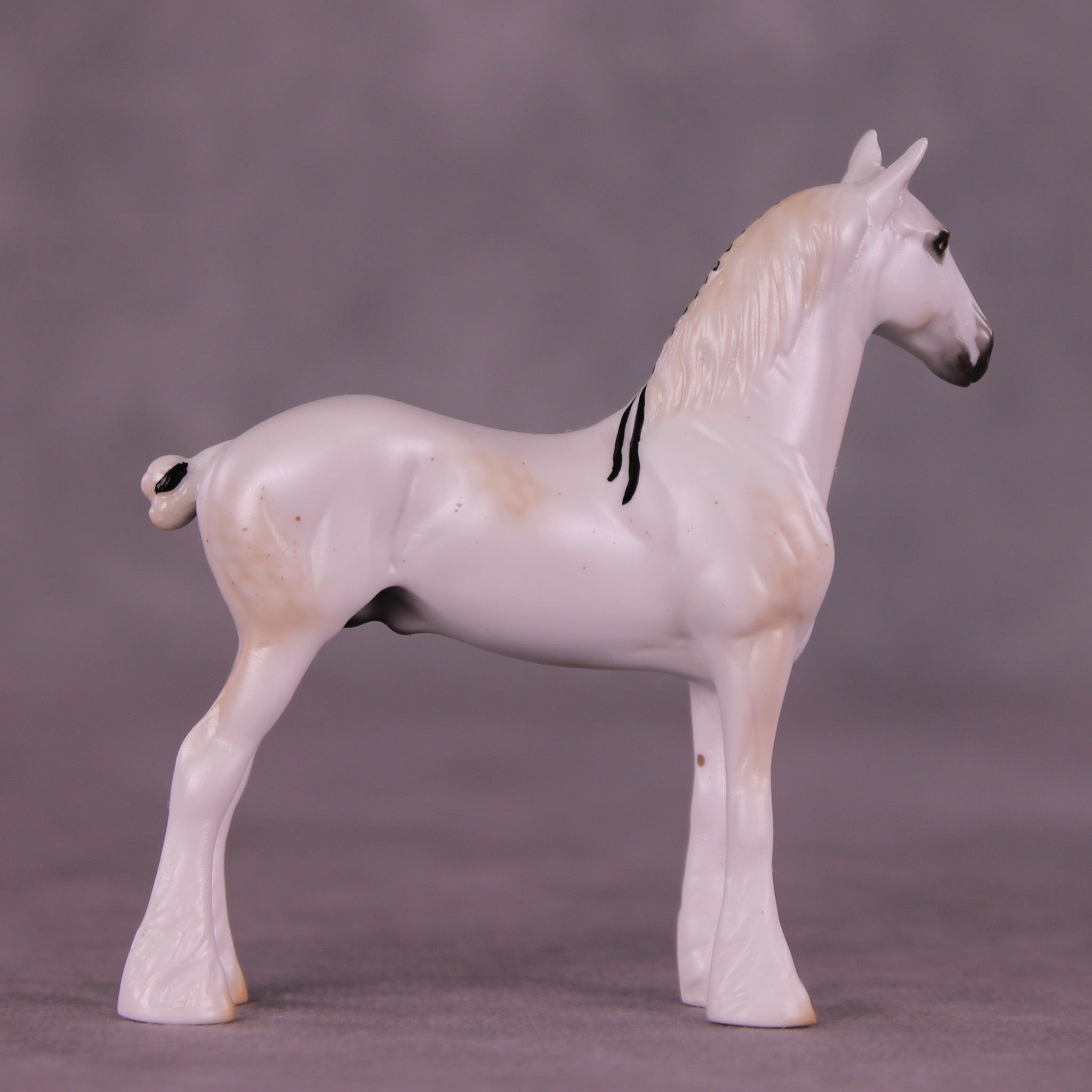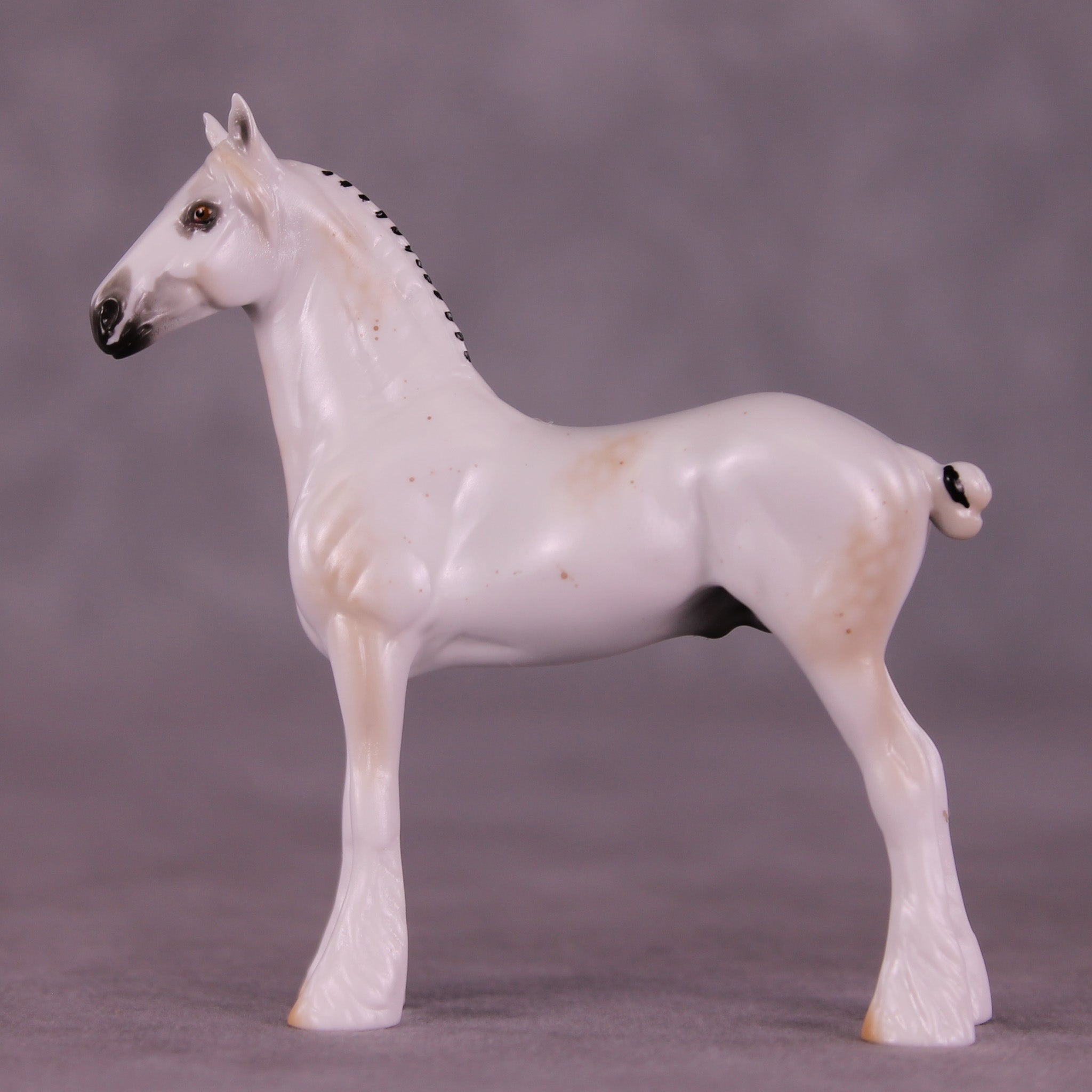 Alas! Is a ghostly mulberry dappled grey with black ribbons, with matching realistic wide face marking that resembles a skull if you look carefully.