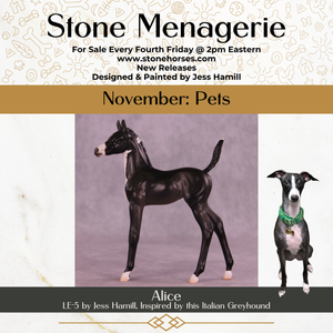 Here we have Ruth and Alice! Some of you may recognize them – these are modeled after Erin’s Italian Greyhounds, marking for marking, perfectly re-imagined as minimal pinto Arabian foals. Because really, the differences between an Arabian Foal and an Italian Greyhound are negligible. These girls are both runs of 5 pieces each and available in all finish options, ready to ship now.