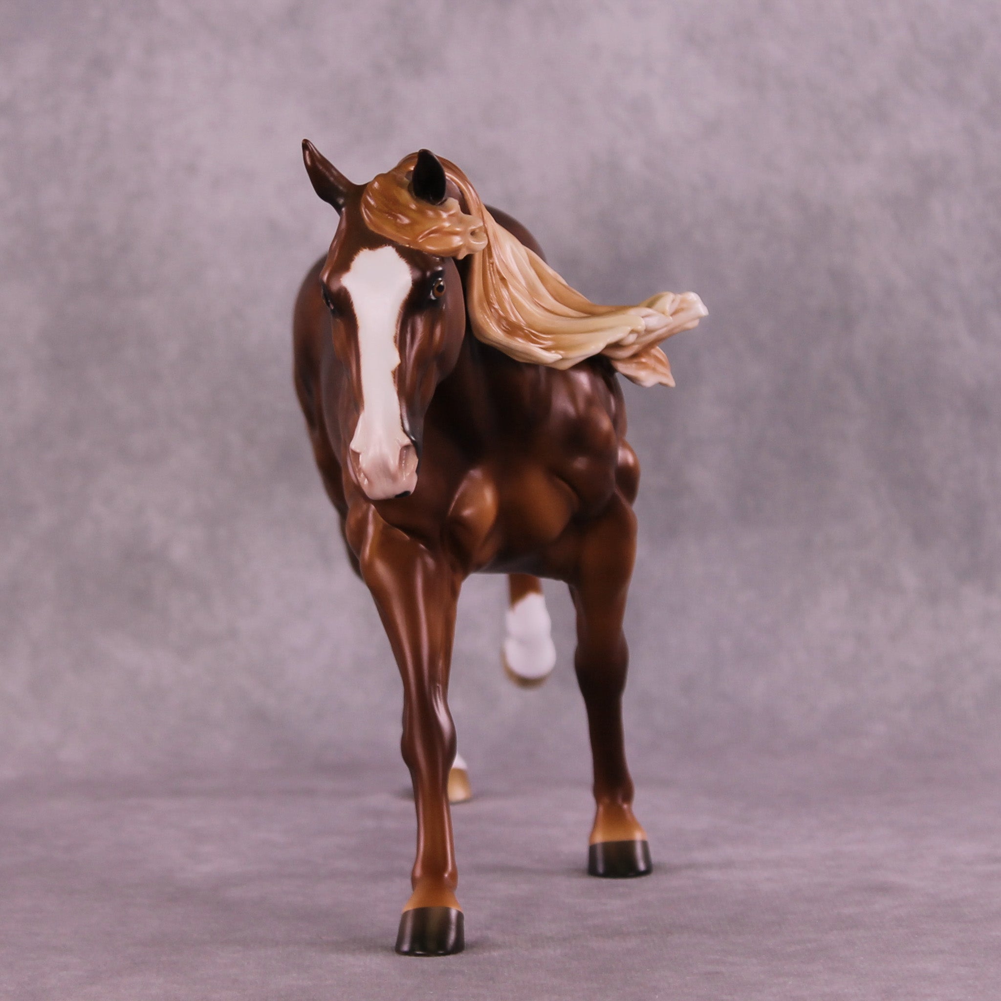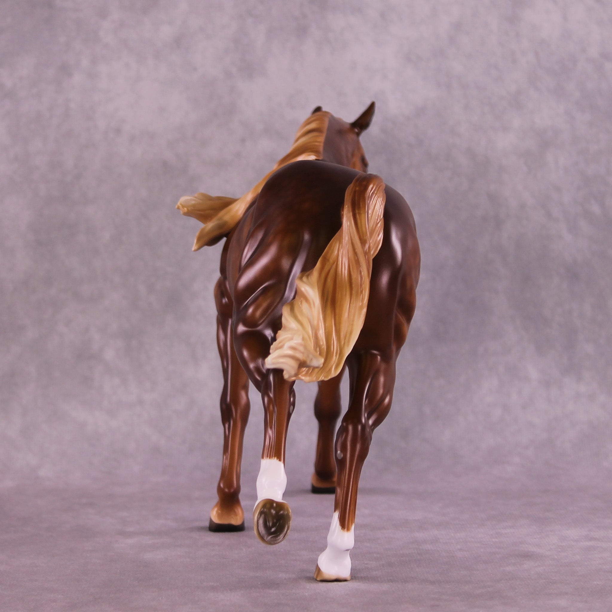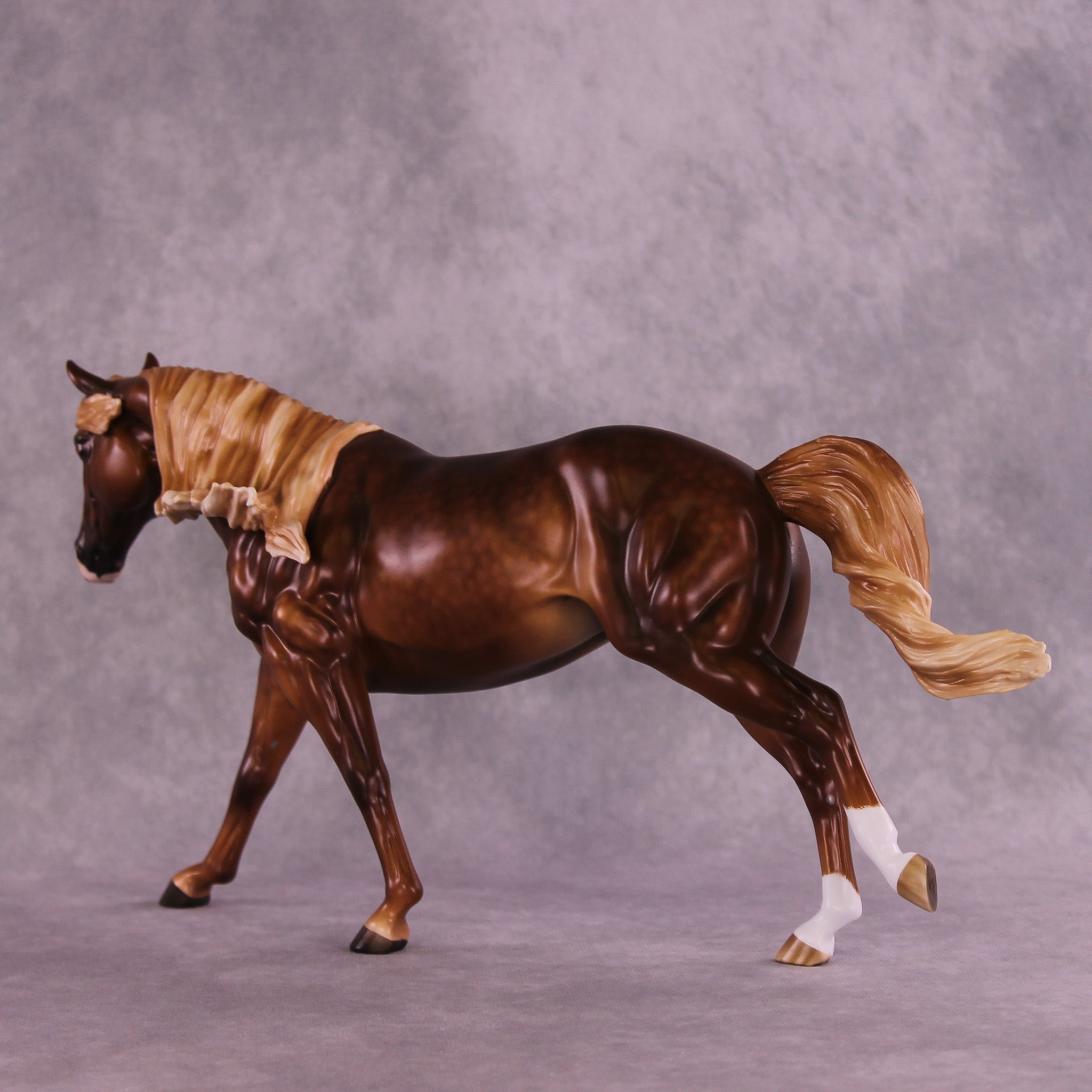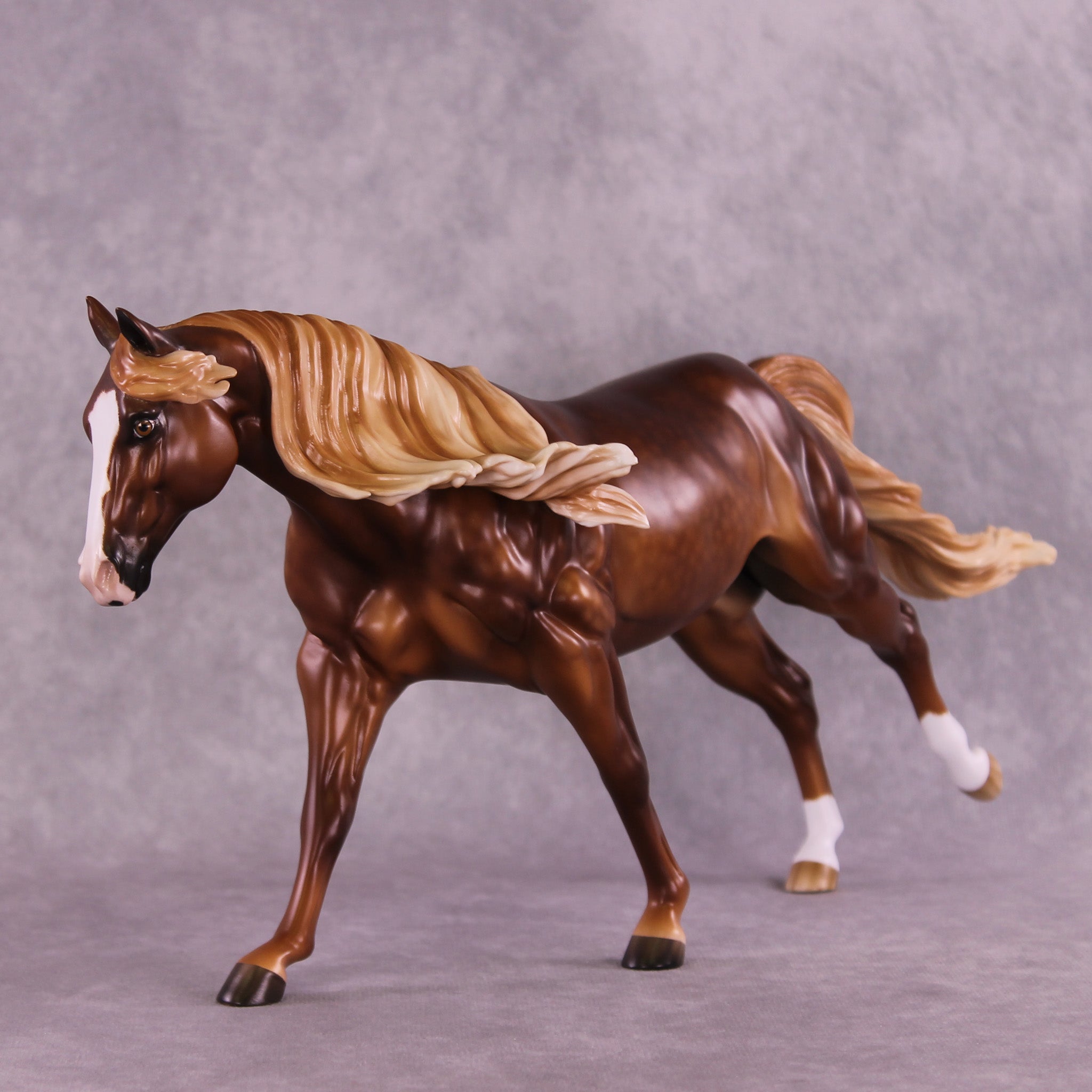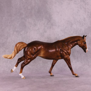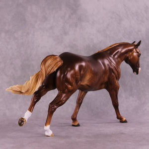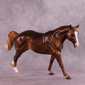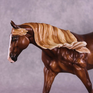 Ambre is another breathtaking piece by the incomparable Sheryl Leisure. She gave this Remington a rich chestnut coat with soft dapples and a dimensional flaxen mane and tail. Etched face markings, socks, and kissy spots add personality and flair. Matt Samuels added motion and life with a twisty, windswept tail. This piece is at auction from 6 pm on August 26th through the afternoon of Tuesday September 2nd. Additional finish options are available on this model.