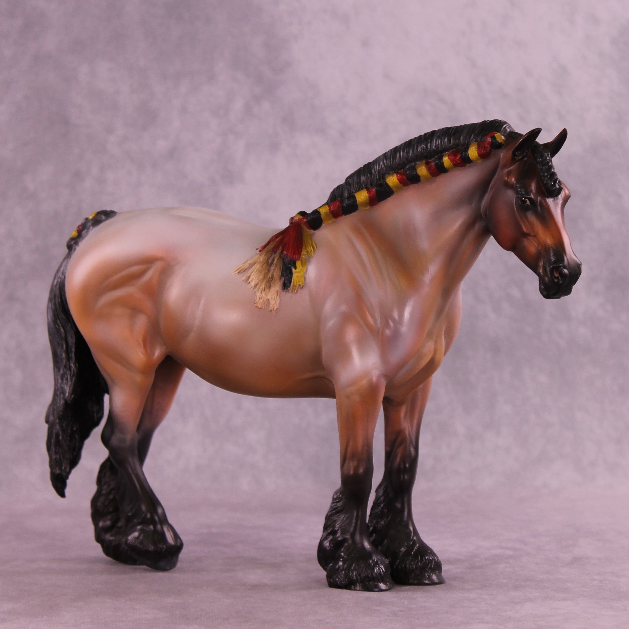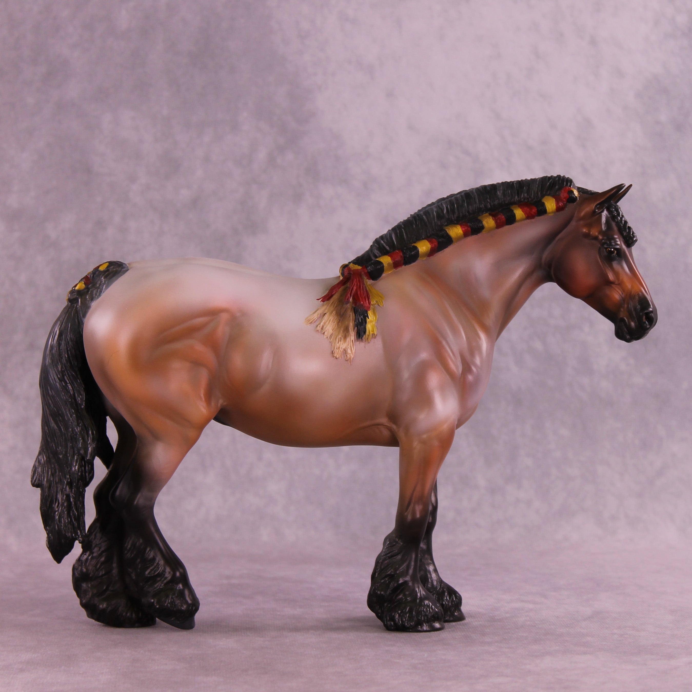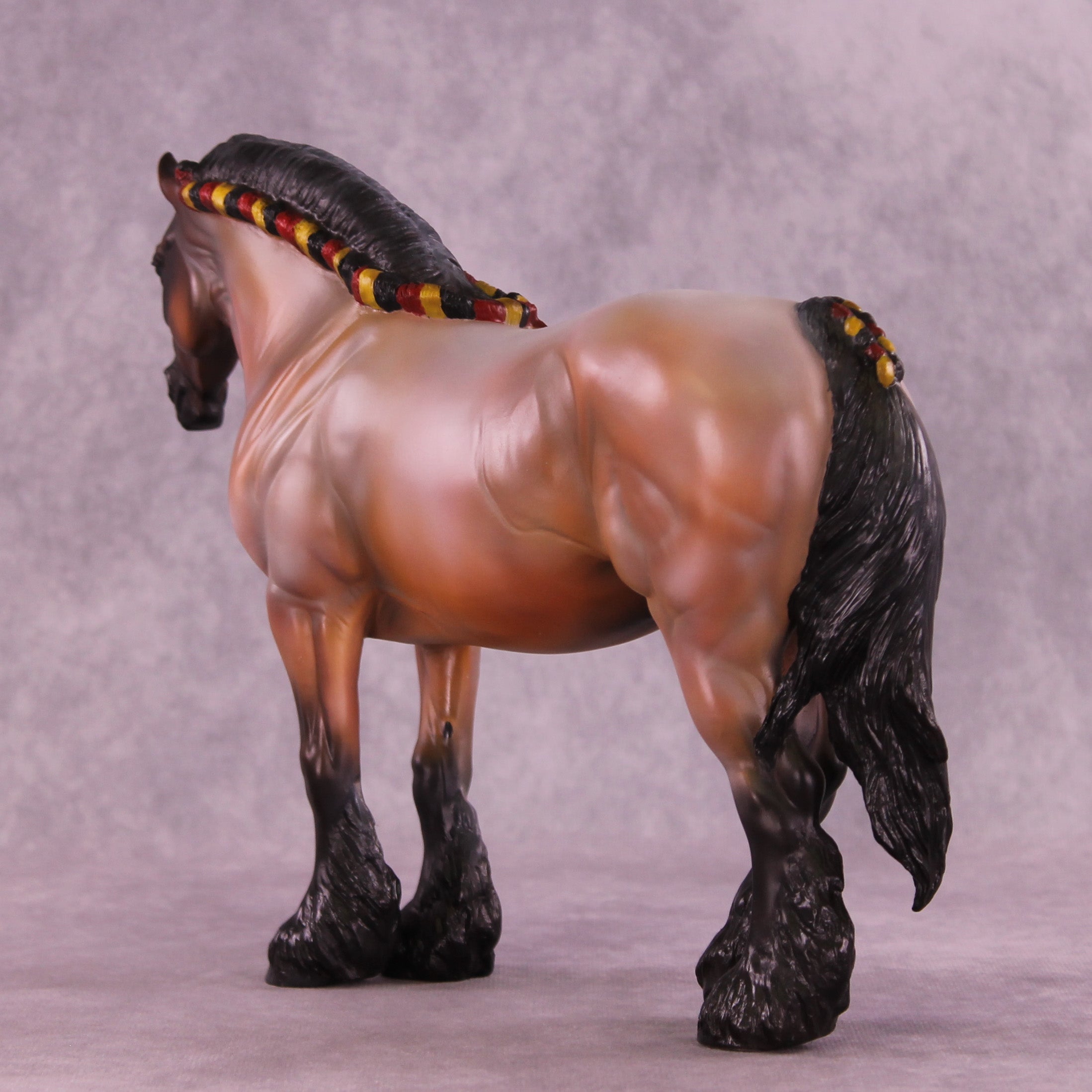 Kristen began with our Bunny mold on this piece, and transformed her into a stunning European Belgian. She has had heavy feather added, a whole new customized rolled mane with traditional raffia rolled in with ribbons in the Belgian Flag colors on both sides of her neck, a braided forelock, a whole new customized tail, and extra defined facial detailing. Kristen painted her to a stunning bay roan with frosting in her mane and tail, of course! She comes in a lovely matte finish and no finish changes are offered on this piece.