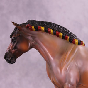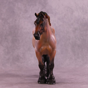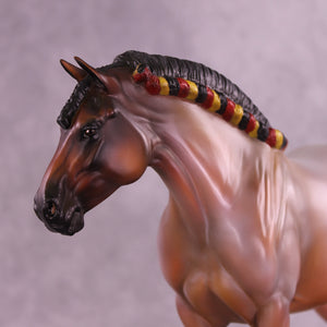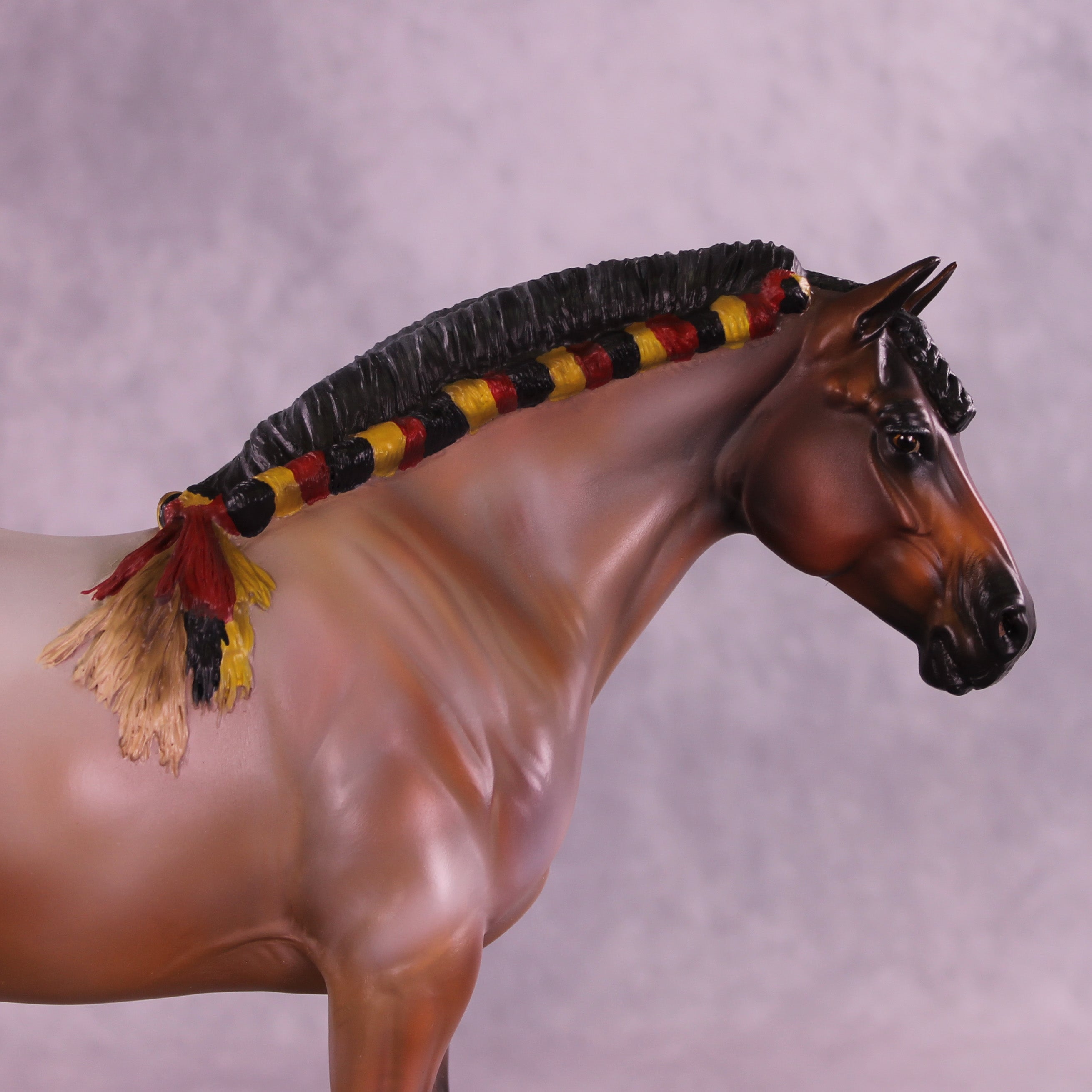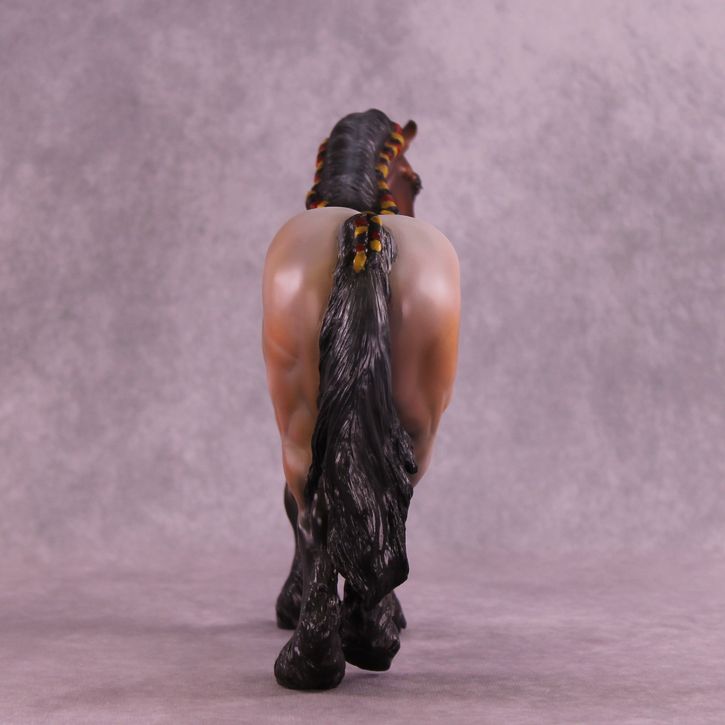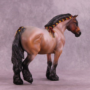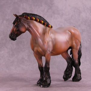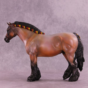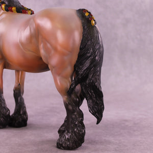 Kristen began with our Bunny mold on this piece, and transformed her into a stunning European Belgian. She has had heavy feather added, a whole new customized rolled mane with traditional raffia rolled in with ribbons in the Belgian Flag colors on both sides of her neck, a braided forelock, a whole new customized tail, and extra defined facial detailing. Kristen painted her to a stunning bay roan with frosting in her mane and tail, of course! She comes in a lovely matte finish and no finish changes are offered on this piece.