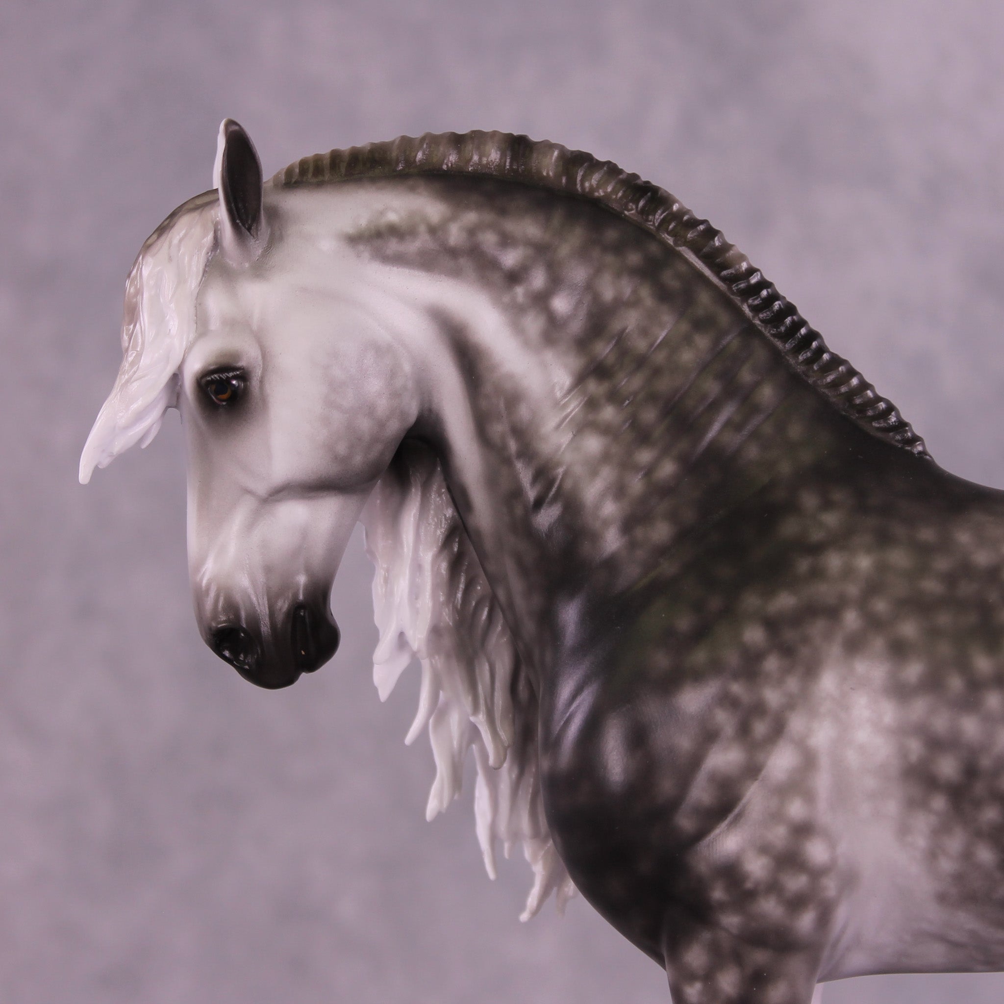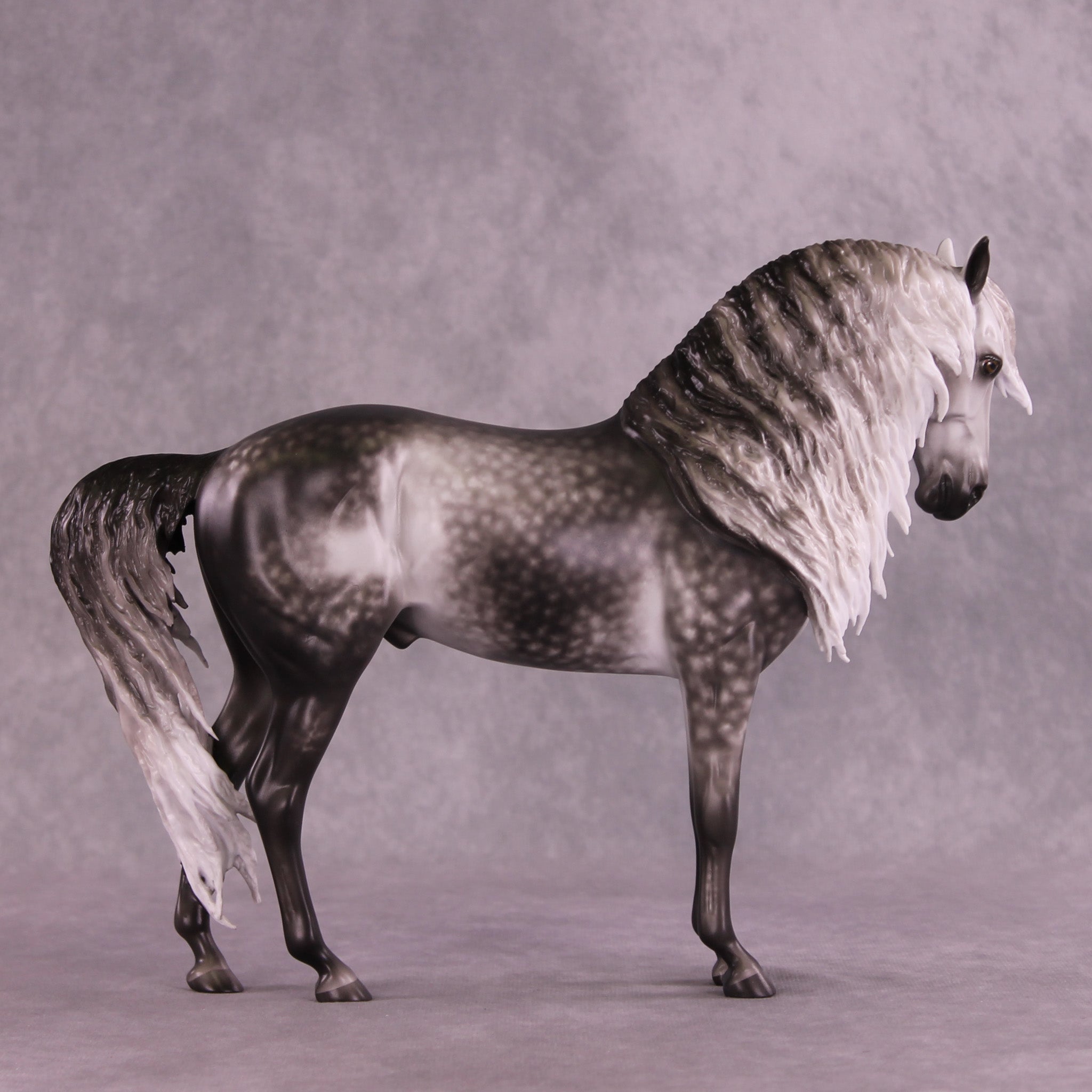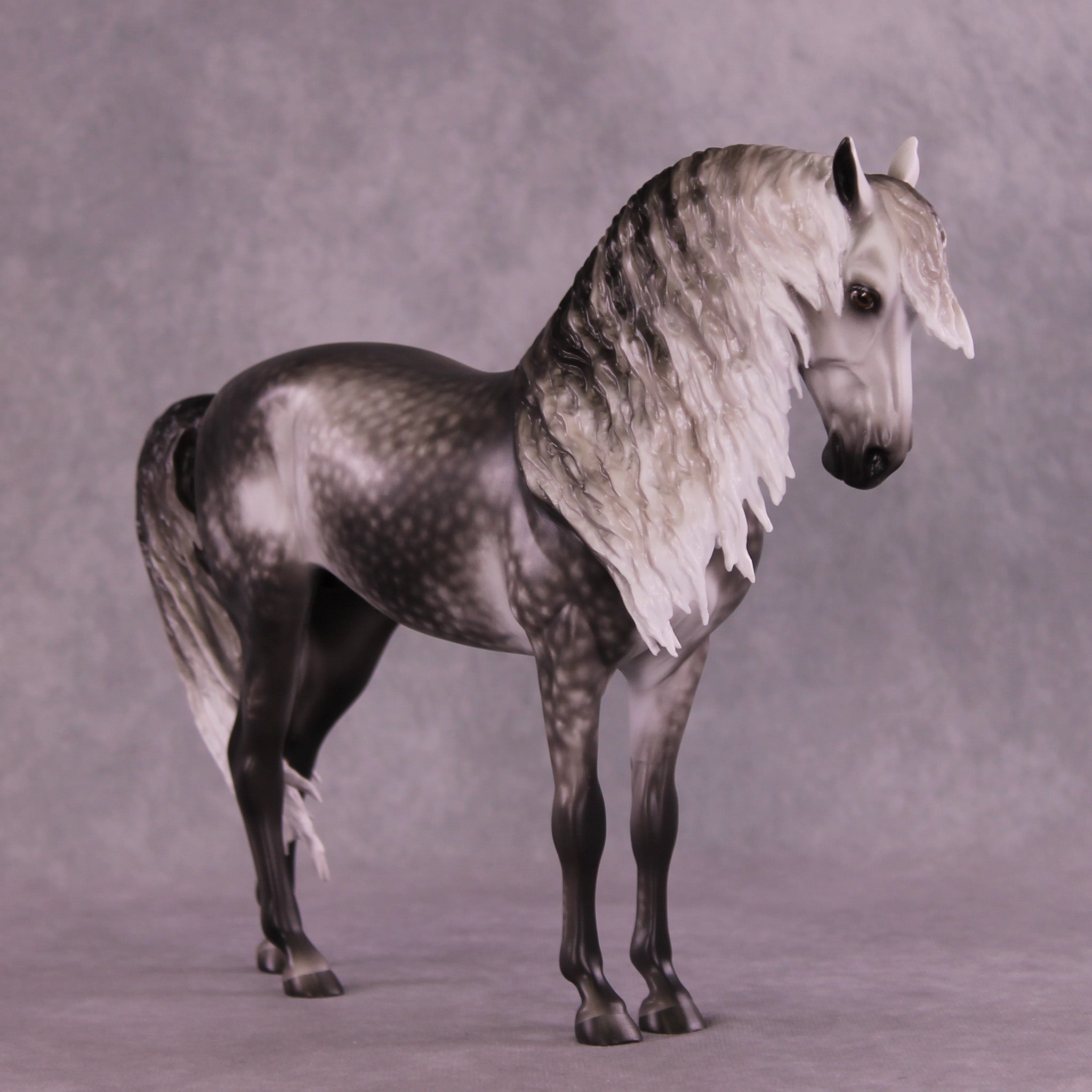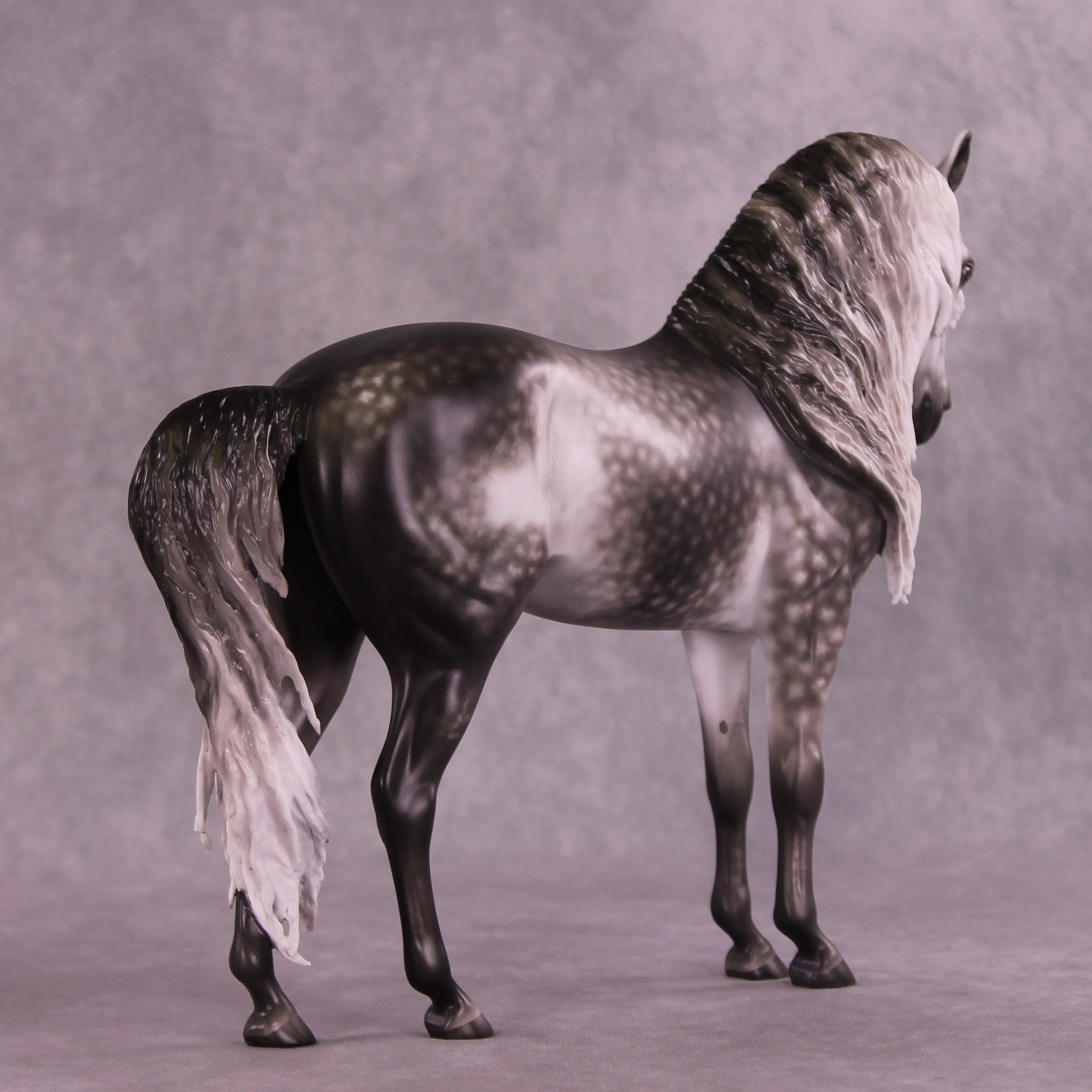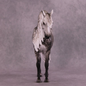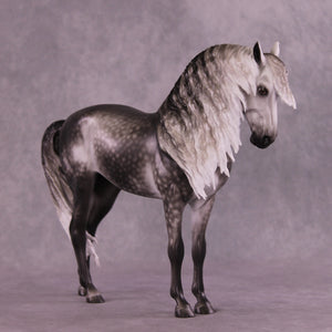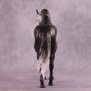 Arthur begins with our Andalusian sculpture, and Mel gave him a gentle head tuck and slight turn, and then loads of extra detailing in his long wavy mane, tail, and forelock. A soft breeze is blowing his hair forward, adding tons of visual interest to this already stunning piece. Sheryl finished him to a gorgeously dark dapple grey with even more refinement added through his face and ears. No detail is missed on this lovely piece!