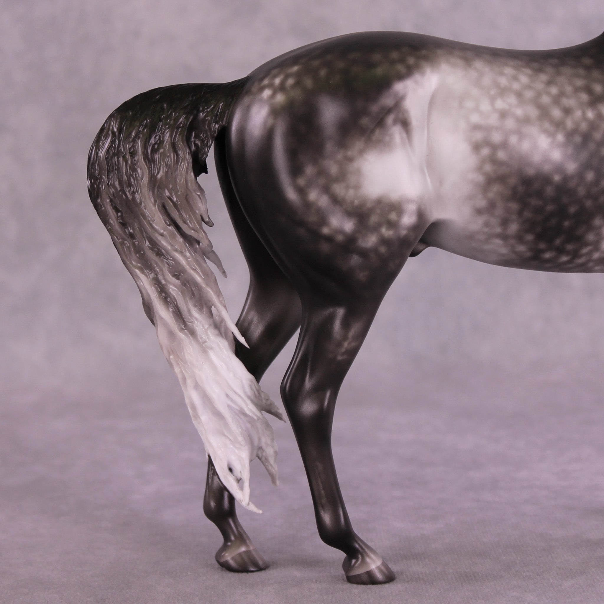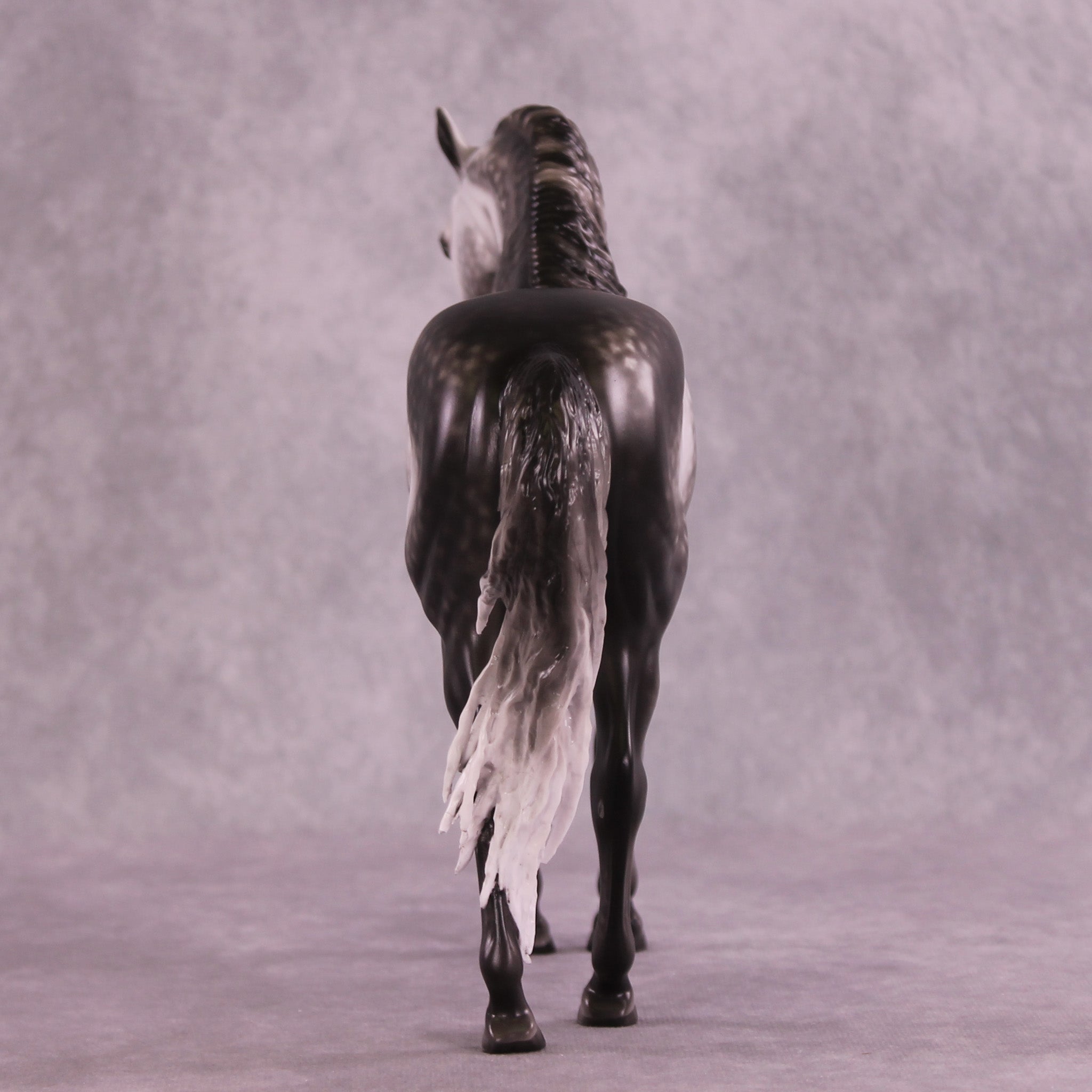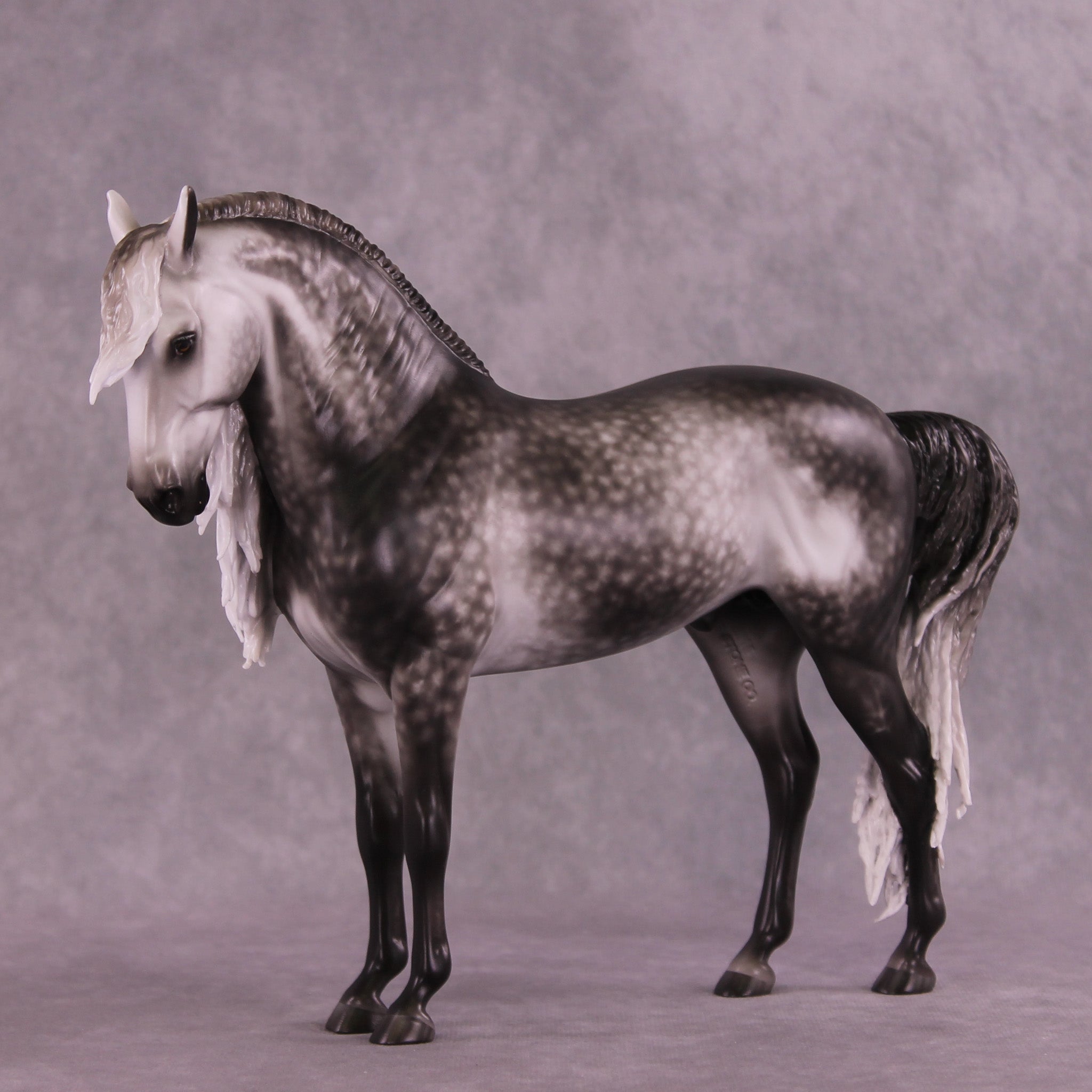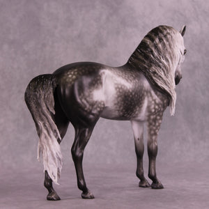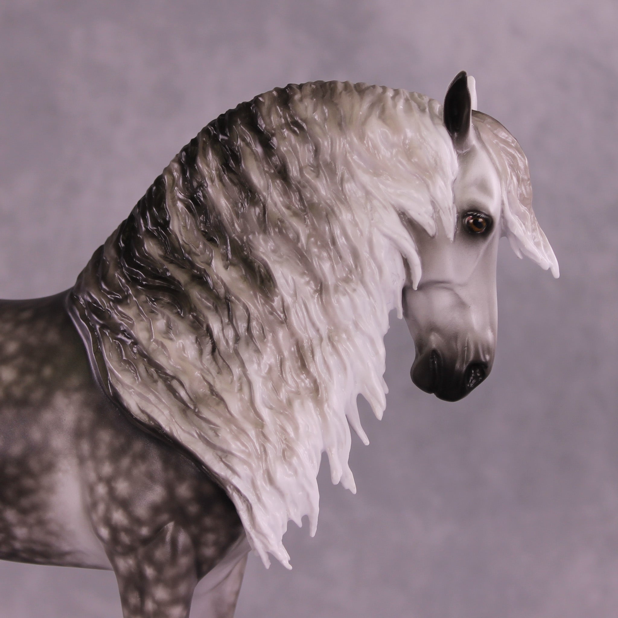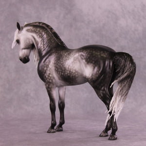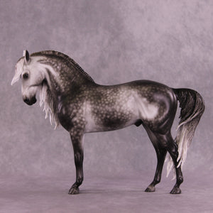 Arthur begins with our Andalusian sculpture, and Mel gave him a gentle head tuck and slight turn, and then loads of extra detailing in his long wavy mane, tail, and forelock. A soft breeze is blowing his hair forward, adding tons of visual interest to this already stunning piece. Sheryl finished him to a gorgeously dark dapple grey with even more refinement added through his face and ears. No detail is missed on this lovely piece!