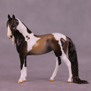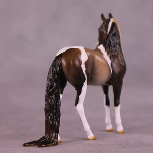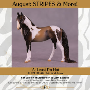 At Least I’m Hot – and she certainly is. This is our beloved chip Andalusian mold with a few BIG changes by Melanie Miller! Mel first customized her to a mare - all the models in this collection are mares at Tegan’s request to celebrate and honor her transition as a transgender woman! She then got a dramatic head turn and tuck, resculpted new longer mane with crinkle texture, extra long puddle tail with matching crinkle texture, and facial detailing added. Tegan then painted her to a stunning dark grulla tobiano with TONS of dramatic shading and etched detailing. This mare is ready to win. Finish changes are not available on this piece.