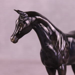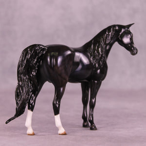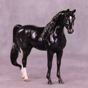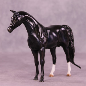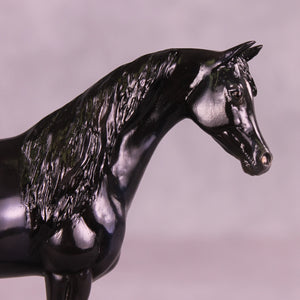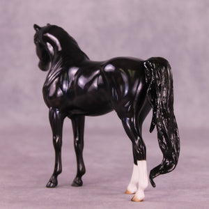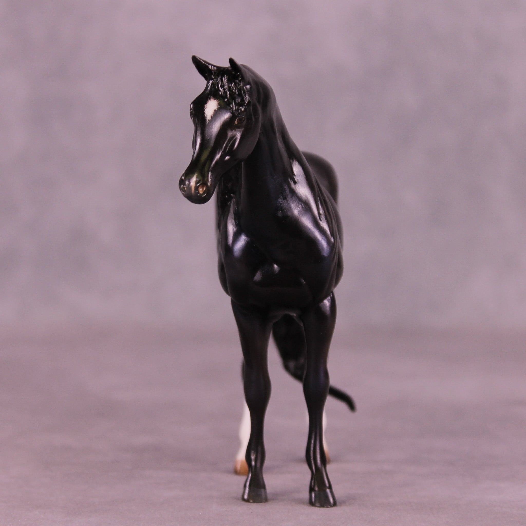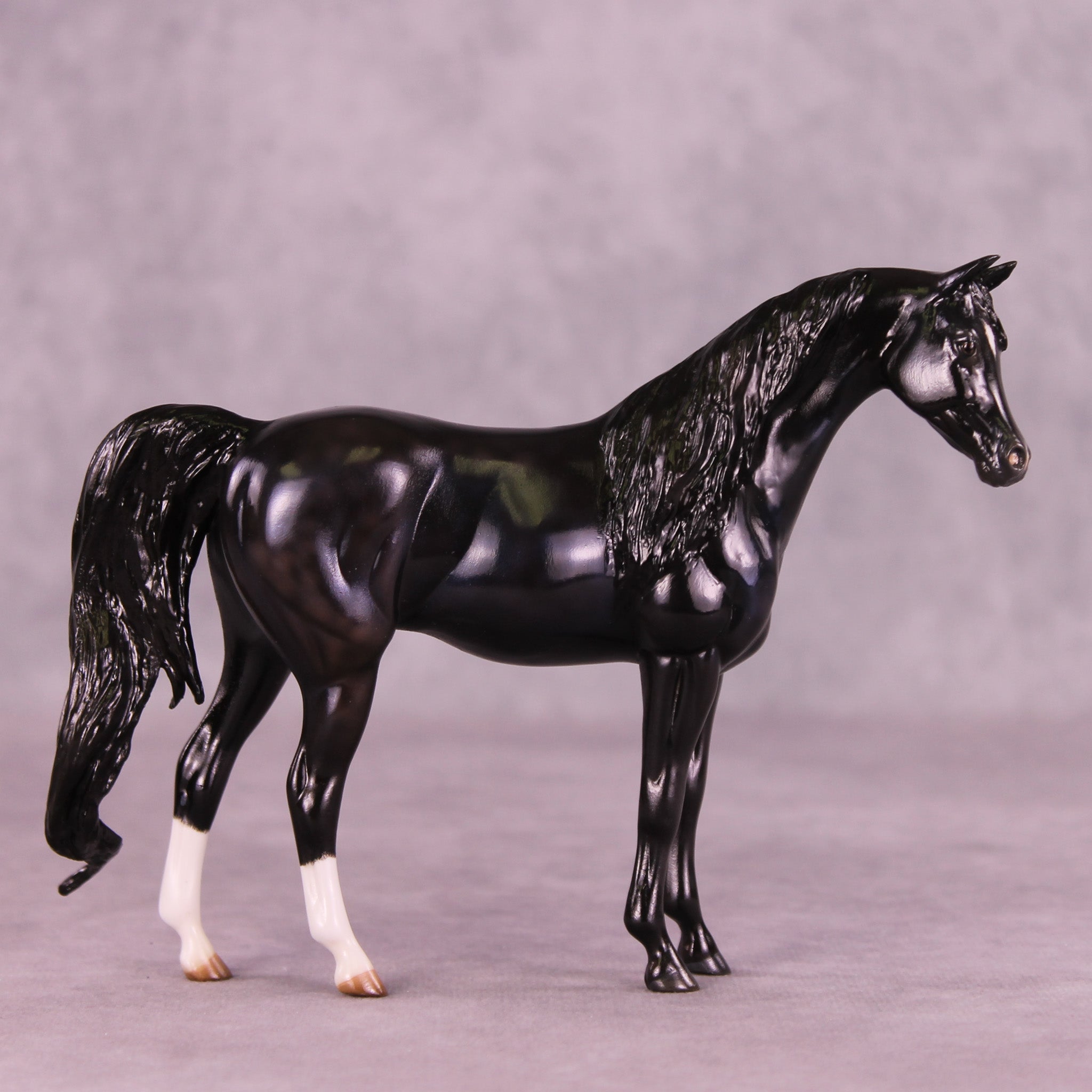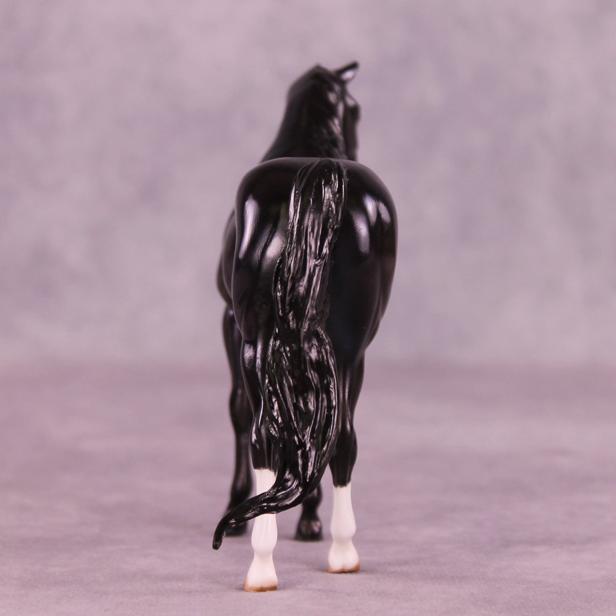This little gentleman gets cooler the longer you look at him! Kristen took our Pebble Arabian mare and turned her into a stallion to start out. She gave him a newly customized neck, carved face details and a newly customized mane, tail, and forelock with tendril detailing. She then painted him to a gorgeous glossy dapple black with delicate indigo undertones  and just the right amount of white markings, all with etched marking edges.