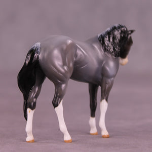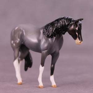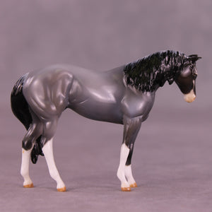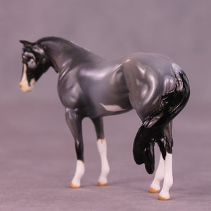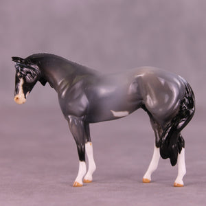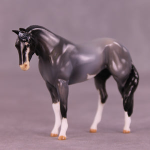 Kristen Cermele has done really cool things with our Chip Stock Horse especially, and this is another stellar example! She gave him a customized turned head and neck, newly sculpted on mane, and a sweetly swishing tail with customized extension and flowing tendril detailing. She painted him to a lovely blue roan sabino with a belly spot, uniquely interesting badger face marking, and blue eyes.