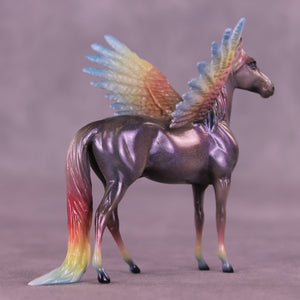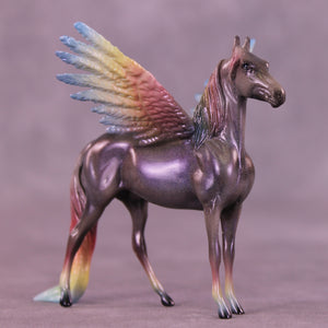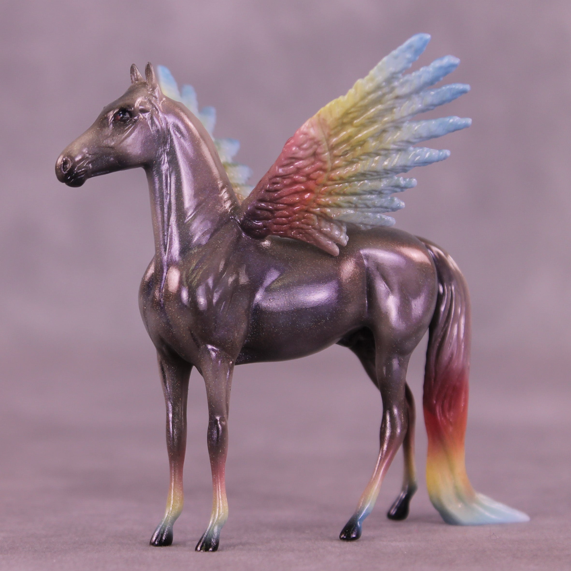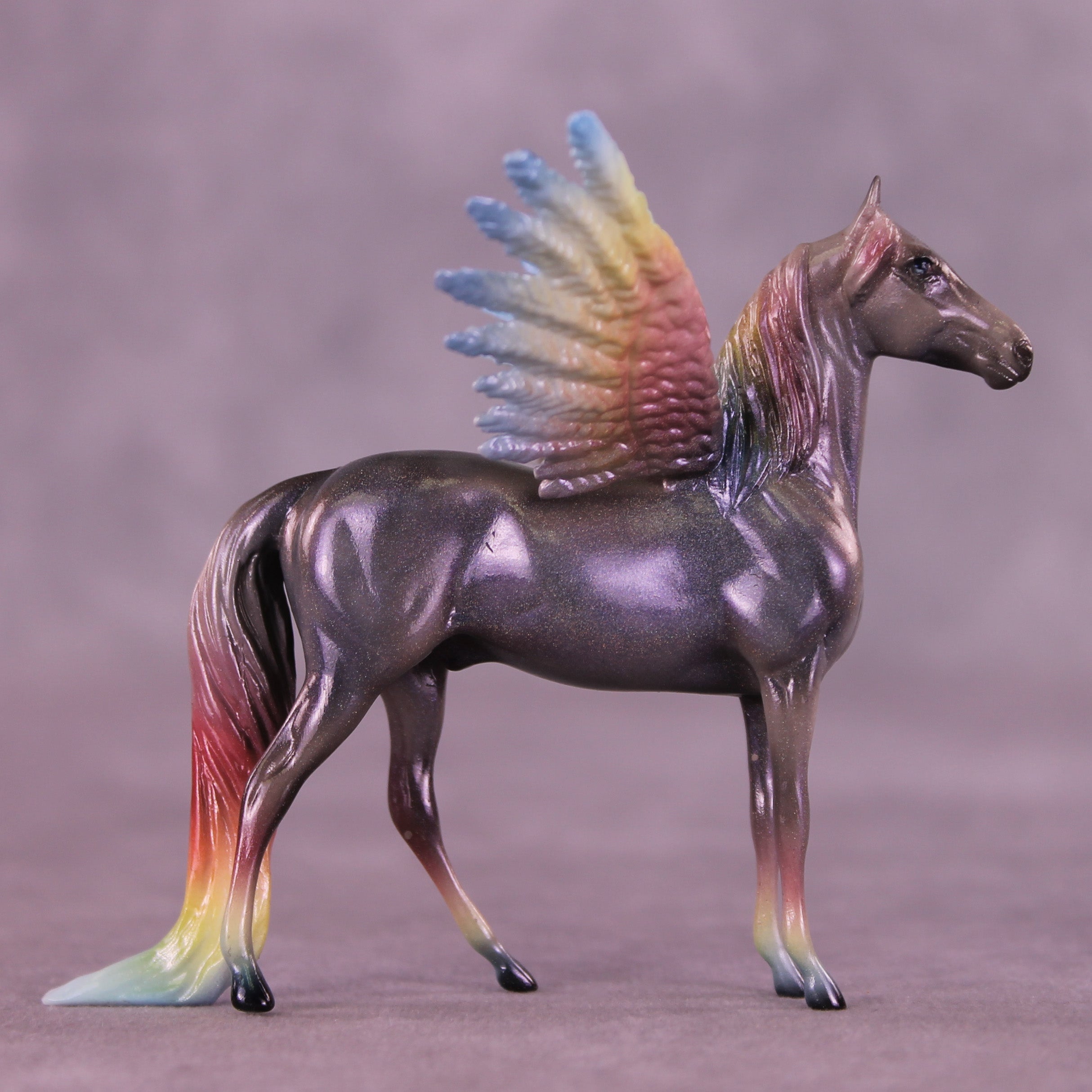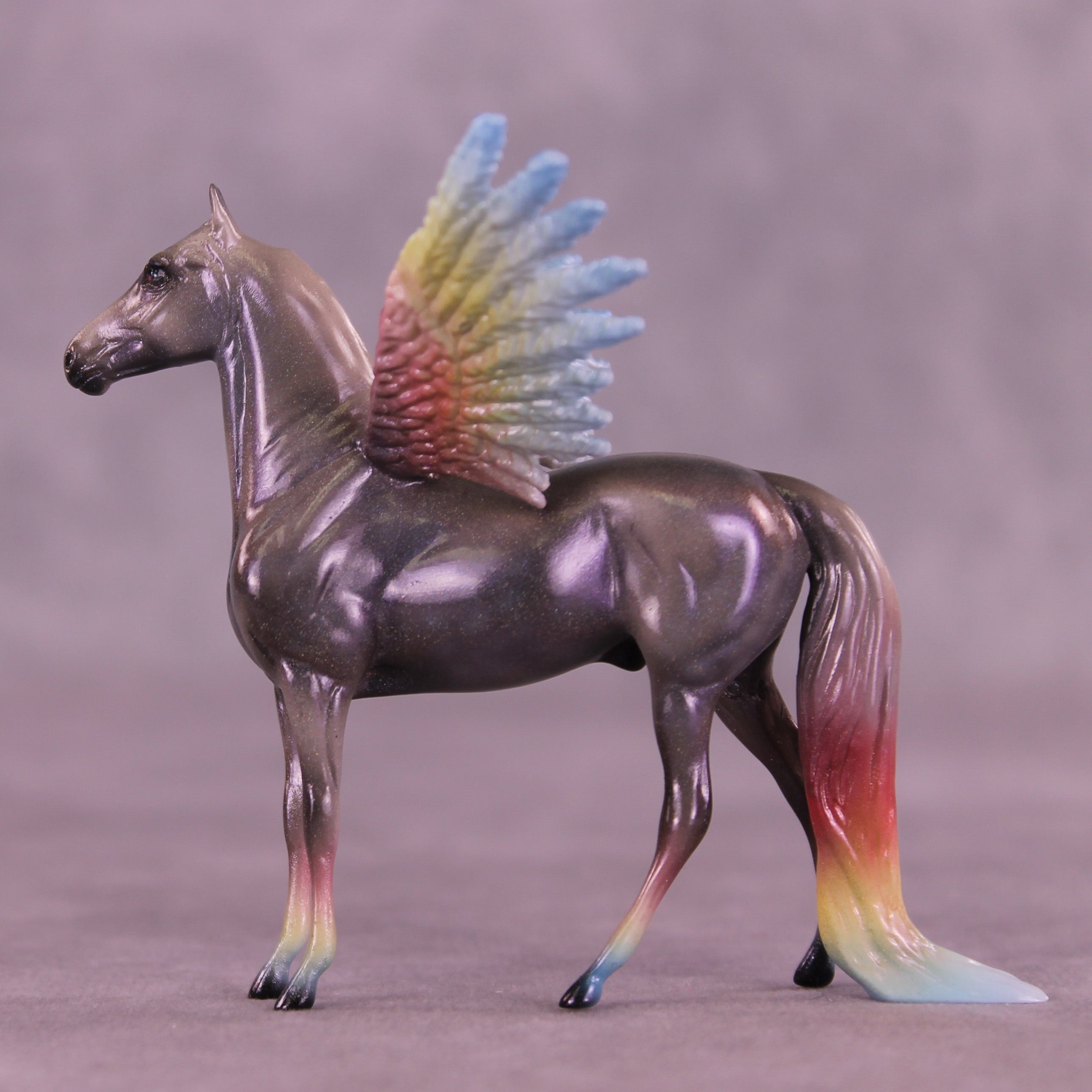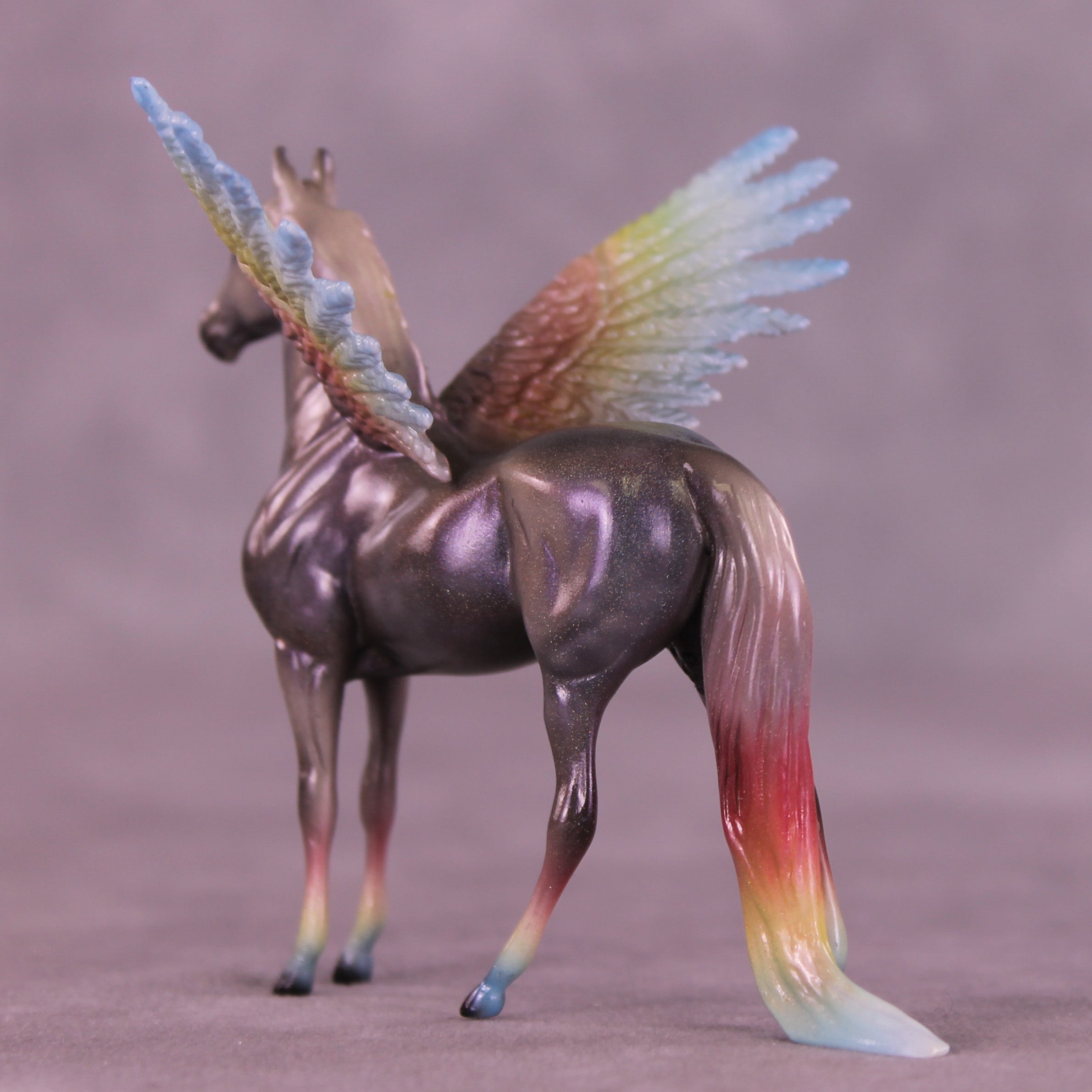 Beautiful Fanciful Thing is a morgan chip with customized extra long tail and added wings. He is painted into a very holographic purple and silvery pegasus with rainbow details. He does have some small dapples and his name was inspired by the way a friend of mine described holographic horses.