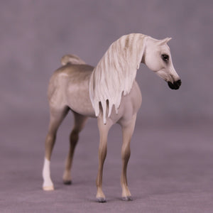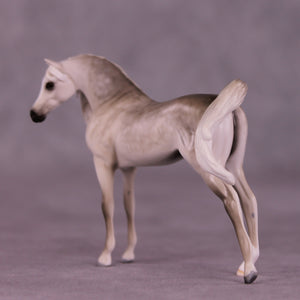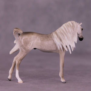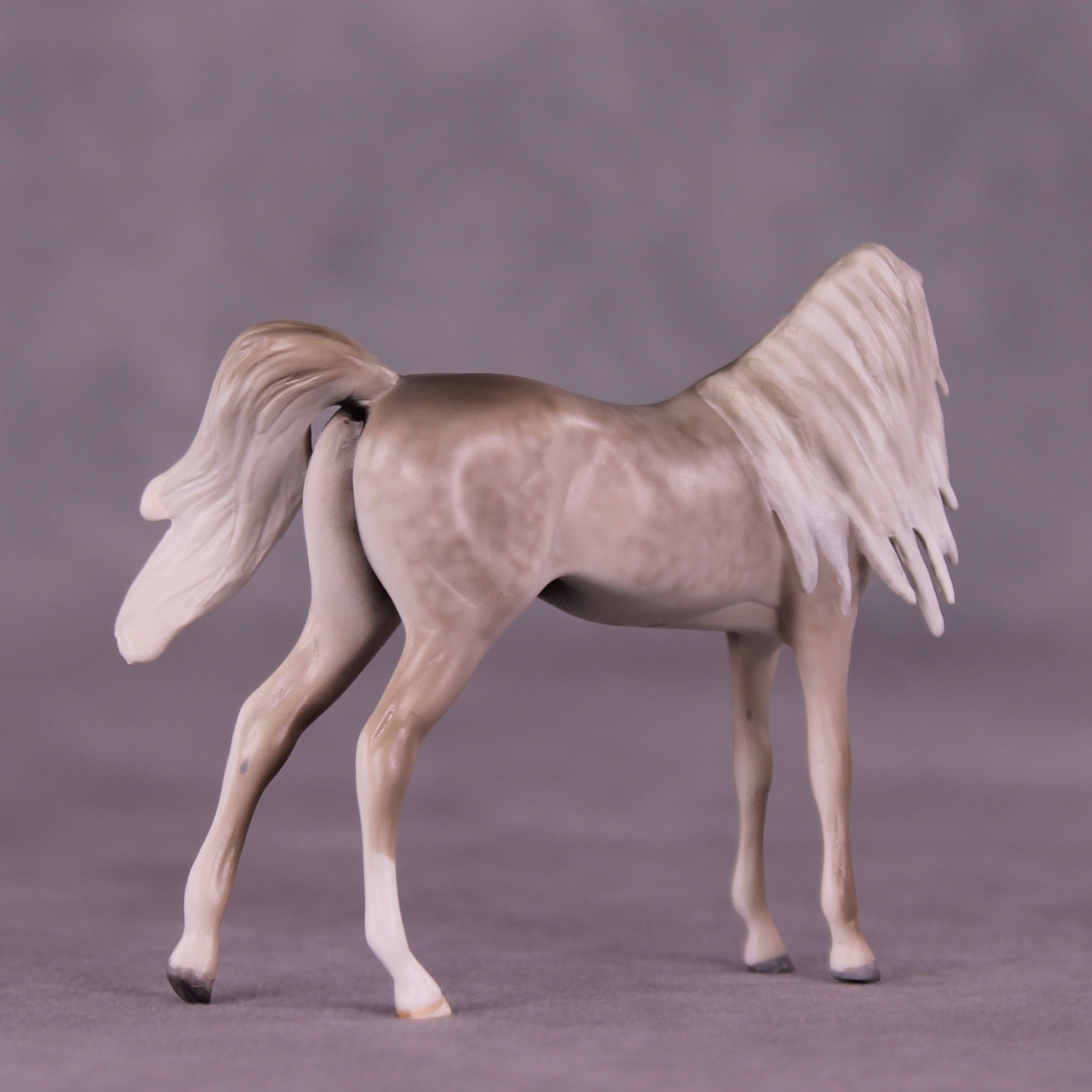 This piece starts with our Chip Arabian stallion, with an extreme customized new head and neck position, along with an extra long detailed mane and swishing tail. Tiffany finished him to a gorgeously dappled grey with a stock, no detail overlooked!