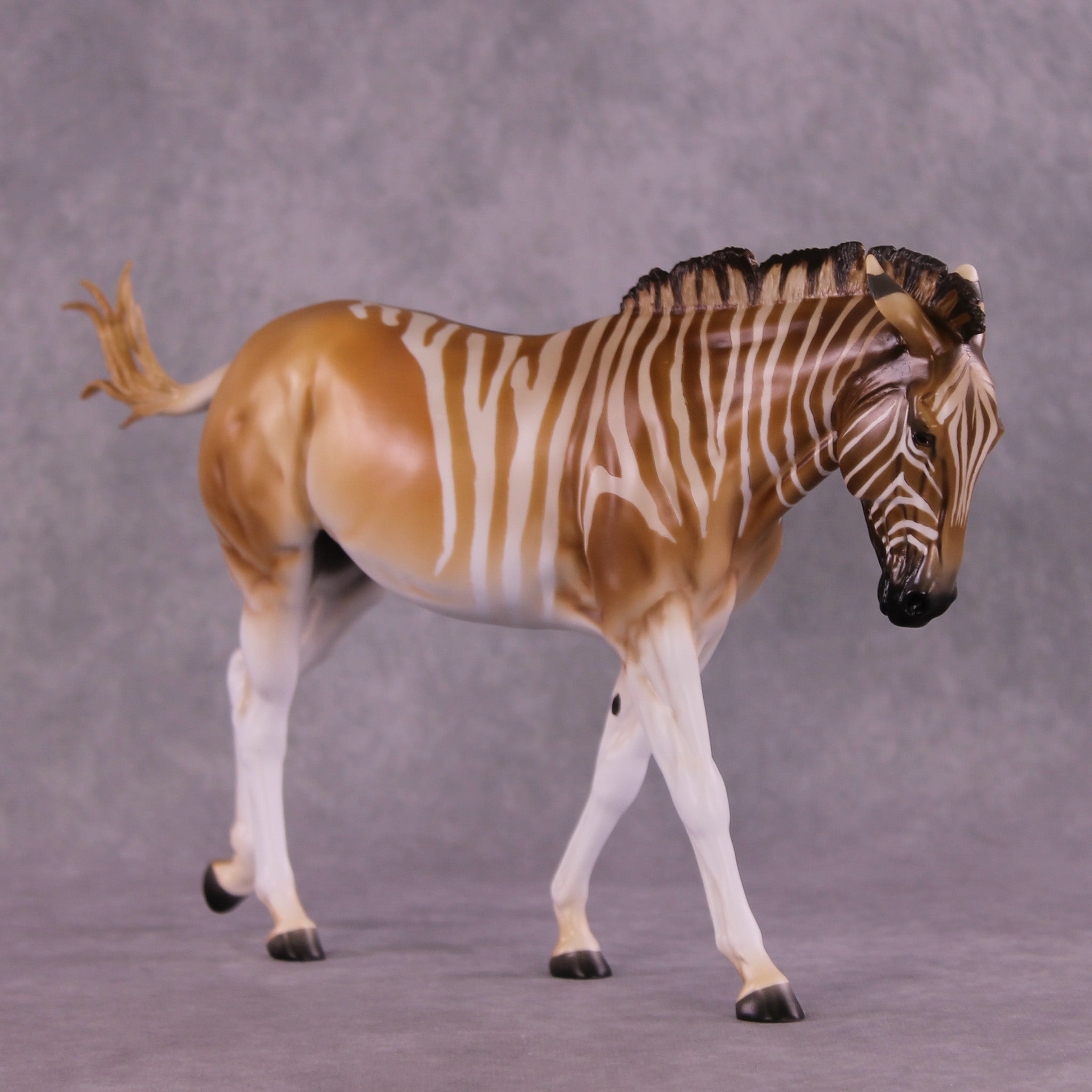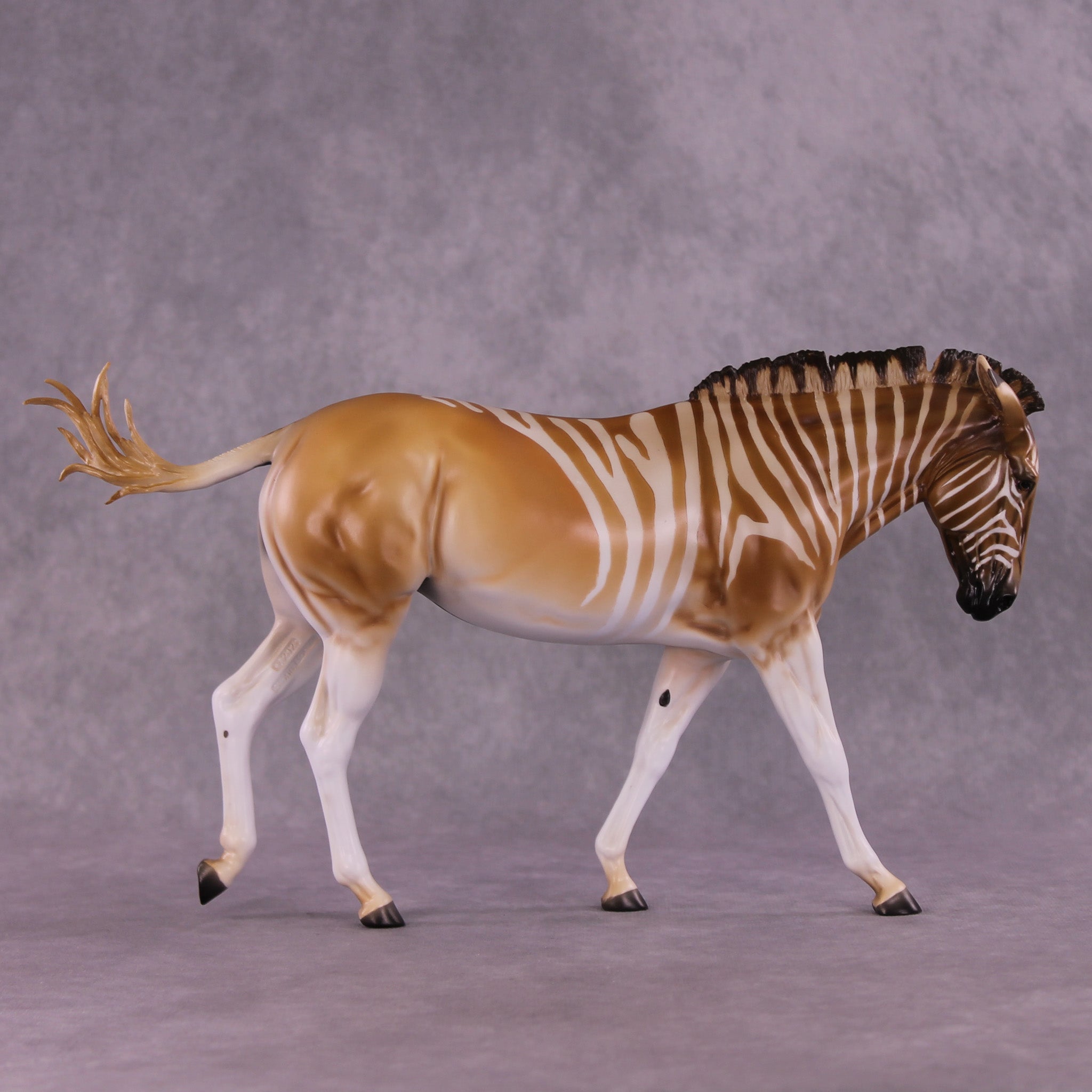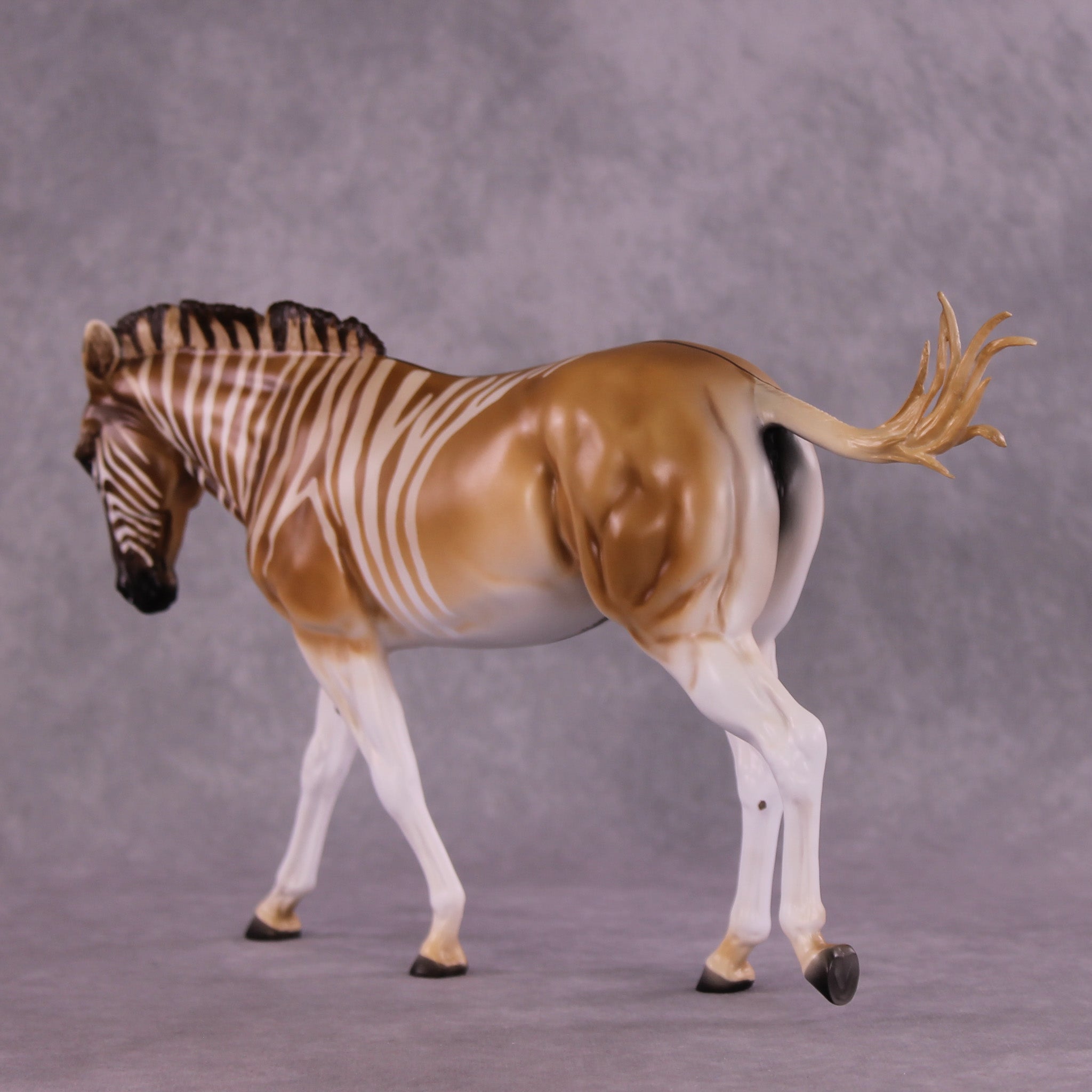 Bite Me! Or at least, stay back. This piece begins with our large Mule sculpture, and Mel gave her the full grumpy quagga treatment. Rounded pinned ears with added wrinkling and detail in the bases along with fuzzy insides, a grumpy swishing tail, and a light head tuck – she is ready to argue. Tegan painted her to a stunning shaded quagga with loads of stripe detailing, dramatic shading transitions from light to toasty brown, and the most impossibly small stripes through her face and neck. This is such a difficult color and pattern to execute, and Tegan really did her justice! Finish changes are not available on this piece.