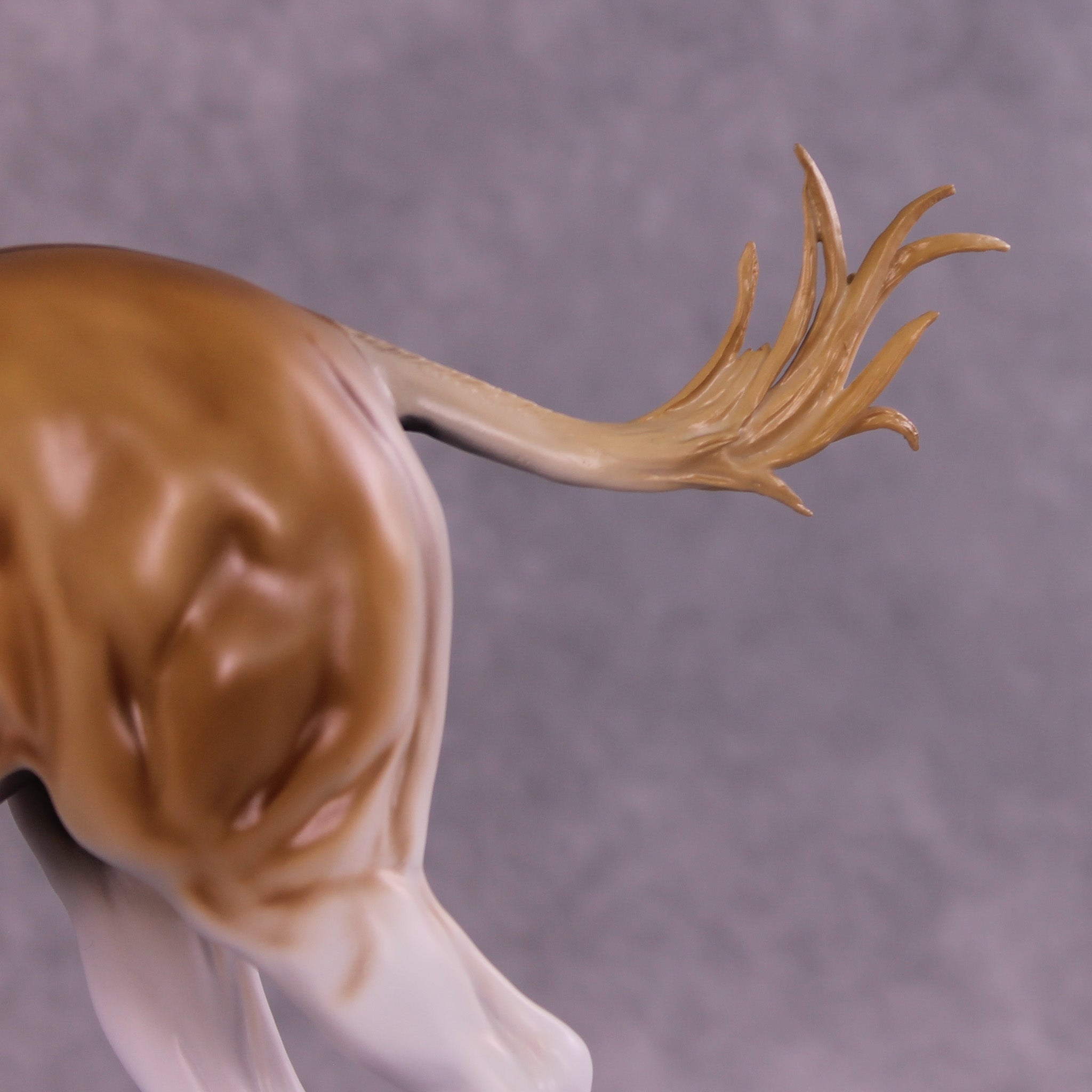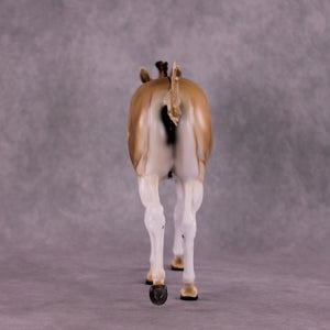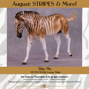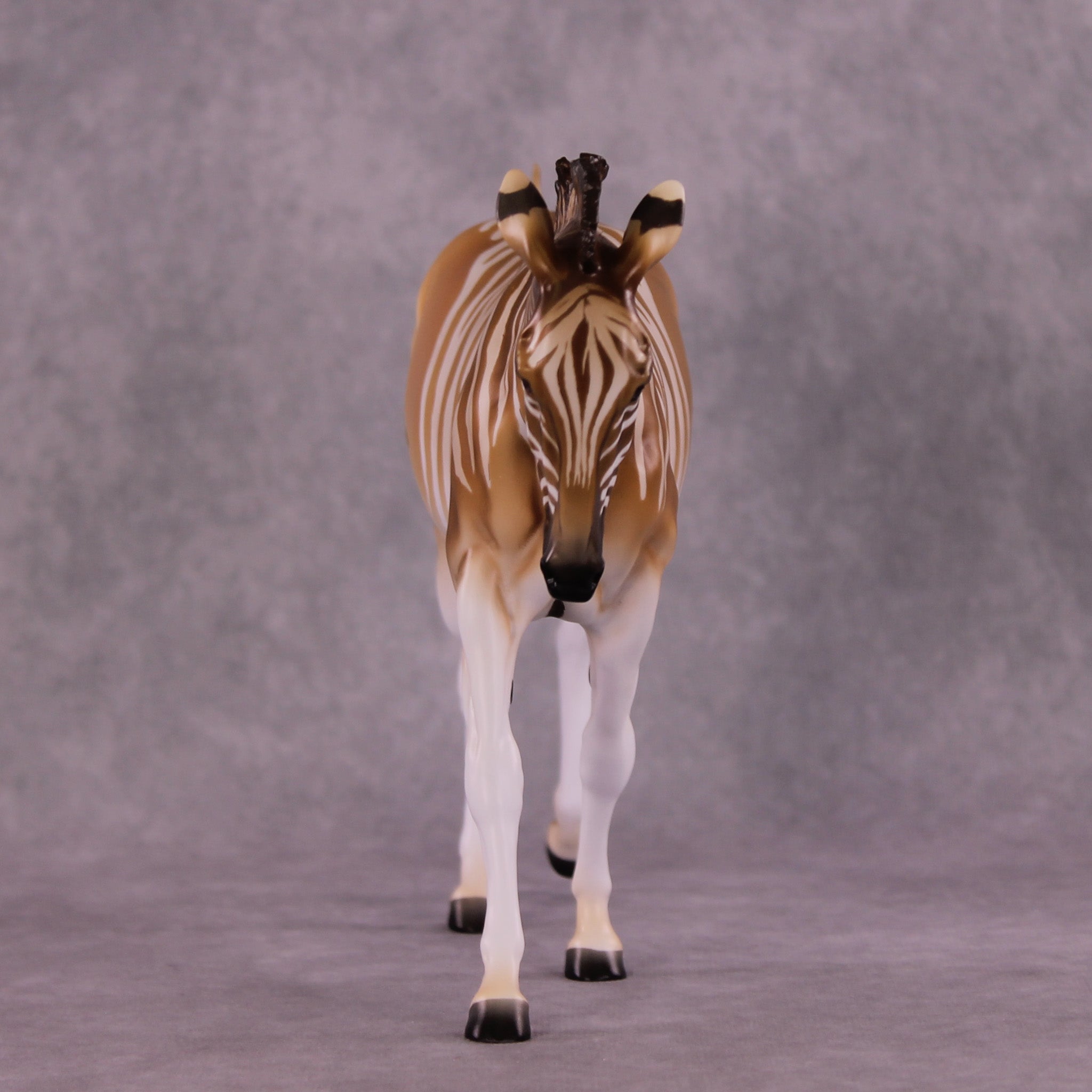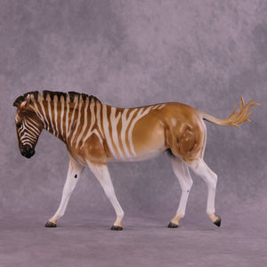 Bite Me! Or at least, stay back. This piece begins with our large Mule sculpture, and Mel gave her the full grumpy quagga treatment. Rounded pinned ears with added wrinkling and detail in the bases along with fuzzy insides, a grumpy swishing tail, and a light head tuck – she is ready to argue. Tegan painted her to a stunning shaded quagga with loads of stripe detailing, dramatic shading transitions from light to toasty brown, and the most impossibly small stripes through her face and neck. This is such a difficult color and pattern to execute, and Tegan really did her justice! Finish changes are not available on this piece.