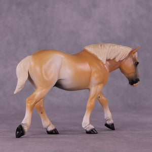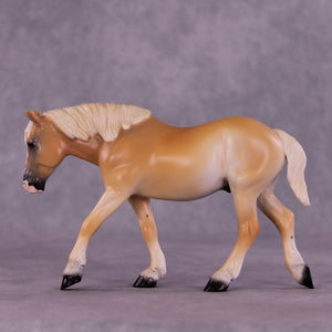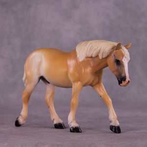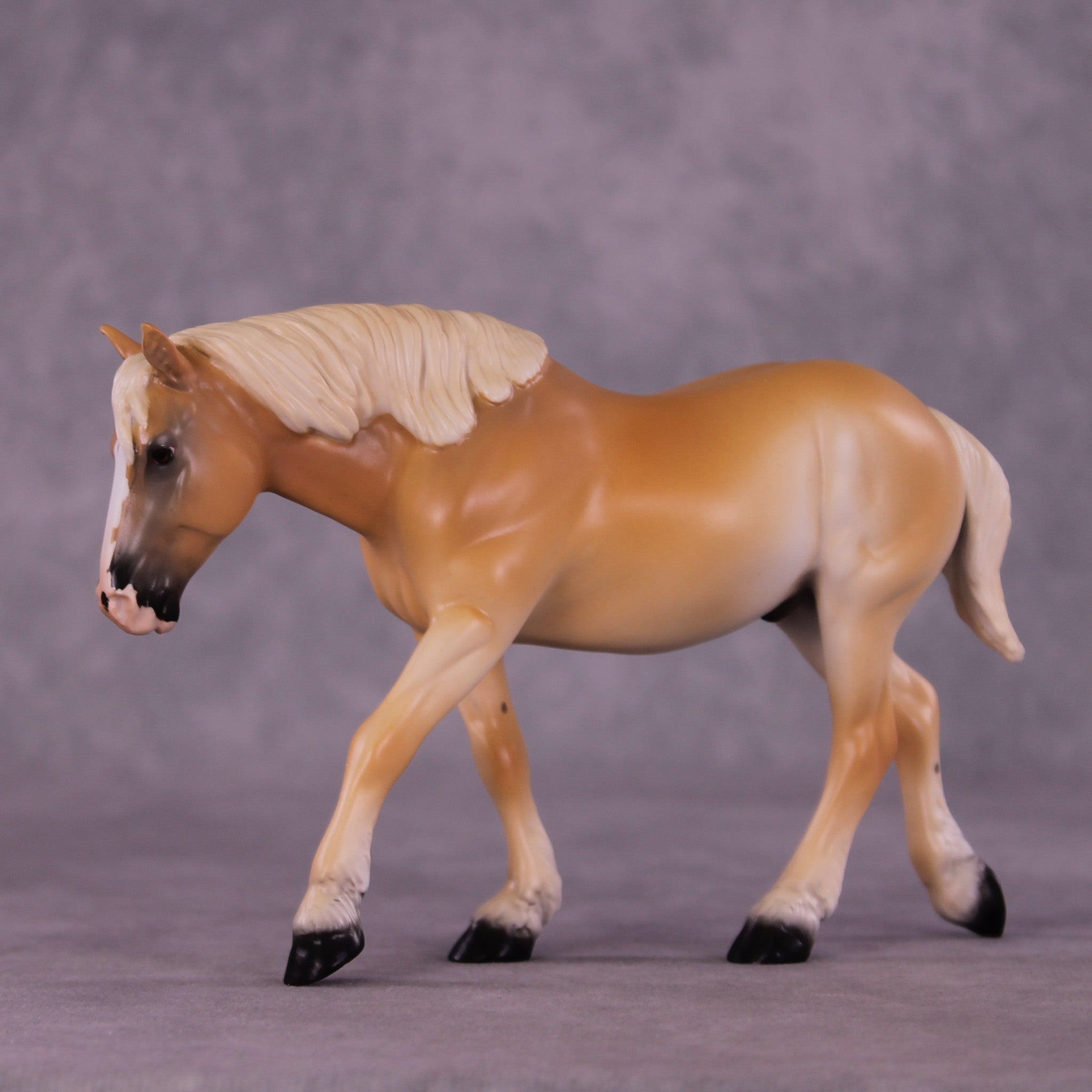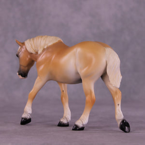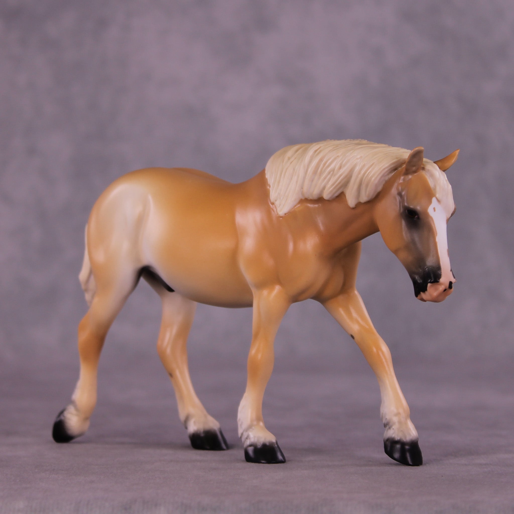 Blondie is a fun new look for our Pebble Draft Horse! Erika gave him a dramatically lowered head and neck with outstretched nose, with a big heavy mane on both sides of his neck. She then painted him to a gorgeously soft blonde Belgian chestnut with an adorable shaded blaze!
