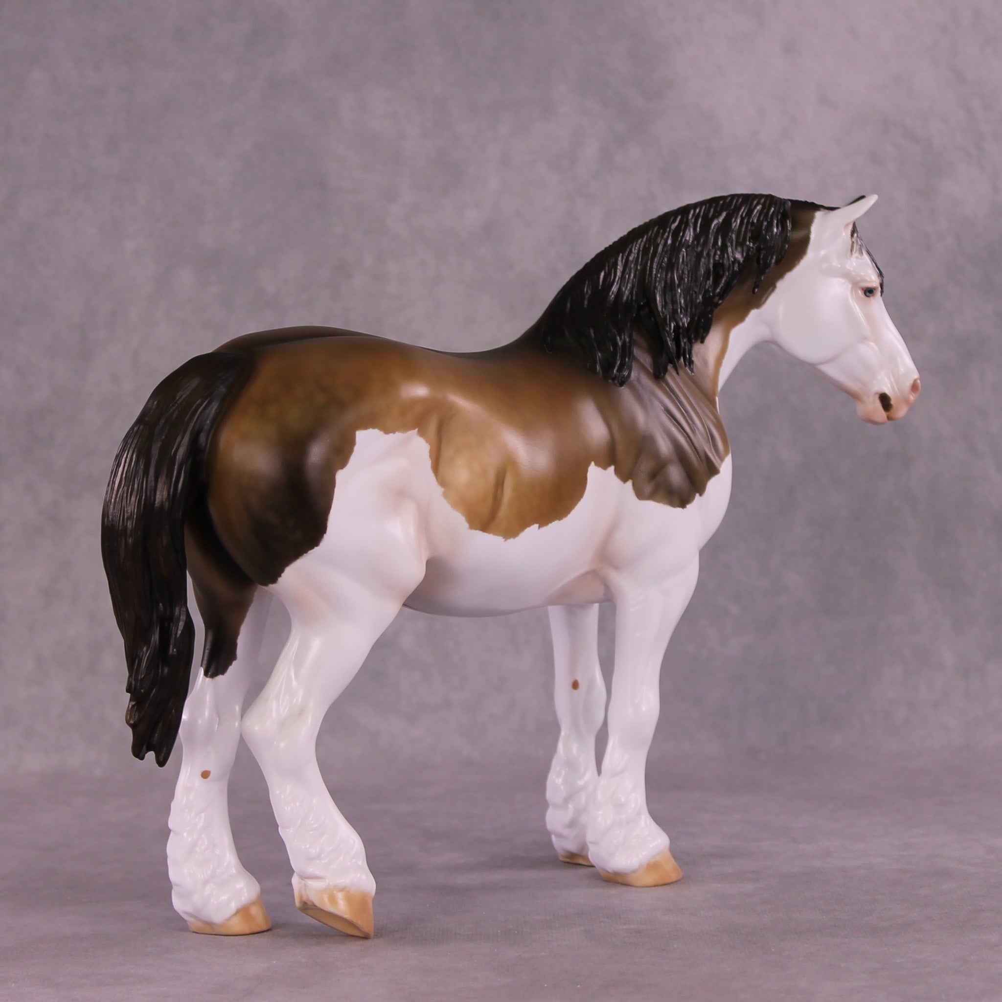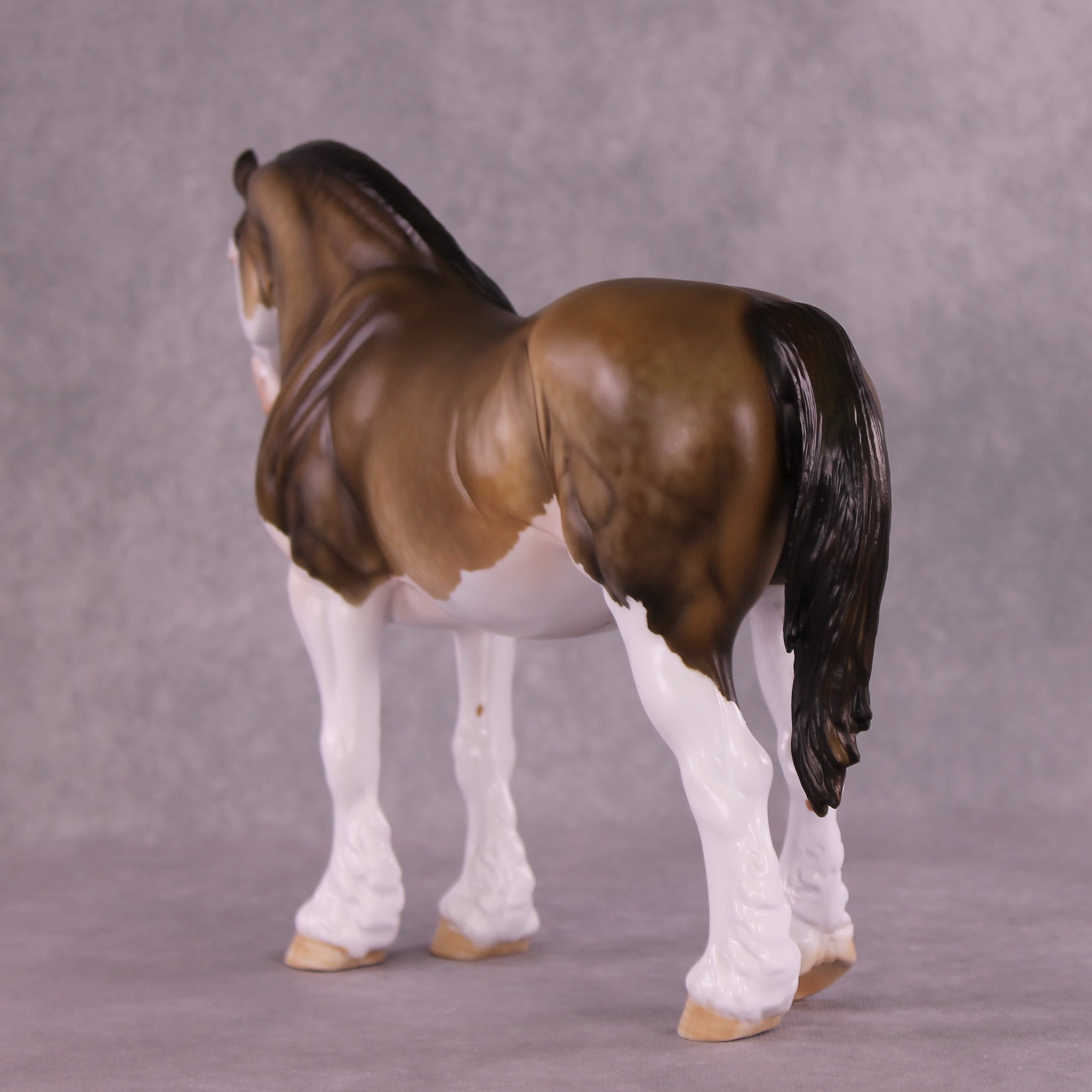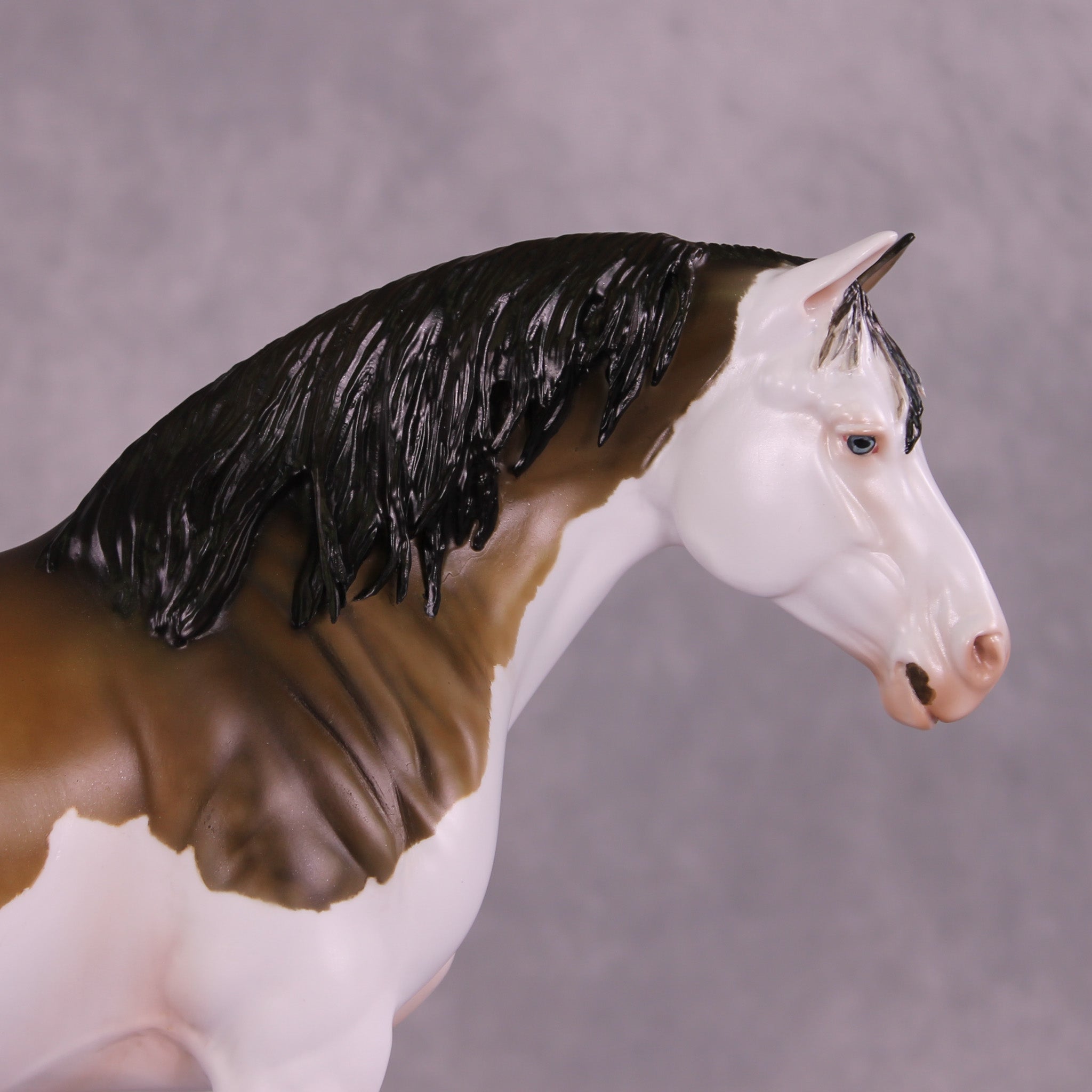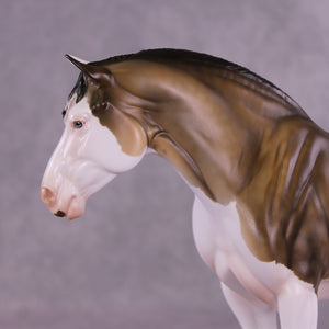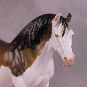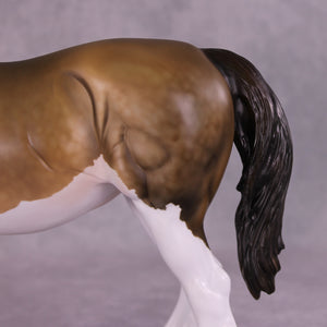 Bramble is ready for adventure! Her dappled sooty buckskin coat, beautifully painted by Julie, is splashed with softly shaded whites that add depth and dimension. Playful kissy spots, along with a detailed mane, forelock, and tail by Mona bring her personality to life! This stunning mare radiates charisma.