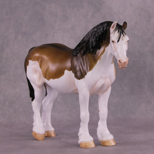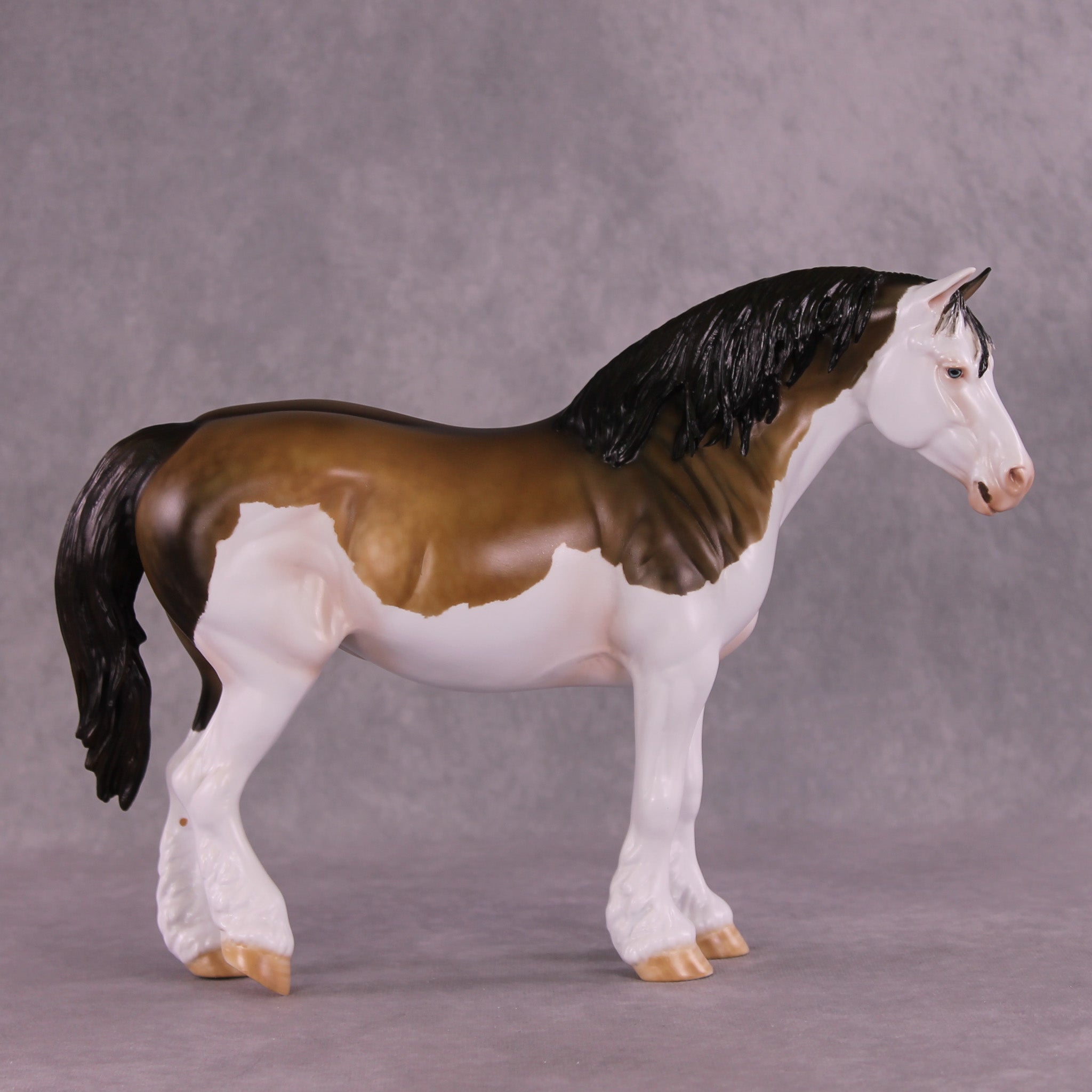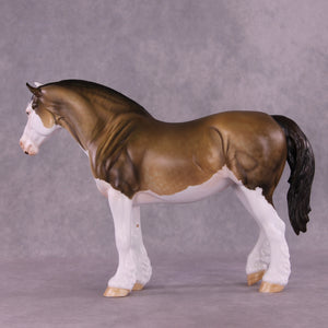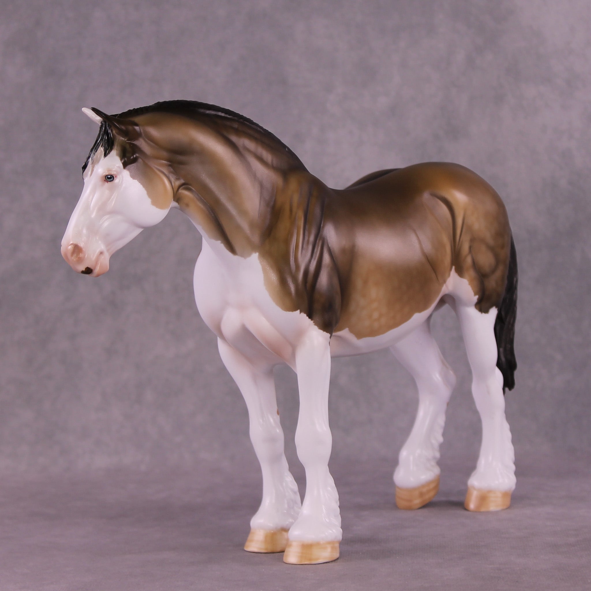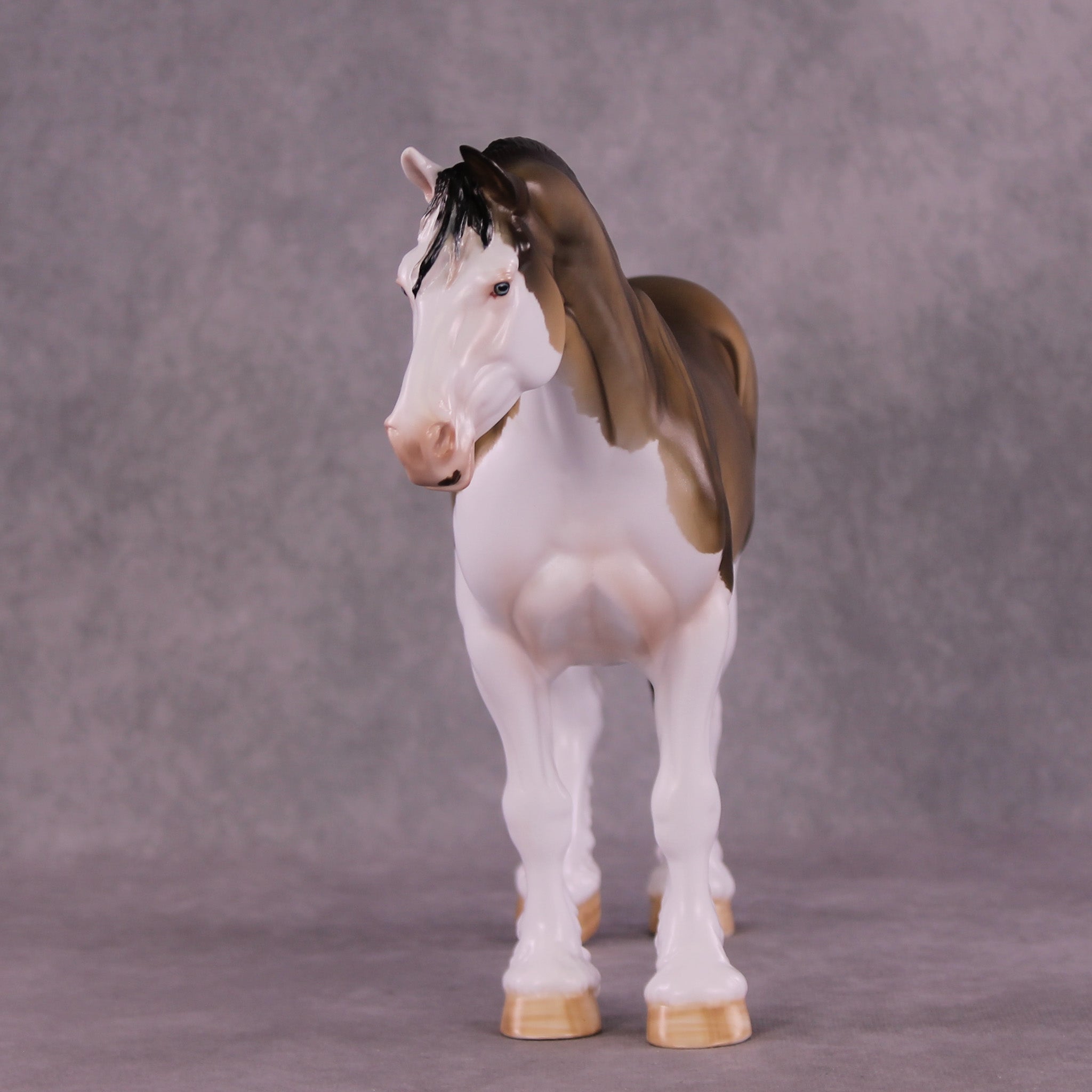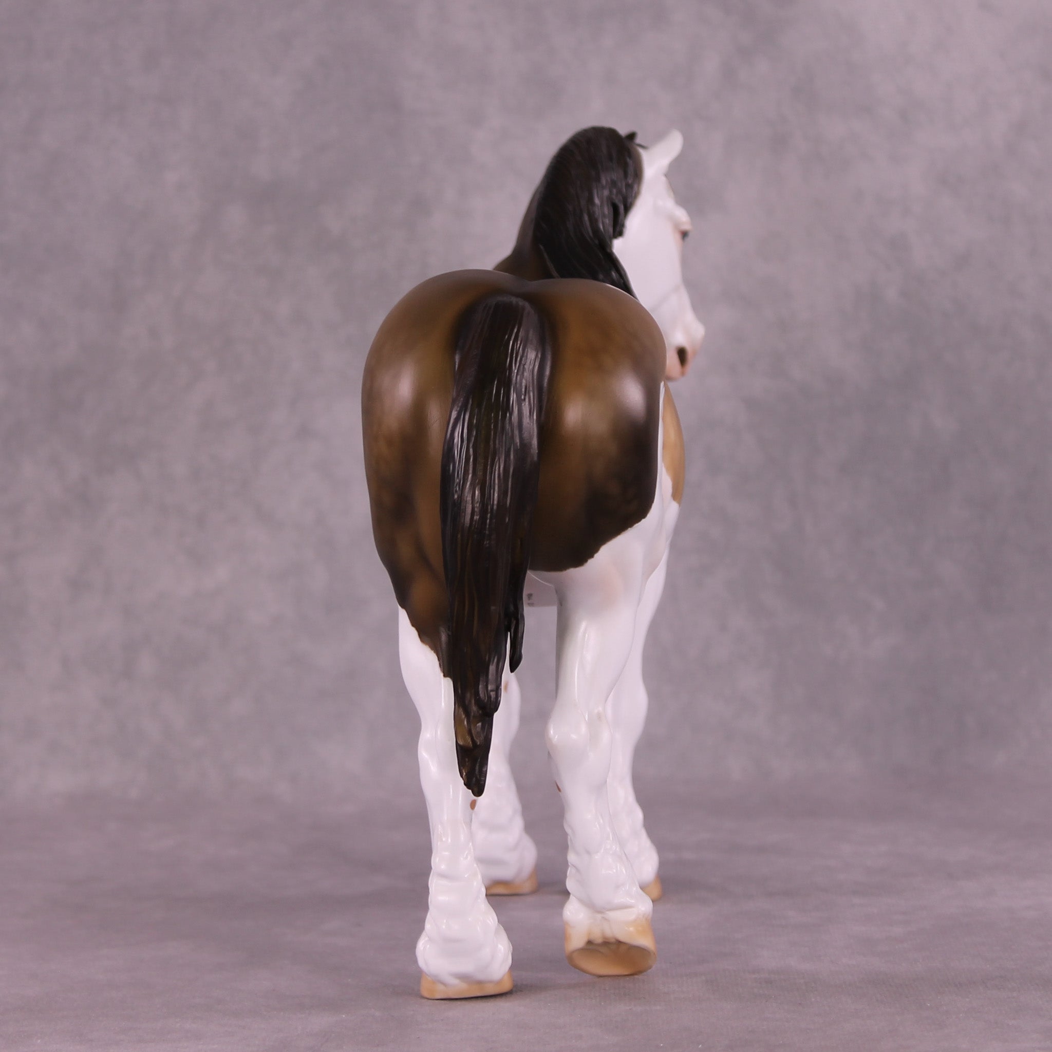 Bramble is ready for adventure! Her dappled sooty buckskin coat, beautifully painted by Julie, is splashed with softly shaded whites that add depth and dimension. Playful kissy spots, along with a detailed mane, forelock, and tail by Mona bring her personality to life! This stunning mare radiates charisma.