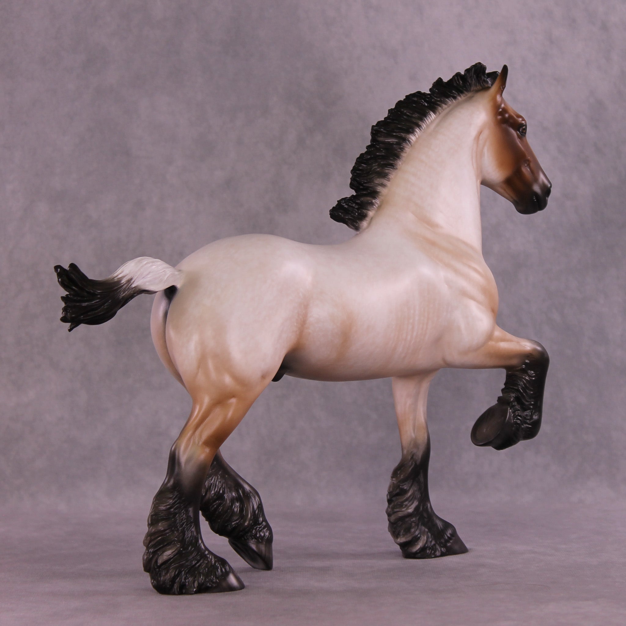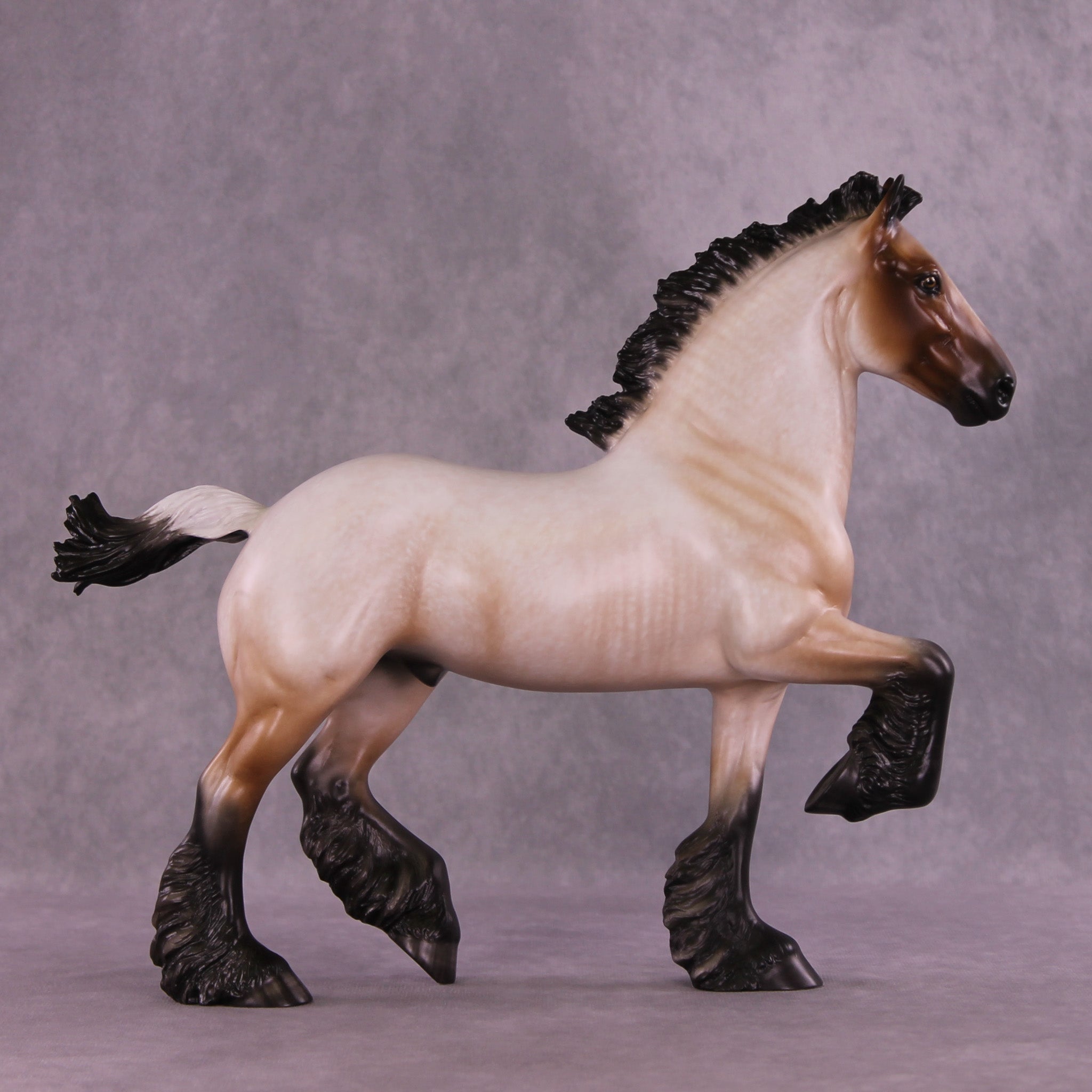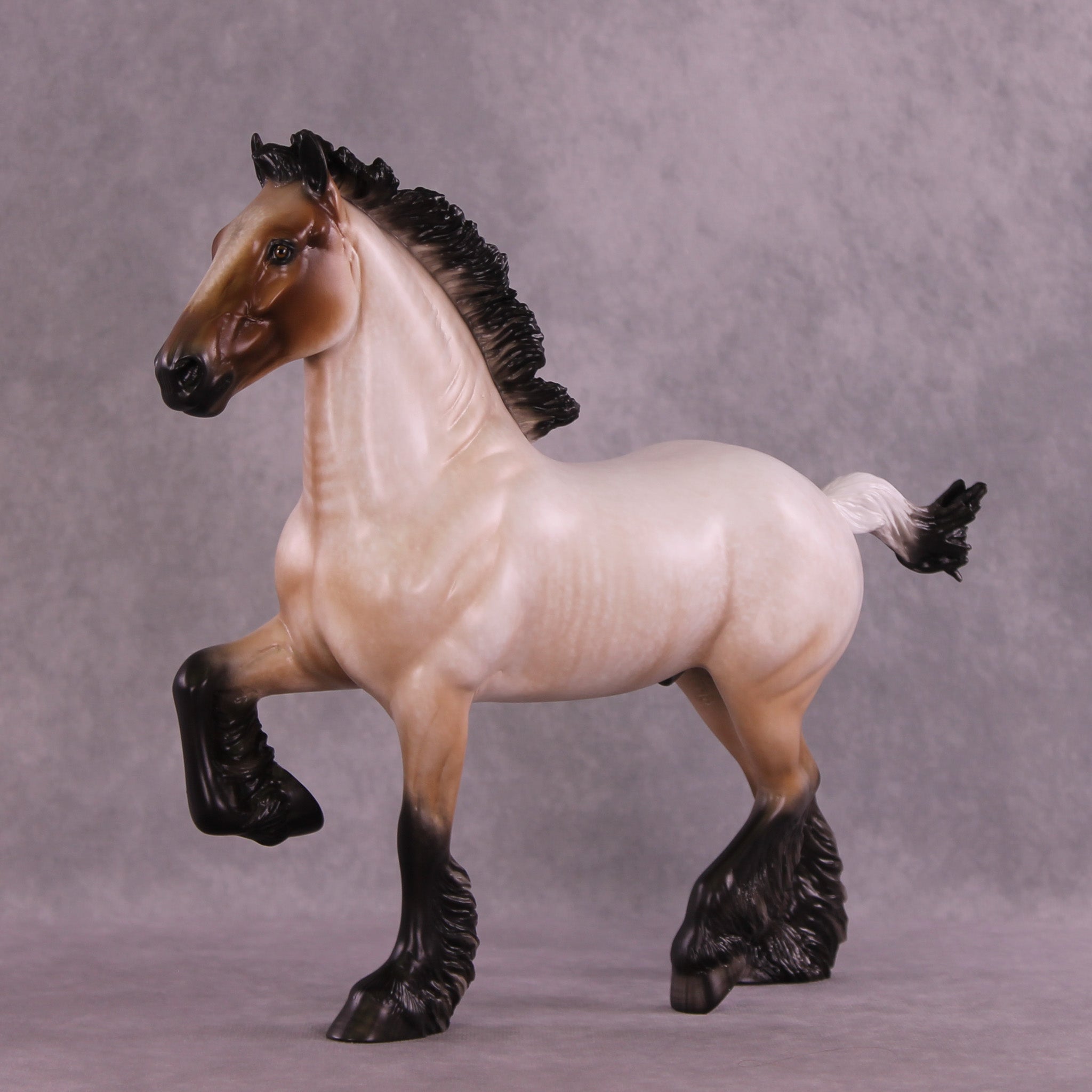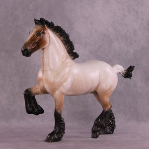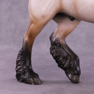 Bullock features an exciting new look for our Trotting Drafter sculpture! Our customizing team gave him an action packed upstanding mane and short flying tail, giving this piece a ton of new motion. Sheryl then painted him to a gorgeously detailed bay roan with a beautifully balanced mix of hair level detailing and soft shading transitions, with no white markings. You can especially see the intricacy of his paintwork in the front of his face, and up the front of his neck – truly a standout work of art.