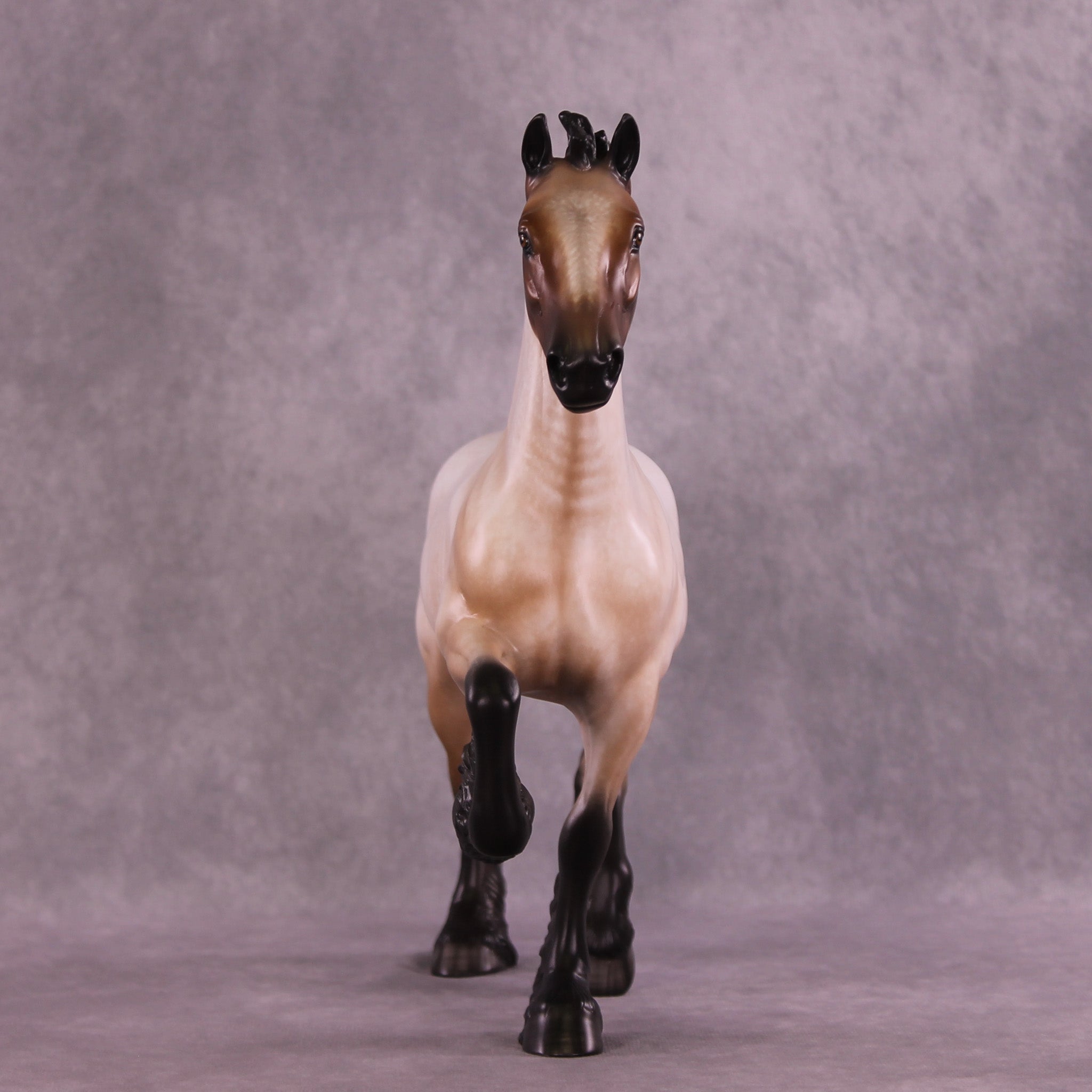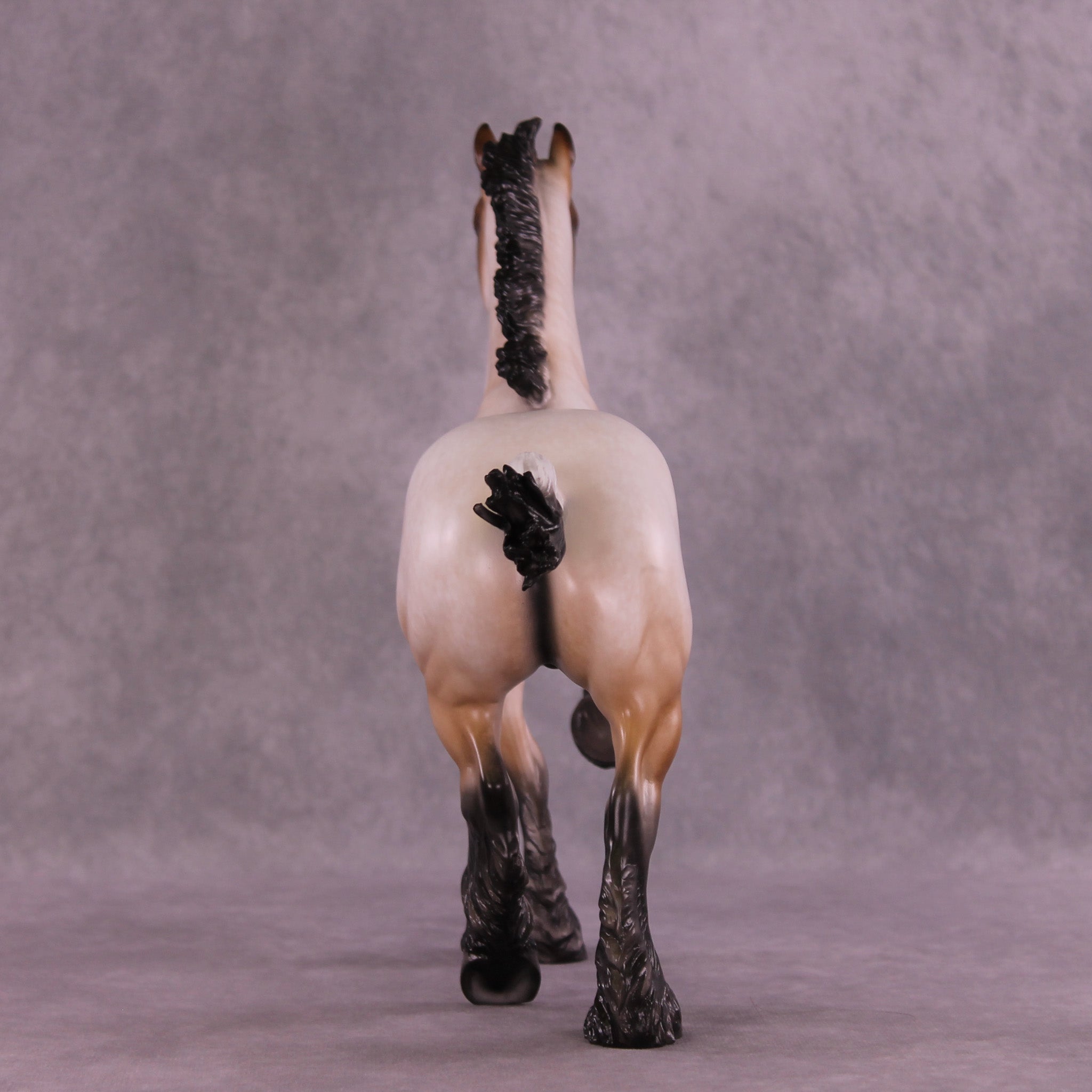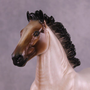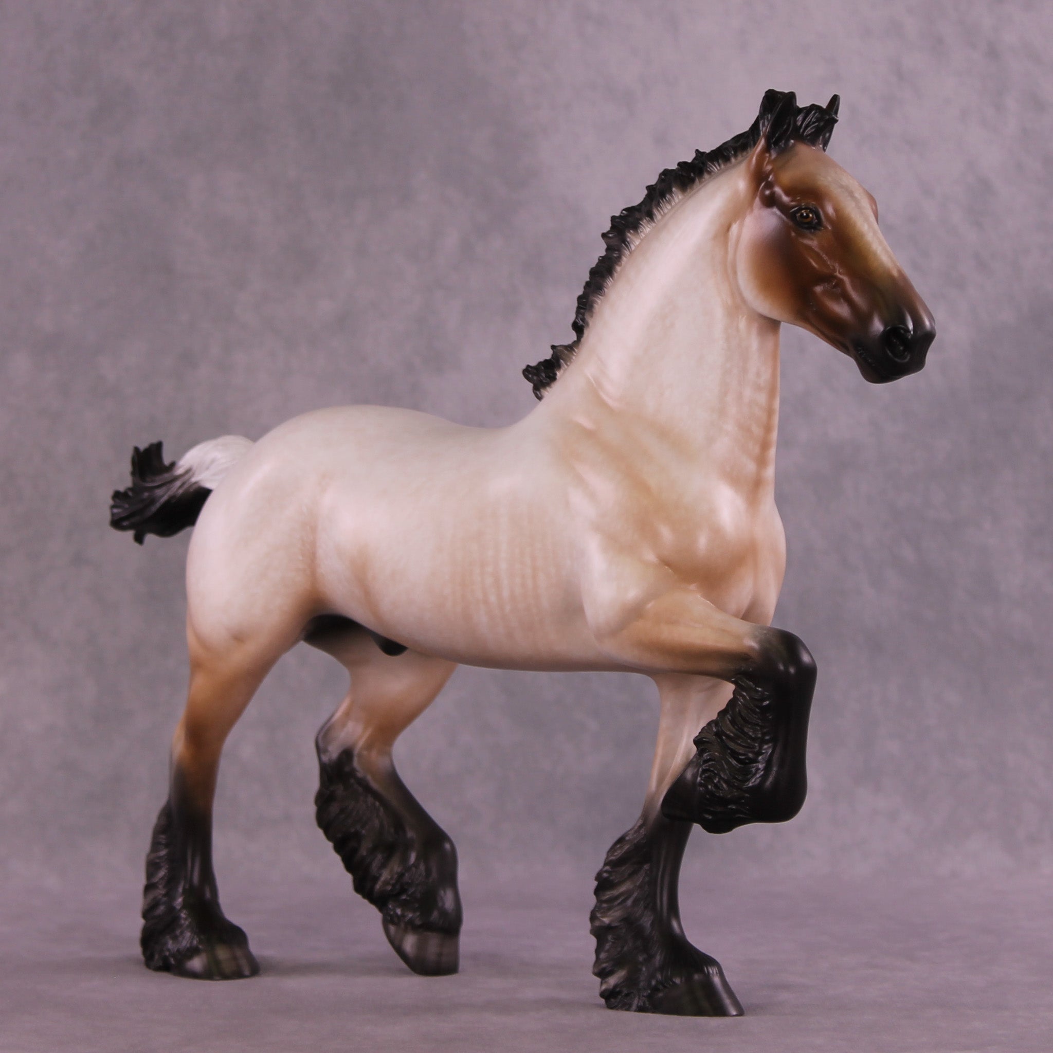 Bullock features an exciting new look for our Trotting Drafter sculpture! Our customizing team gave him an action packed upstanding mane and short flying tail, giving this piece a ton of new motion. Sheryl then painted him to a gorgeously detailed bay roan with a beautifully balanced mix of hair level detailing and soft shading transitions, with no white markings. You can especially see the intricacy of his paintwork in the front of his face, and up the front of his neck – truly a standout work of art.