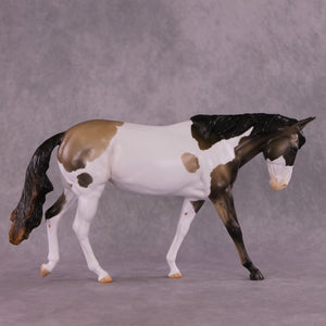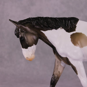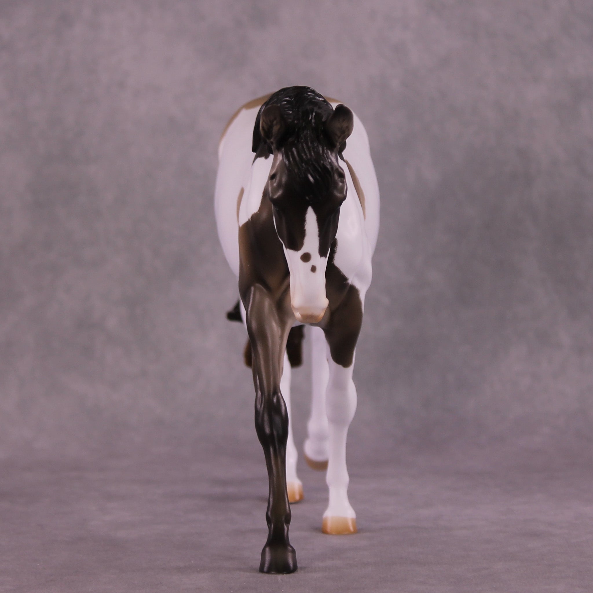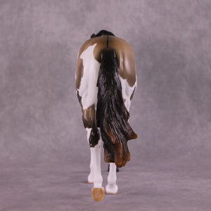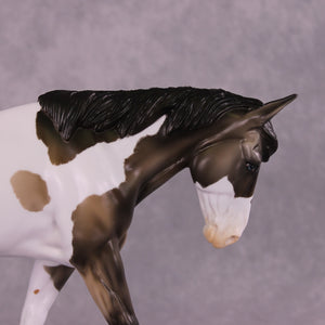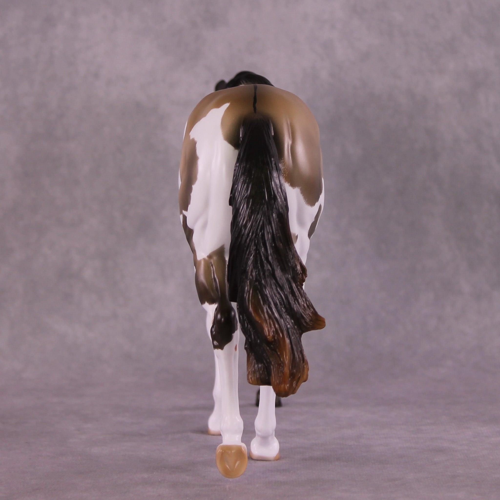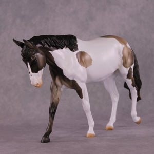 Can I Tell You A Secret has nothing to hide.Starting with our large Mule mold, Mel gave hera sweetly tucked head, long loose tail, and mane falling on both sides of her neck. Tegan painted her to a stunning grulla pinto with tons of etched detailing and shading, and to keep her on-theme, she of course has a lovely dorsal stripe!Finish changes are not available on this piece.