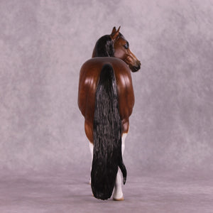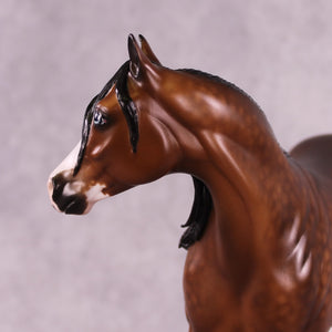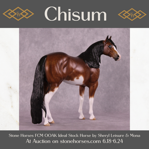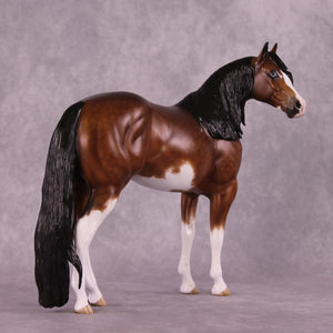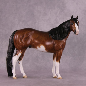 “Chisum” has a gorgeously turned head and neck with Mona’s long and flowing mane, tail, and forelock with tendril detailing, and then Sheryl painted him to a stunningly deep dappled bay sabino with four tall white socks, a wide blaze, and lovely blue eyes!