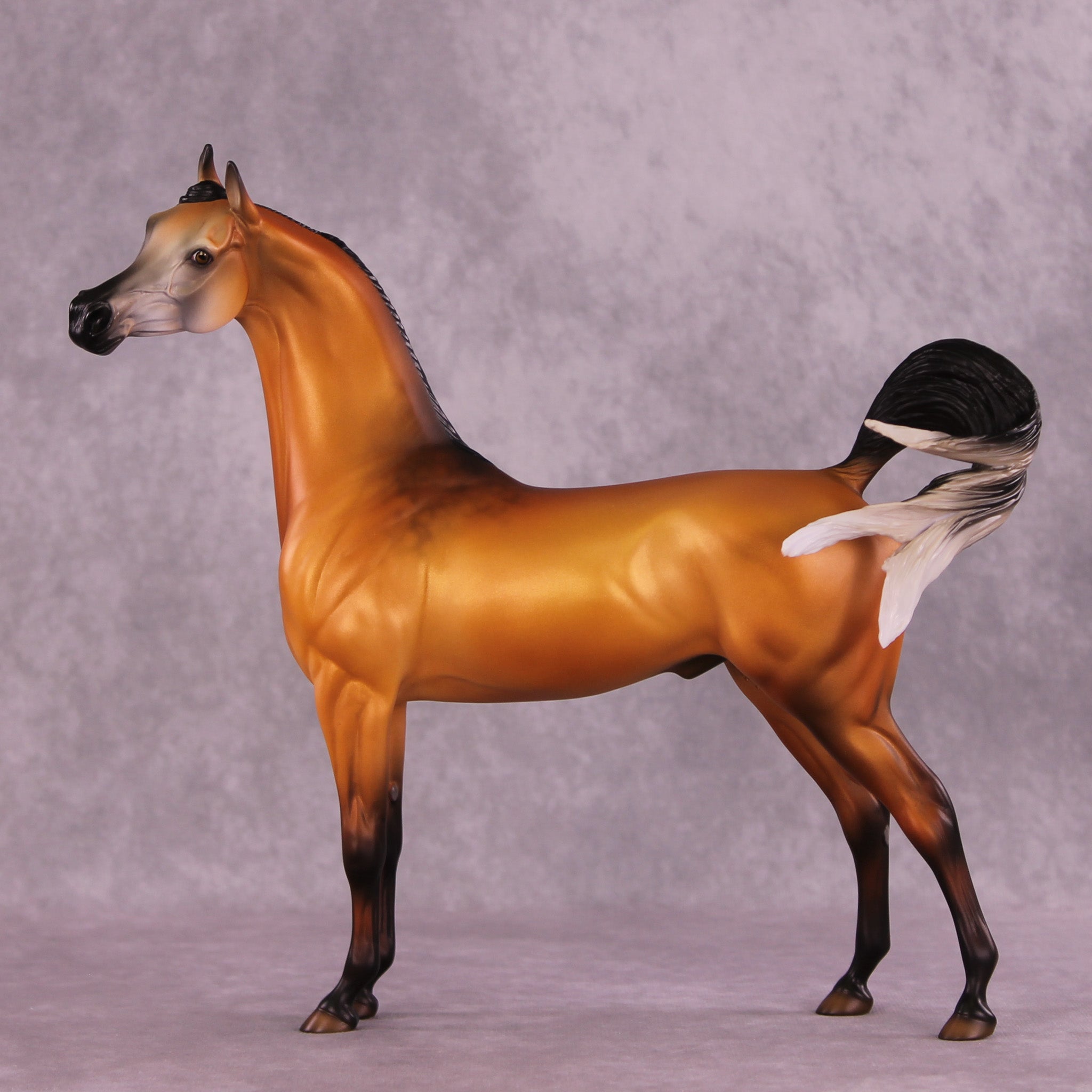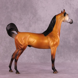 First up is Cordillera, an Extreme Factory Custom on our Arabian Stallion mold. Representing the maned wolf, he sports a dramatic lifted, tilted, and turned head and neck, and an uplifted tail customized with extra motion and detailing, sweeping around his side. He is finished to a gorgeously shaded golden buckskin going grey, and is available in all finish options.