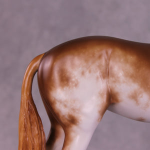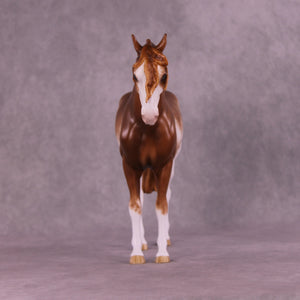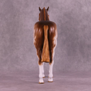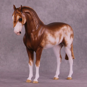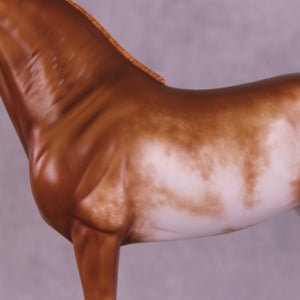 Cornelia is a whole new look for our Andalusian! Mel customized him to a her – with added teats – and then gave her the full Andalusian Mare clip job, with a shaved and neatly banged tail just below her hocks, a carved neatly roached mane, and long loose forelock with tendrils around both eyes and down the front of her face. Sheryl painted her to a stunningly detailed chestnut sabino with oodles of soft hair detailing and blue eyes. She is gorgeous!