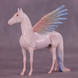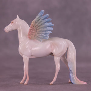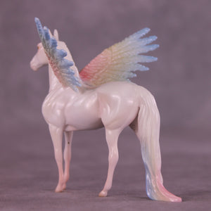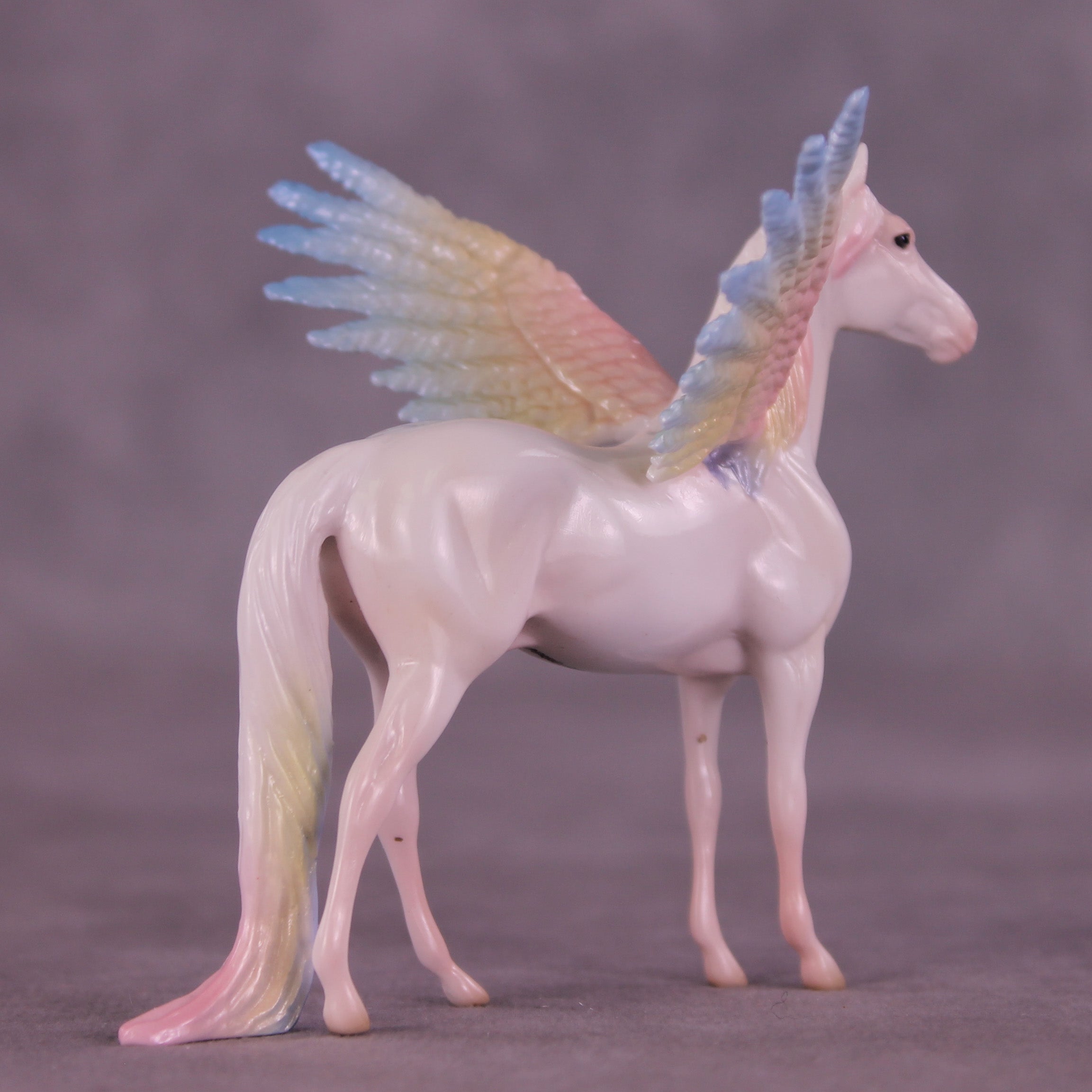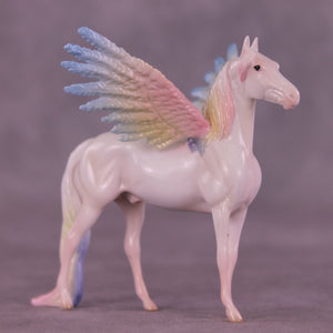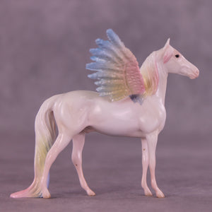 Corvus Acolyte is a mini-me version of Corvus Master, paying homage to the collection Pernille and Ellen created together in 2024. He is a Morgan Chip with an extra long customized dragging tail and added feather wings, painted in a gorgeous pearl pastel rainbow design.