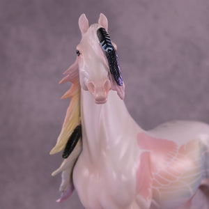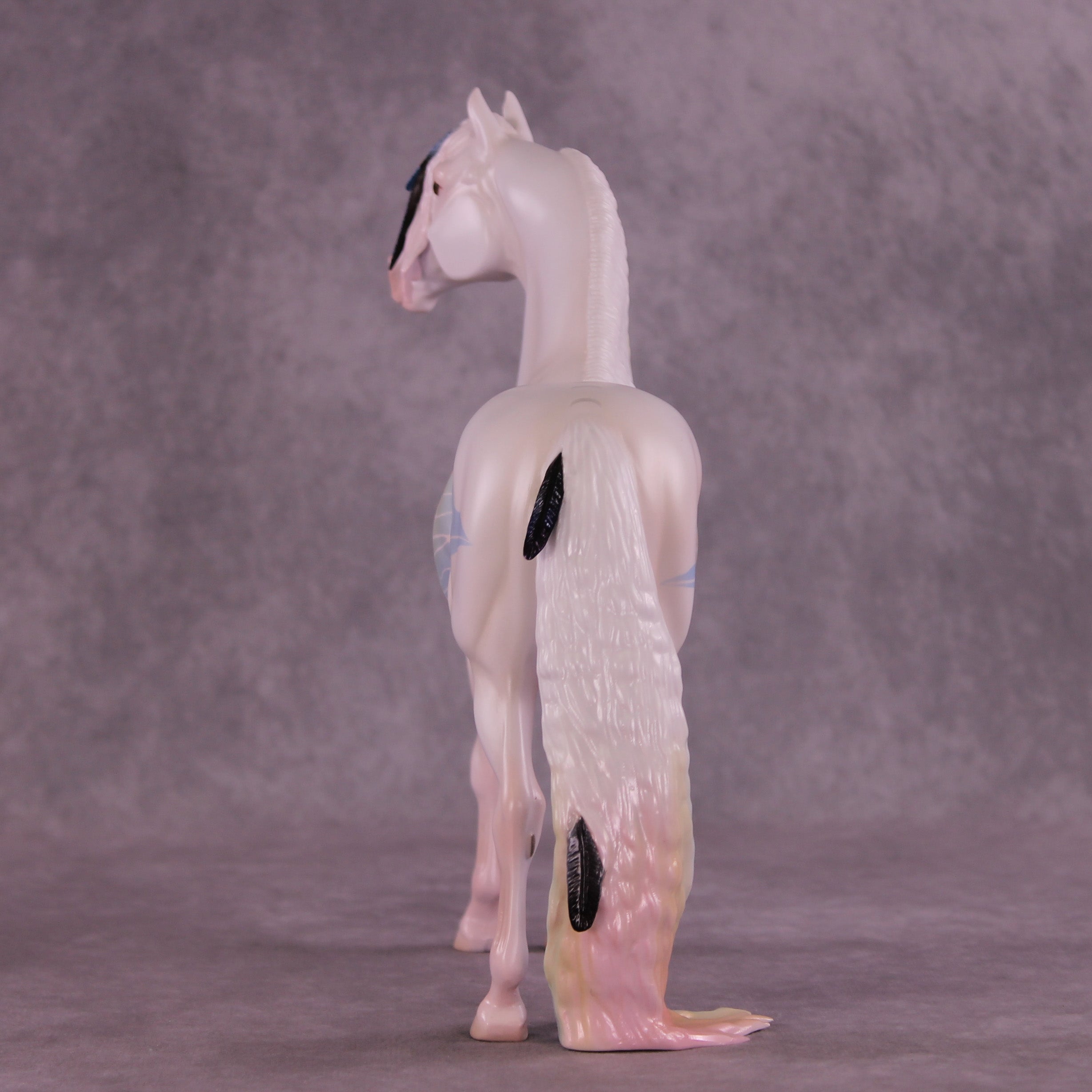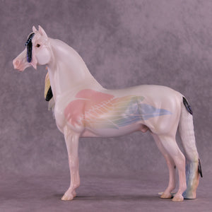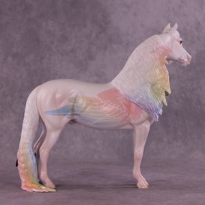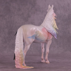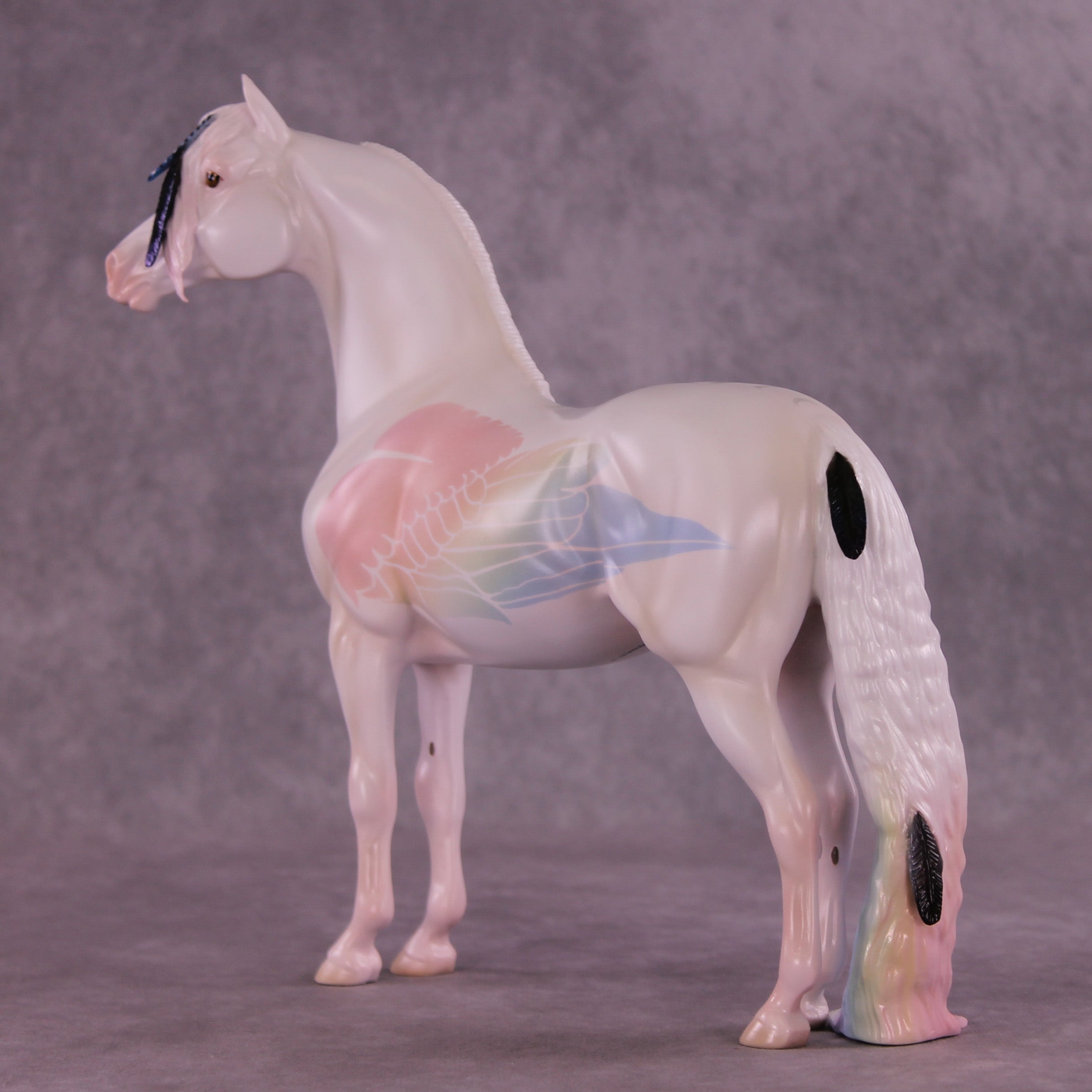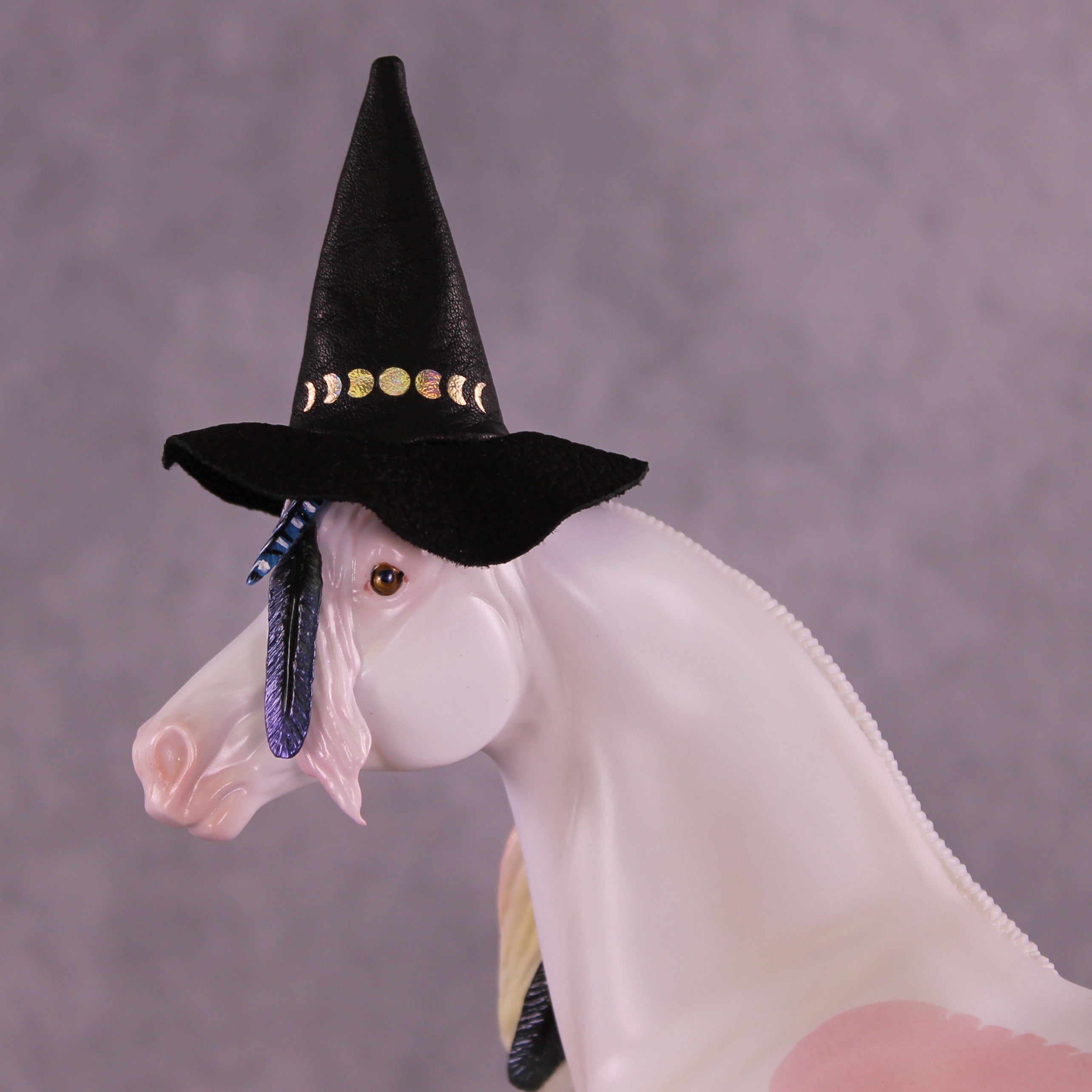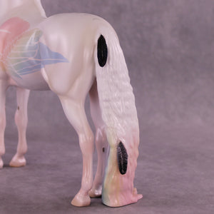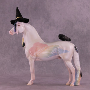 Corvus Master is a Pernellen piece, created to celebrate the Corvus series from 2024. Corvus Master is a morgan stallion with an extra long customized mane, tail, and forelock. He features a white raven inspired color scheme, and the rainbow is to symbolize the colorful rainbows of the corvus family (yes they are rainbow colored, the human eye just can't see it). Corvus Master had some beautiful feathers customized into his mane and tail, total 5, each of them are painted in different corvid colors, to celebrate last year's releases. He comes with a customized hat and a hand-sculpted one-of-a-kind polymer clay crow by Pernille!