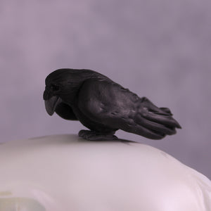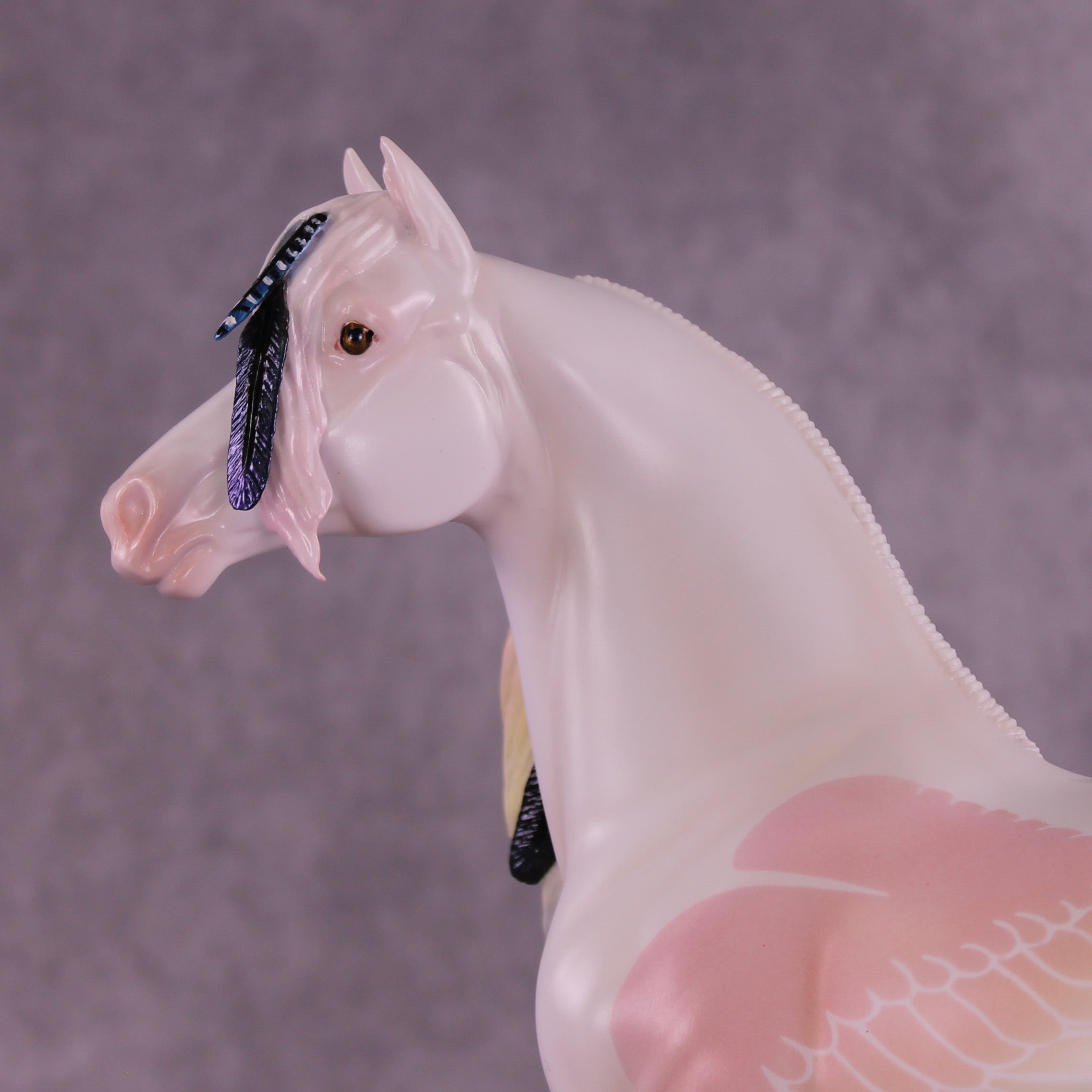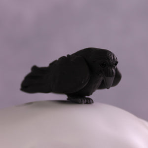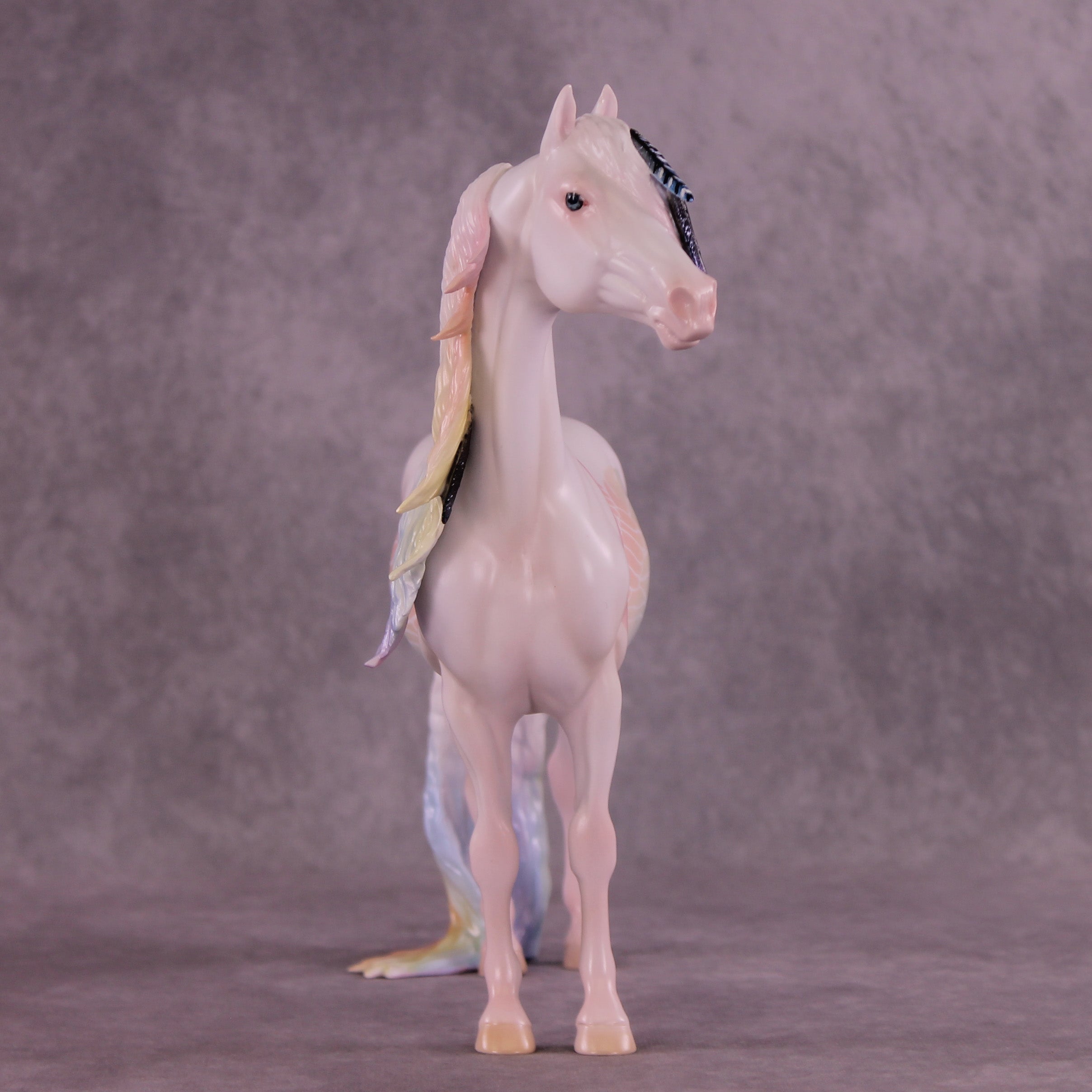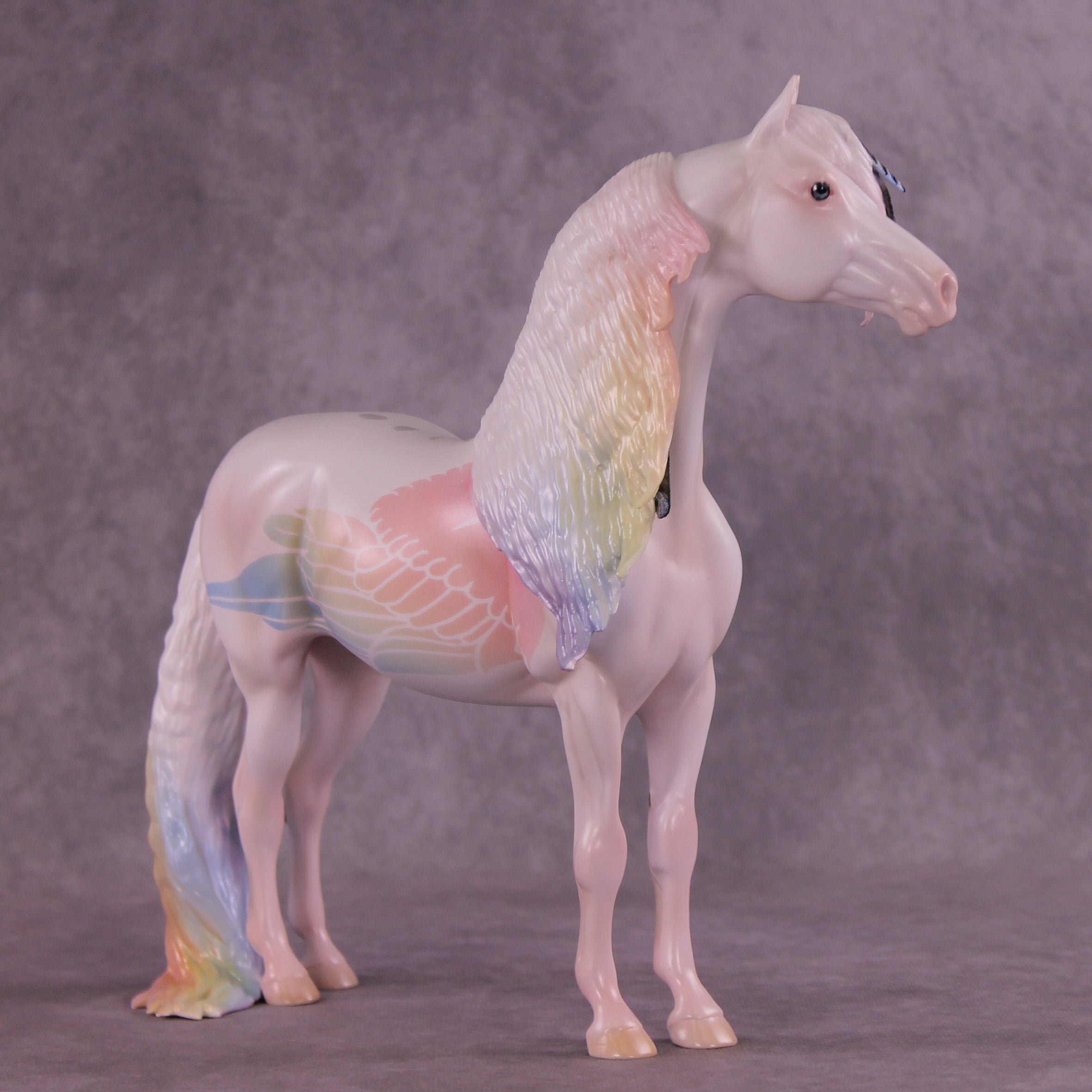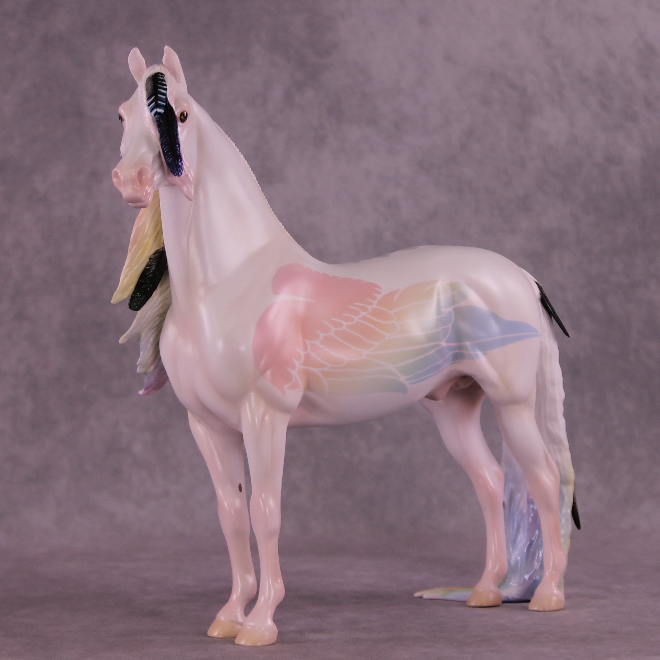 Corvus Master is a Pernellen piece, created to celebrate the Corvus series from 2024. Corvus Master is a morgan stallion with an extra long customized mane, tail, and forelock. He features a white raven inspired color scheme, and the rainbow is to symbolize the colorful rainbows of the corvus family (yes they are rainbow colored, the human eye just can't see it). Corvus Master had some beautiful feathers customized into his mane and tail, total 5, each of them are painted in different corvid colors, to celebrate last year's releases. He comes with a customized hat and a hand-sculpted one-of-a-kind polymer clay crow by Pernille!