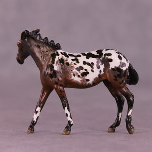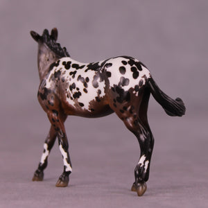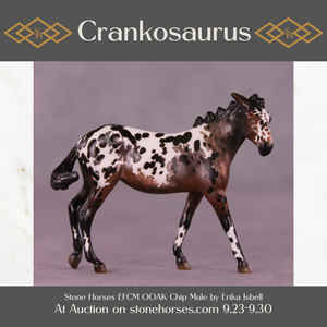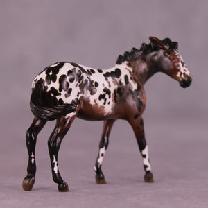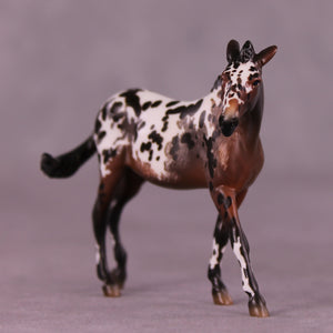 This grumpy little mare was one of the first pieces Erika worked on when she arrived here, and she came out SO wonderfully! Erika gave her a dramatically turned head and neck with pinned ears and a whole new spine-clipped standing up mane, along with a grumpy swishing tail. She is then painted to a gloriously detailed bay roan mule appaloosa with a combination of hand painted spotting, etching, and lacy detailing that makes this piece stand out for all the right reasons.