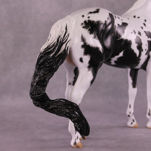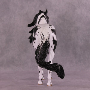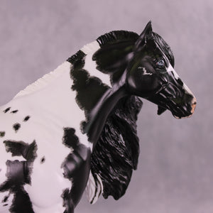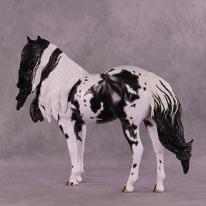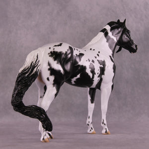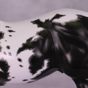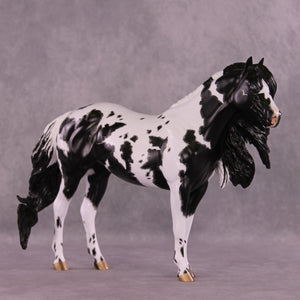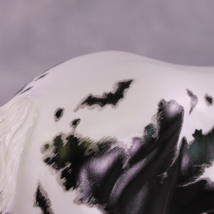 This piece is ABSURD in the best ways. Carissa has been doing insanely cool things with our Ideal Stock Horse mold, and we are so pleased to reveal this piece – customized AND painted by the talented Carissa Mathews! She gave our Ideal Stock Horse a ne head and neck position, tweaked ears, a hugely heavy mane and forelock with loads of tendril detailing, and an extra long new tail with gentle swishing movement. She then painted him to a gorgeously detailed black and white pinto with tons of mapped and etched detailing, and the cherry on top are all the hidden bat designs in his pinto pattern. You have to look twice, but once you see them, it’s amazing how she wove them into his pattern!