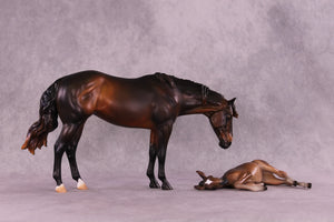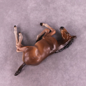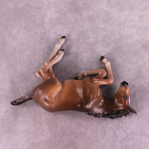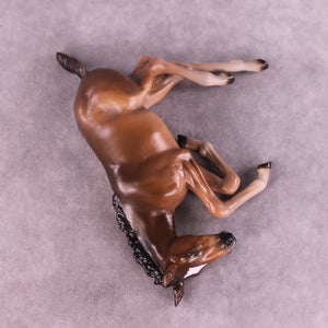 Erika did an outstanding job extreme customizing this piece into an accurate laying down foal, adjusting every part of this sculpture to turn her into a correctly snoozing foal. She is flattened out on her down side, all legs show gravity’s effects as they nestle together, and her eyes are sweetly closed. Erika painted her to the ideal baby bay with gorgeous shading and a little star, finished in a lovely satin sheen.