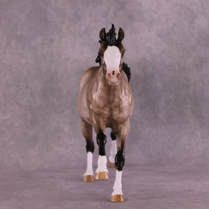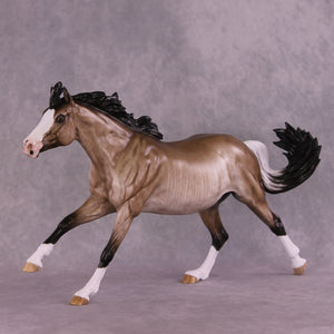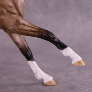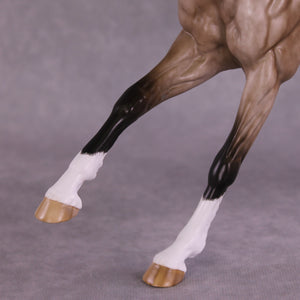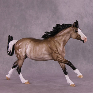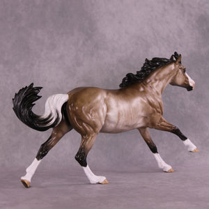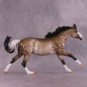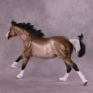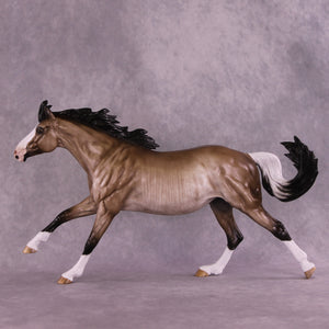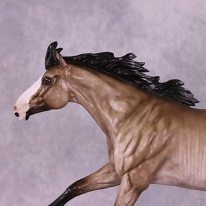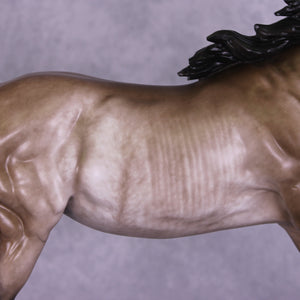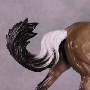 Dame Rouane is our Volo sculpture with both fuzzy ears forward, her loose mane with flying forelock, and swishing tail. Sheryl painted her to a stunning bay roan with loads of her trademark ticking and detailing across her barrel. In addition, she has etched face markings, socks, and added kissy spots provide extra charm. This piece is at auction from 6 pm on August 26th through the afternoon of Tuesday September 2nd. Additional finish options are available on this model.