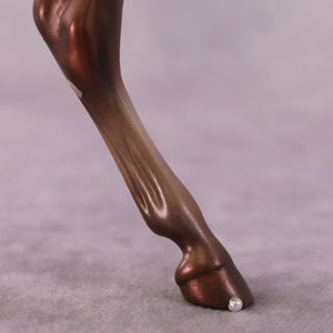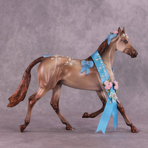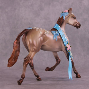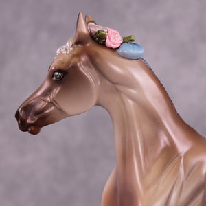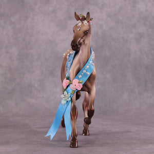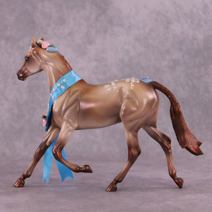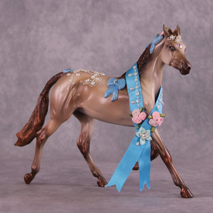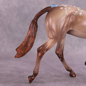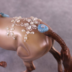 Daphne is a lovely part of Renee’s collection of Regency inspired pieces! Carissa gave her a perfectly appropriate running braid in her mane, plus a sleek braided tail, both with extra sculpted-on bows and decorations. Renee painted her to a lovely shaded chestnut with beautiful blue eyes and permanently attached pearl embellishments, along with a handmade removable sash to complete her look.