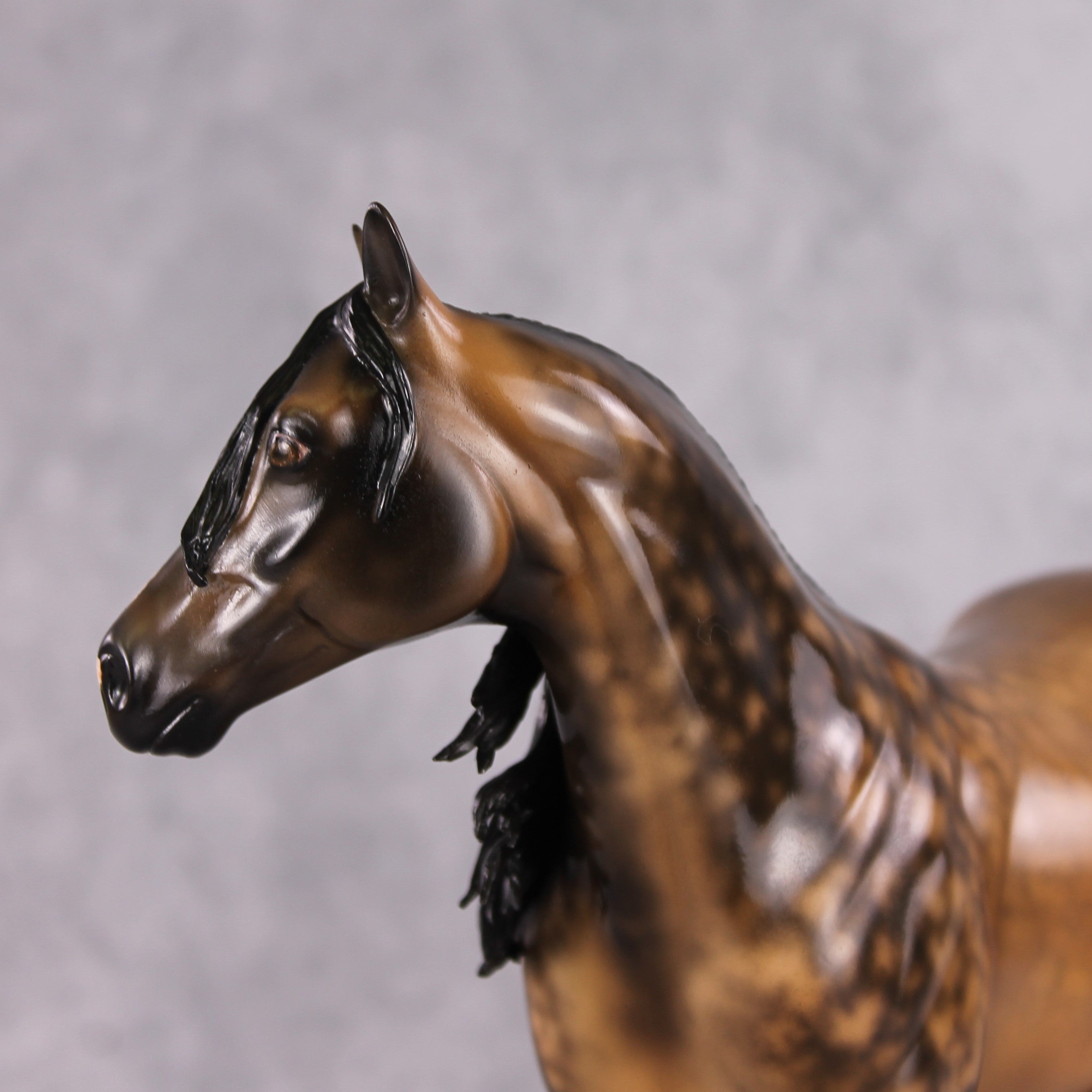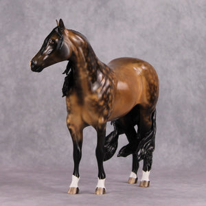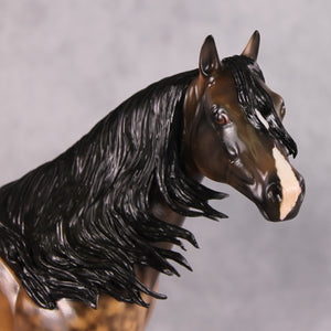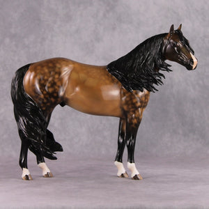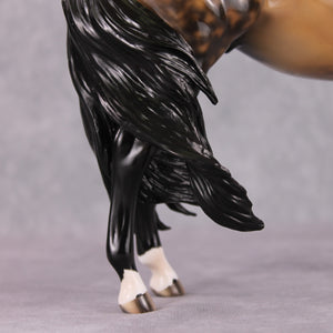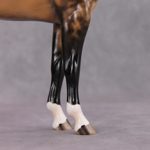 • Painted to a dramatic dappled buckskin with four etched socks, ermines, hoof stripes, and shaded face marking