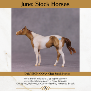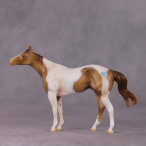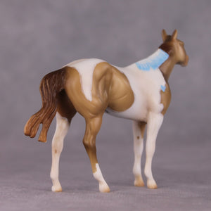“Dirk” features a really fun and irreverent lifted head and neck customization with a whole new mane, forelock, and tail by Amanda, and then she painted him to a stunning champagne tobiano pinto with super fun hand painted blue detailing – he’s not a decorator, he’s owned by a human who has a sense of whimsey and some animal-safe paint. Truly a one of a kind piece!