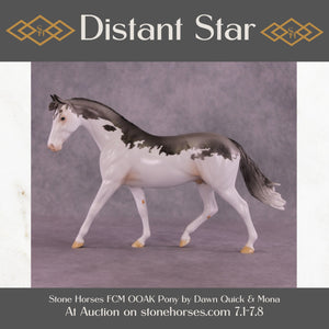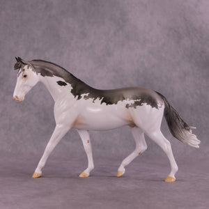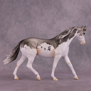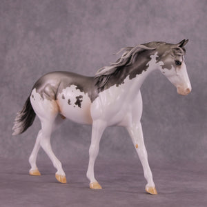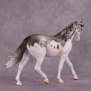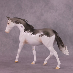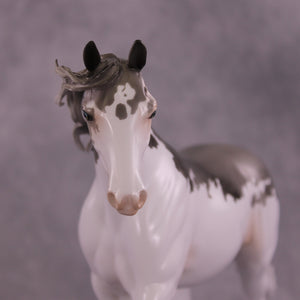 “Distant Star” begins with our adorable Pony mold, and Mona gave him a lovely customized mane, tail, and forelock with extra tendril detailing, plus a sassy head turn. Dawn then painted him to a super eye catching grey maximum splash pinto with tons of detailing in his markings and shaded whites.