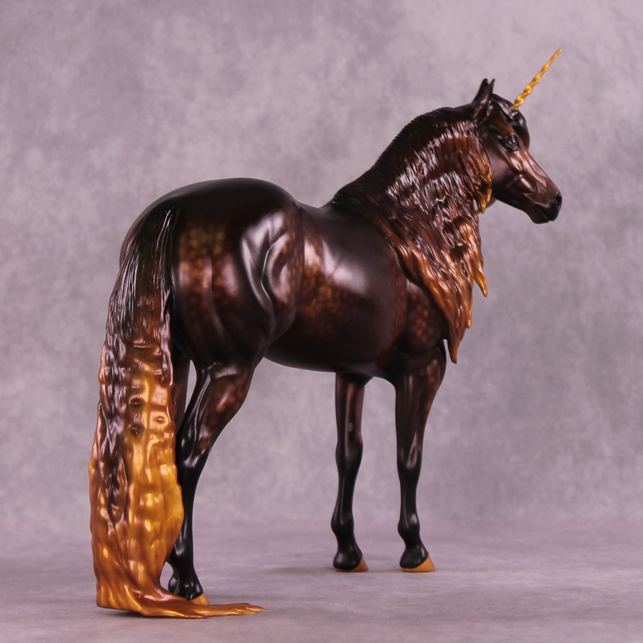 We just love when Sheryl paints a fantasy piece! She worked with our Ideal Stock Horse here, customized with our extra long puddling tail, extra long wavy mane and forelock, plus a unicorn horn. She painted him to an absolutely STUNNING golden copper dappled dark decorator chestnut, with golden hooves, and shimmering gold and copper shining through his coat – especially in his dappling! He is ethereal beauty on the hoof, and whoever is lucky enough to bring him home will see him come alive in person.