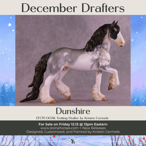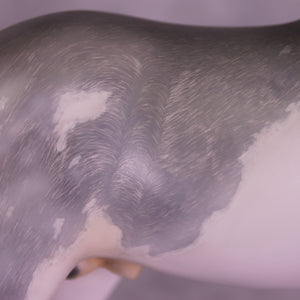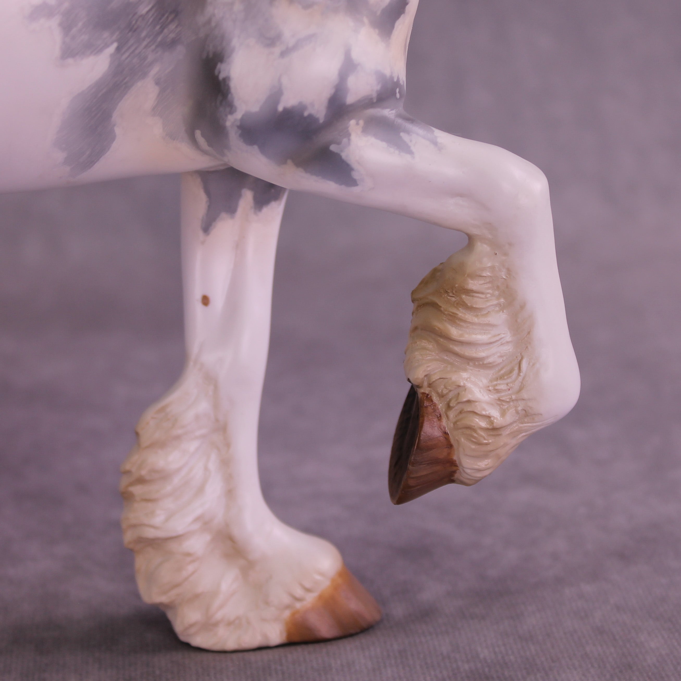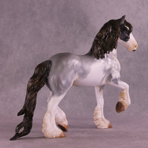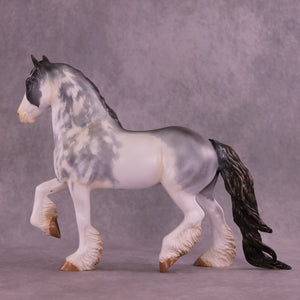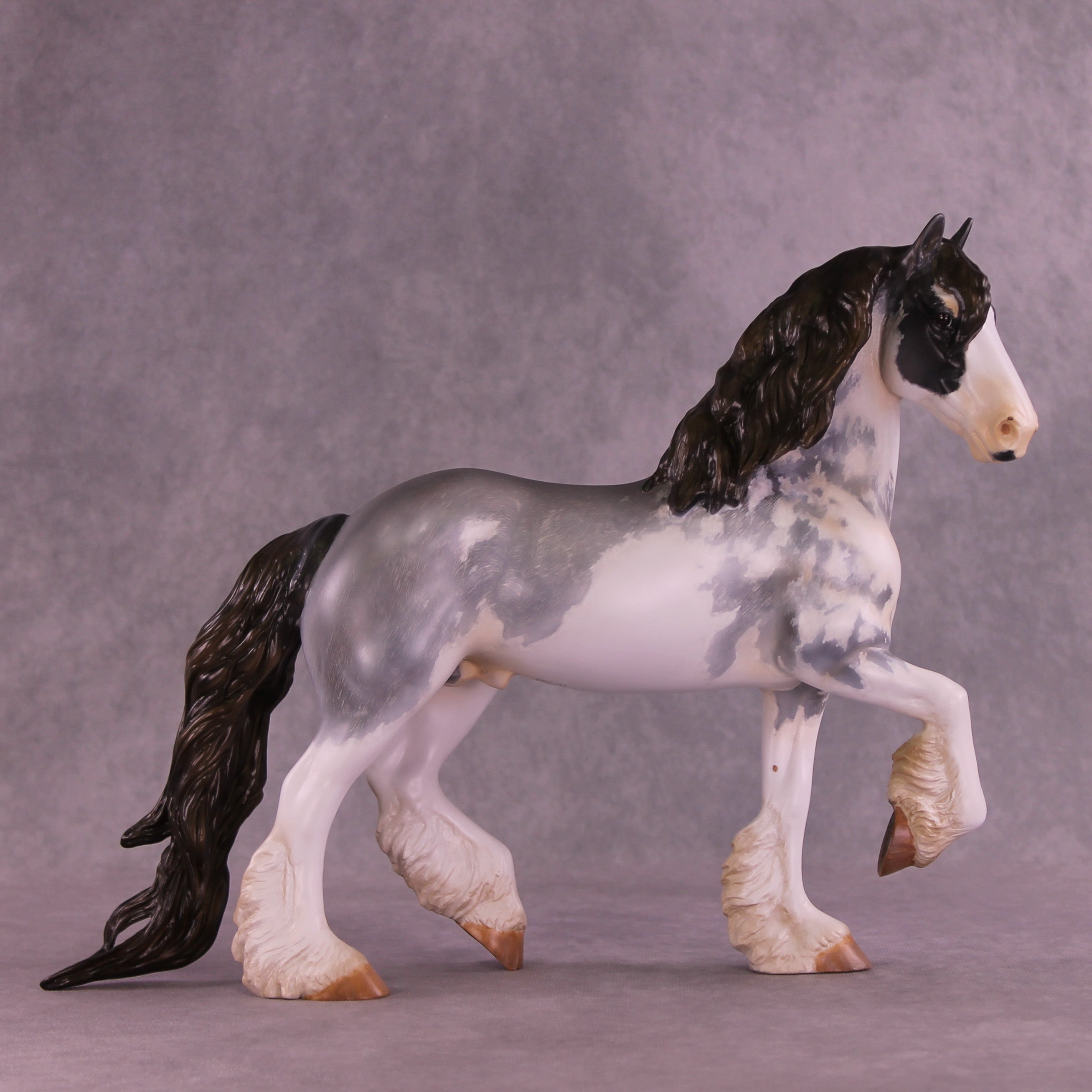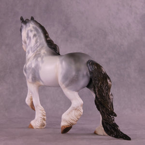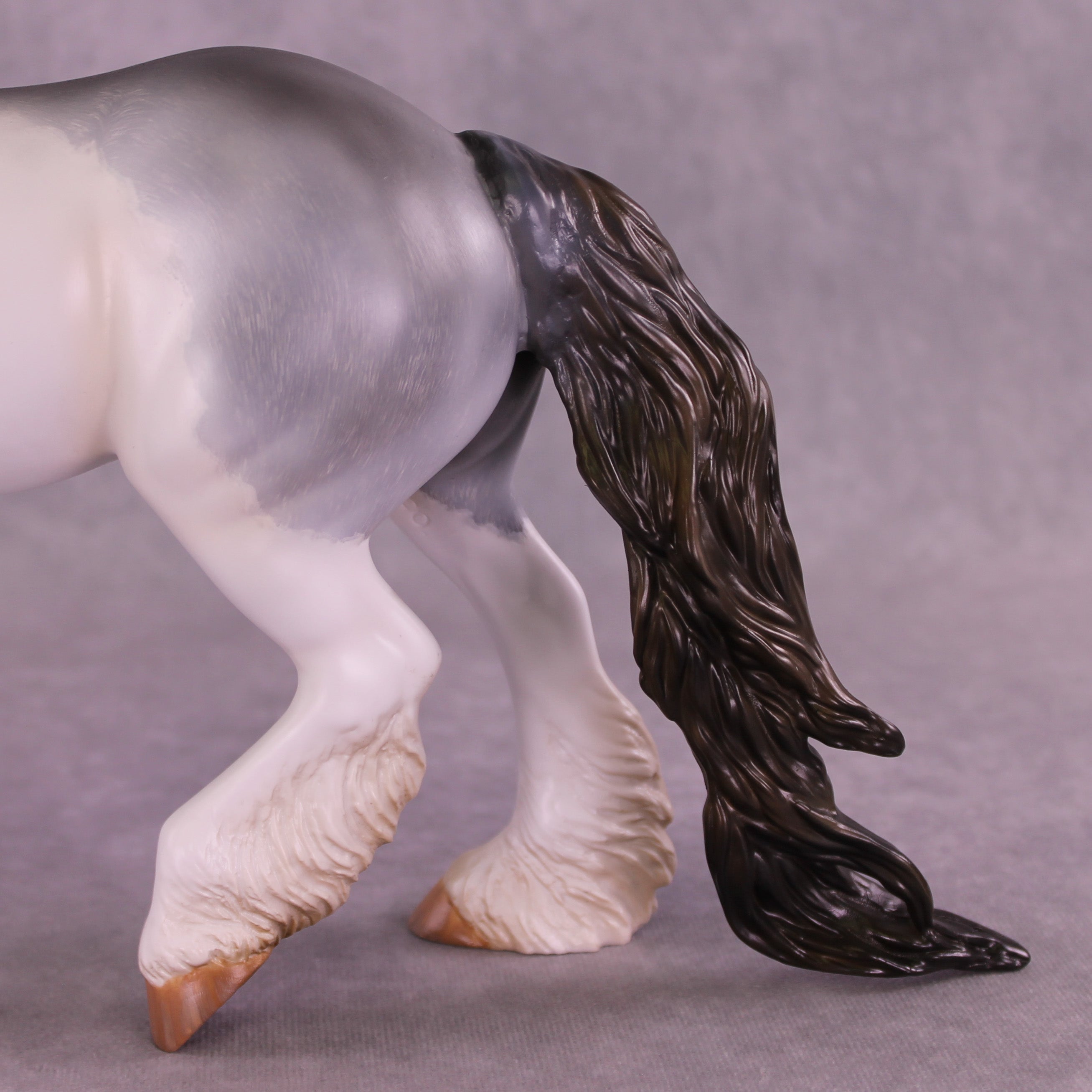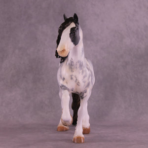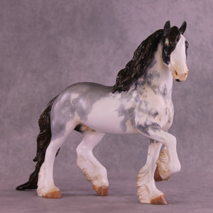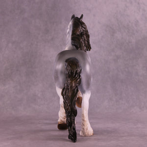 Dunshire begins on our Trotting Drafter, and Kristen gave him a makeover! She turned his head, customized him into a stallion, gave him a new customized mane and tail, and repositioned his front leg to be in a more relaxed trot. She then painted him to a mind blowingly detailed black sabino (the type that looks grey) with full etching following hair growth patterns and hand painted mapping through the extremely complex design. His whites are painted as well for a chalky look, he has shading in his feather to show his life lived outside, and no detail is overlooked on this piece! He comes in a lovely matte finish with no finish changes offered.