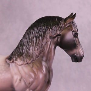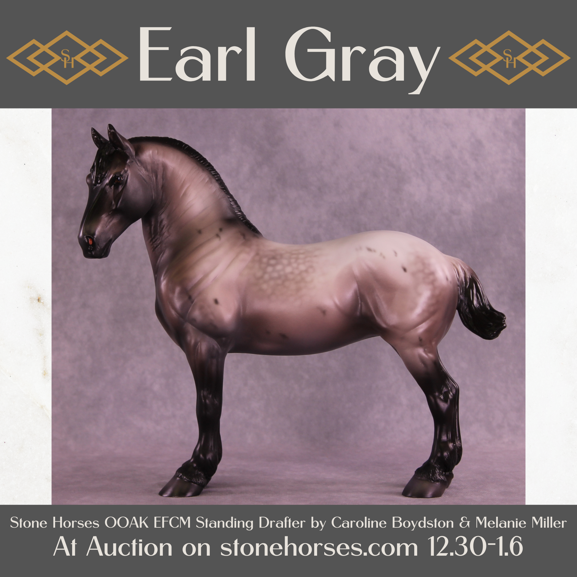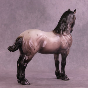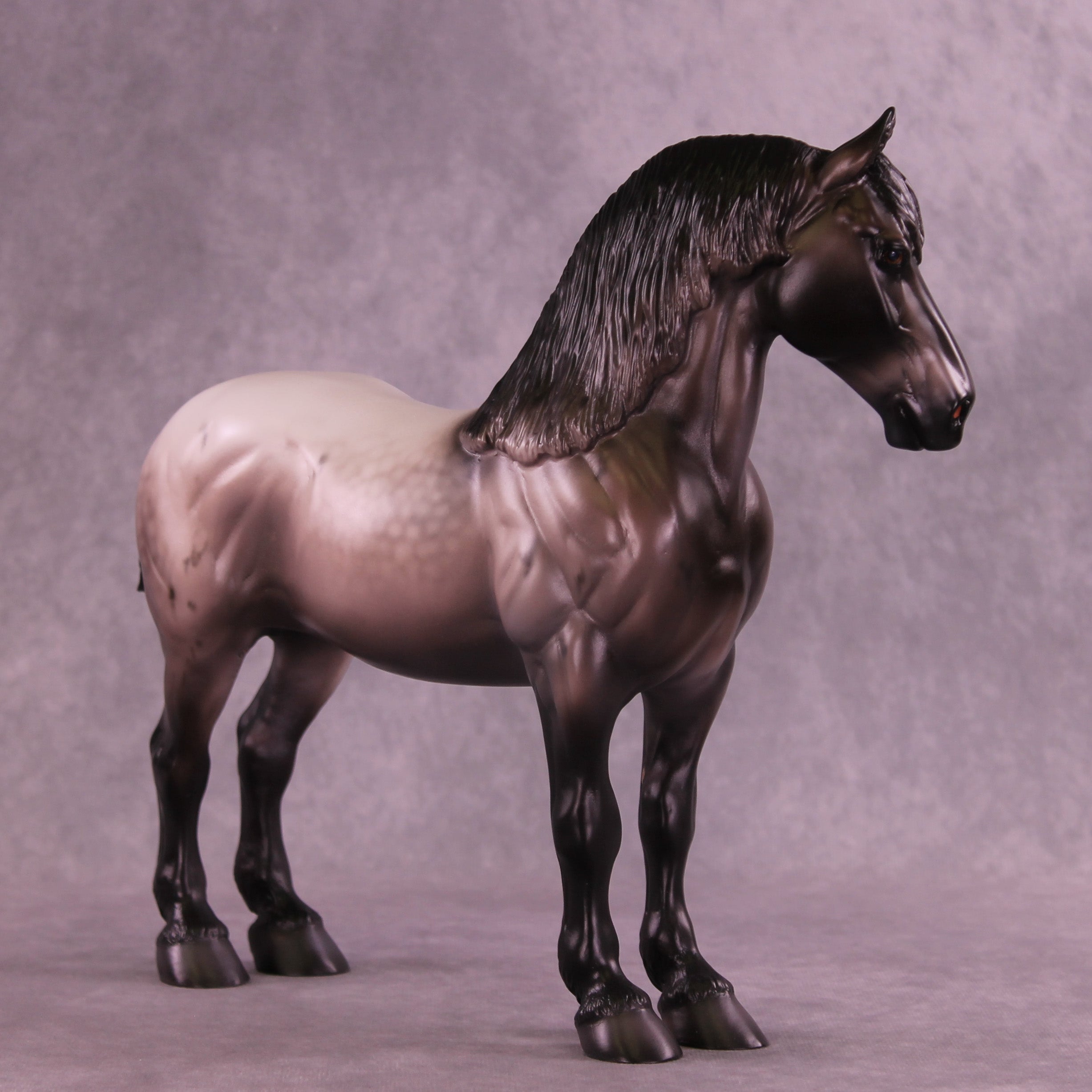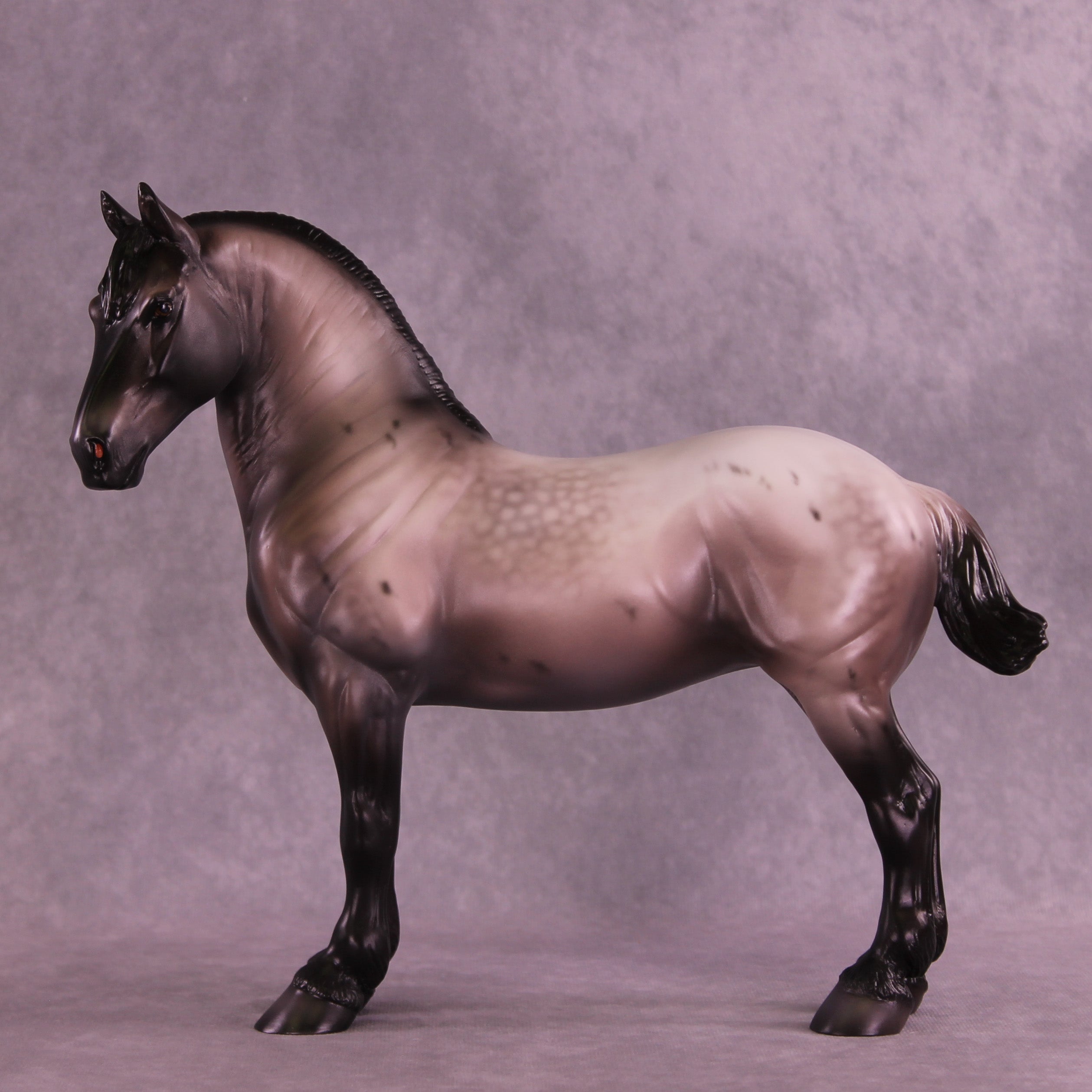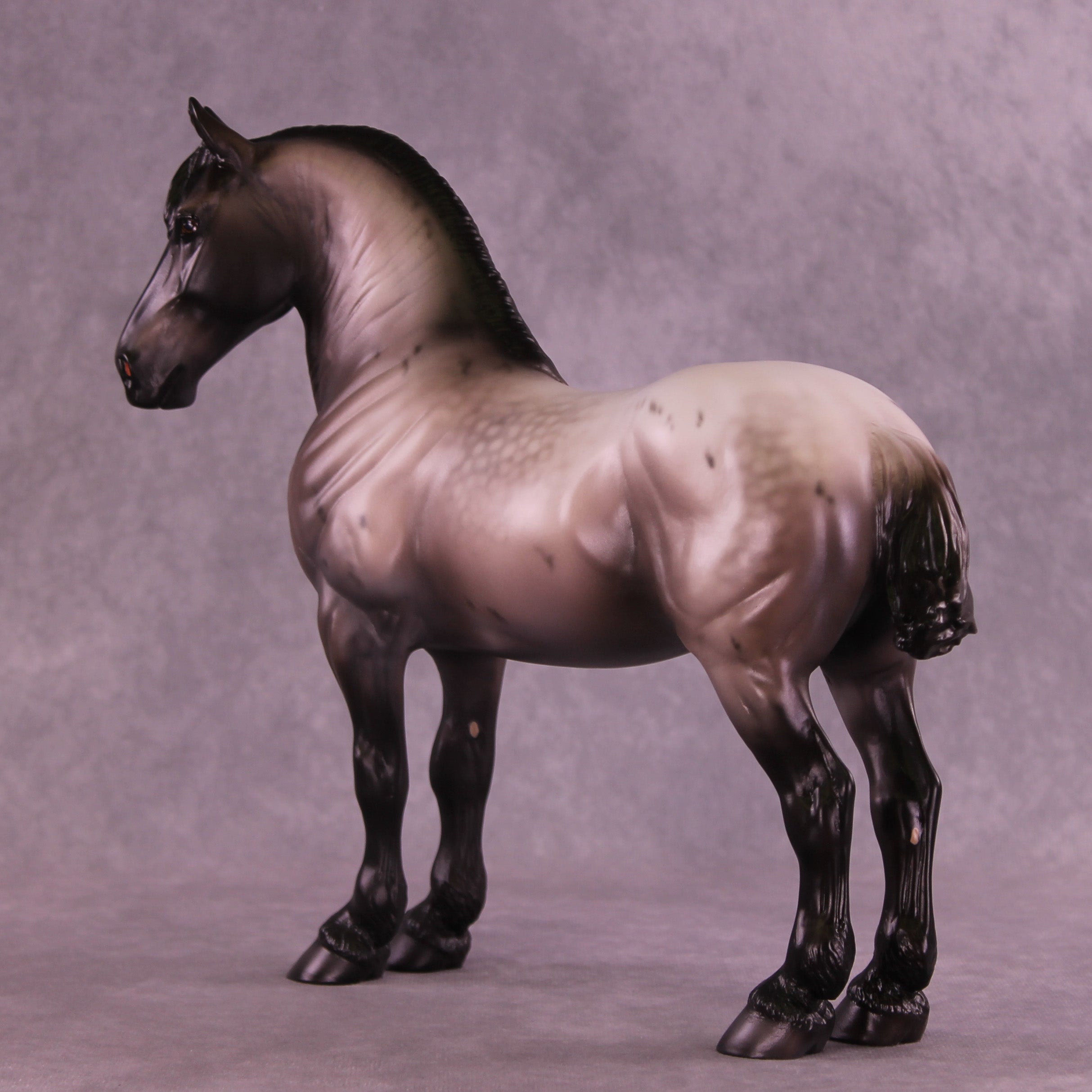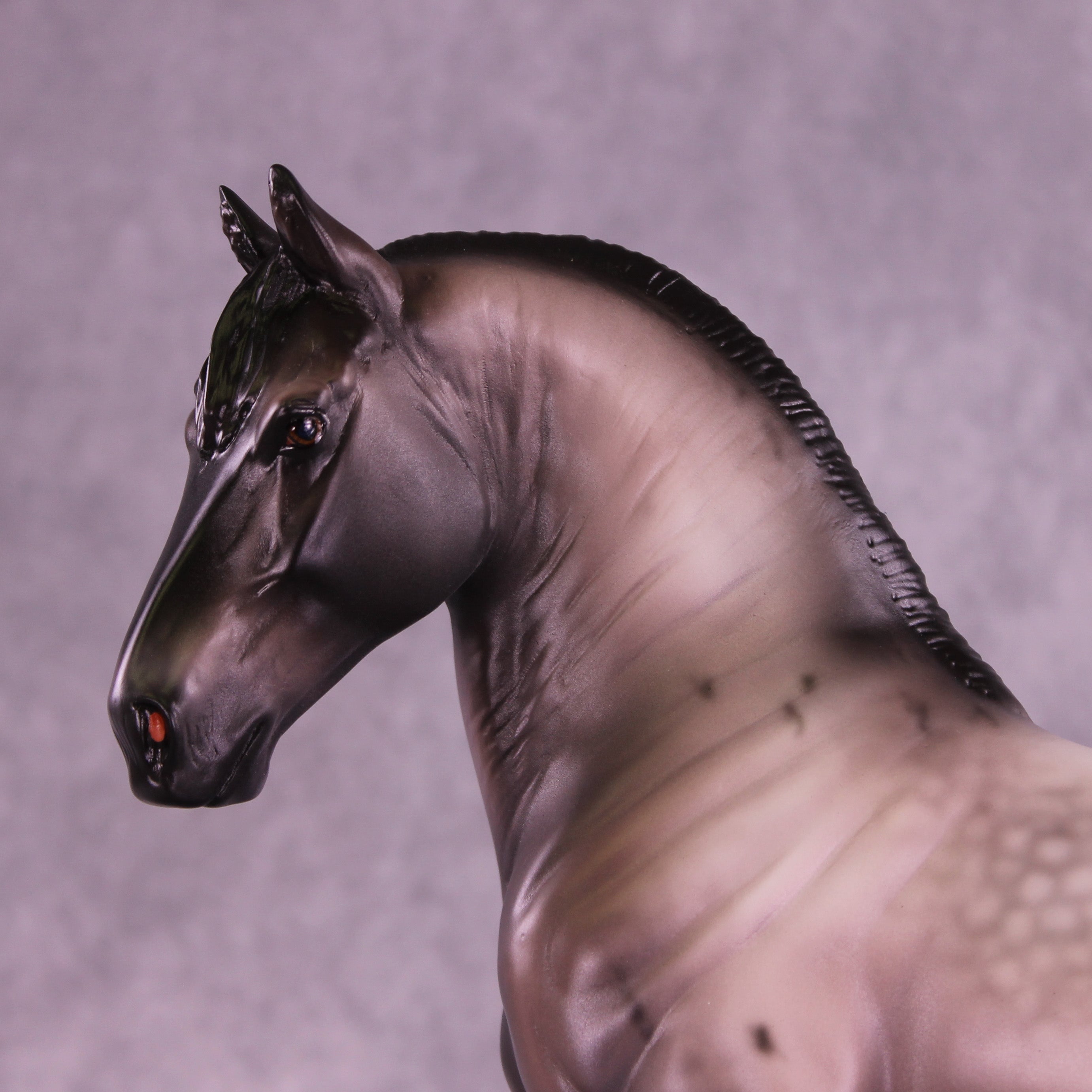 Everyone’s favorite tea in model horse form! Earl Gray is an elegant lady with her dappled blue roan coat, complete with corn spots and stunning shading throughout. Caroline spared no detail in making her really shine. Mel Miller worked her magic by giving her a feminine turned and tucked head, a new mane and forelock, fuzzy ears, and a short, playfully swished tail. Earl Gray would make an excellent addition to your collection and is available in all finish options.